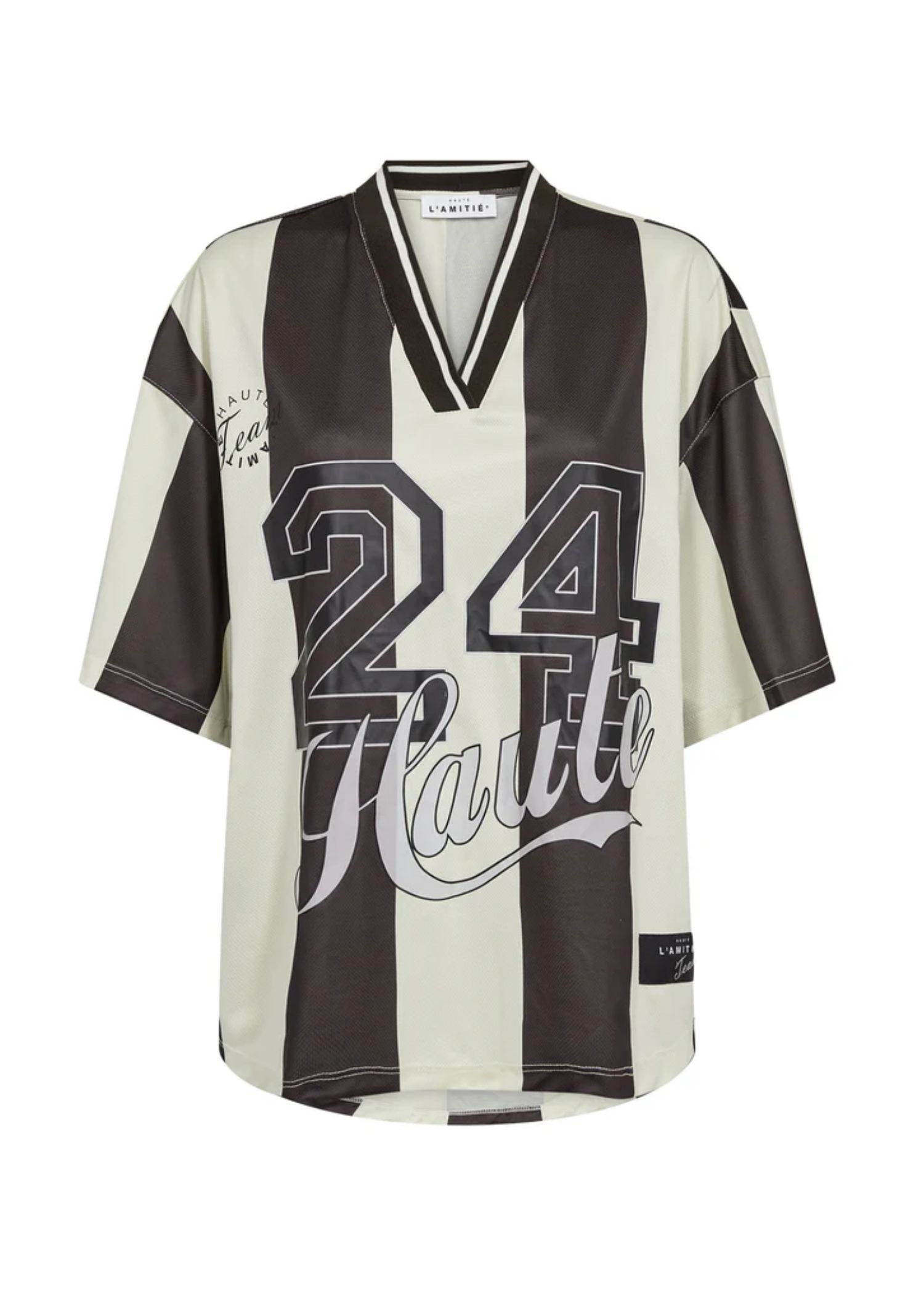 Cool brun/off white stribet football tee fra haute L'Amitie i en glat let shiny polyesterkvalitet med print både for og bag.