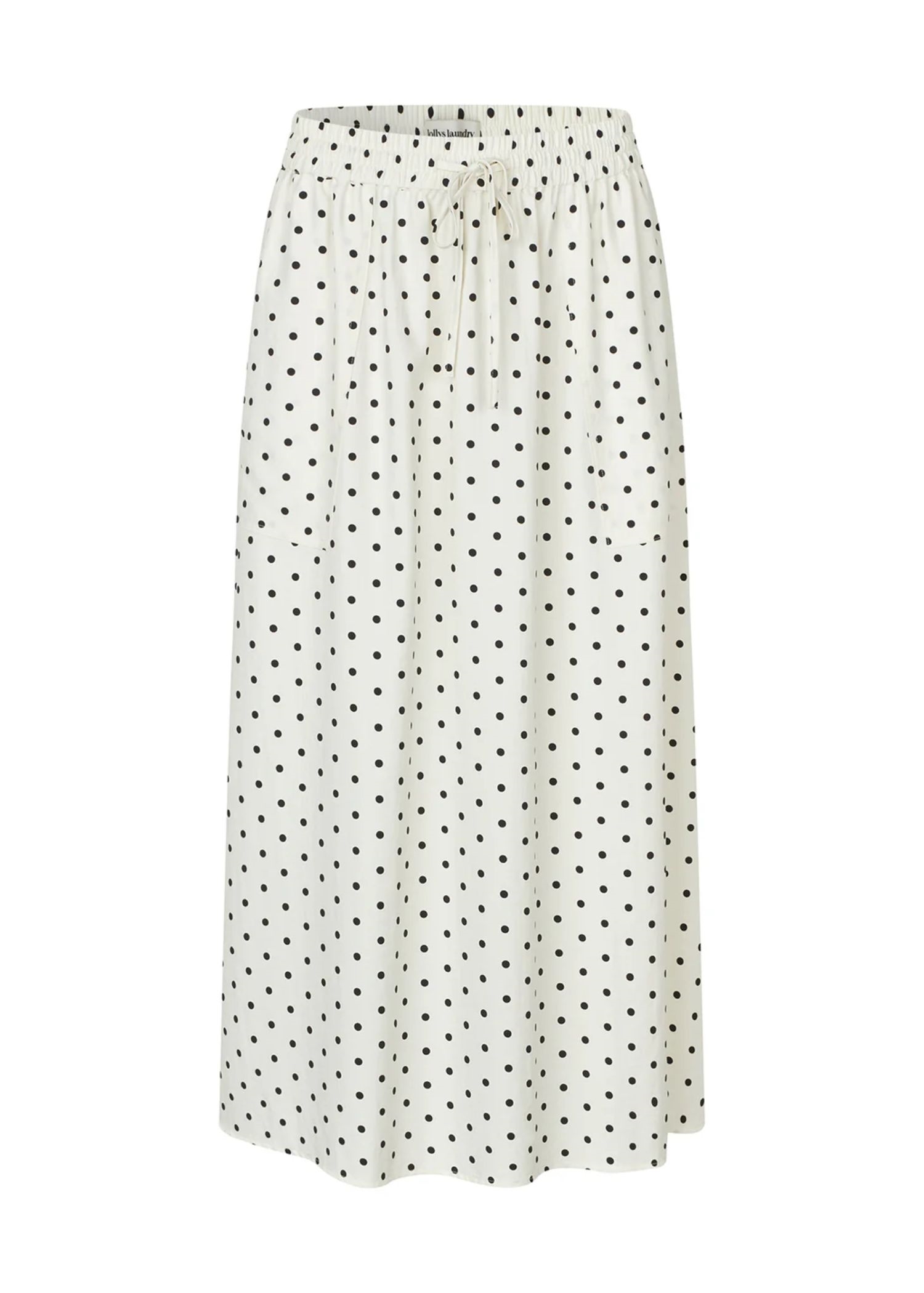 Off white vidde nederdel fra Lollys Laundry i en let polyester kvalitet med sorte dots, elastik i taljen med indvendig snøre, samt lommer i siden.