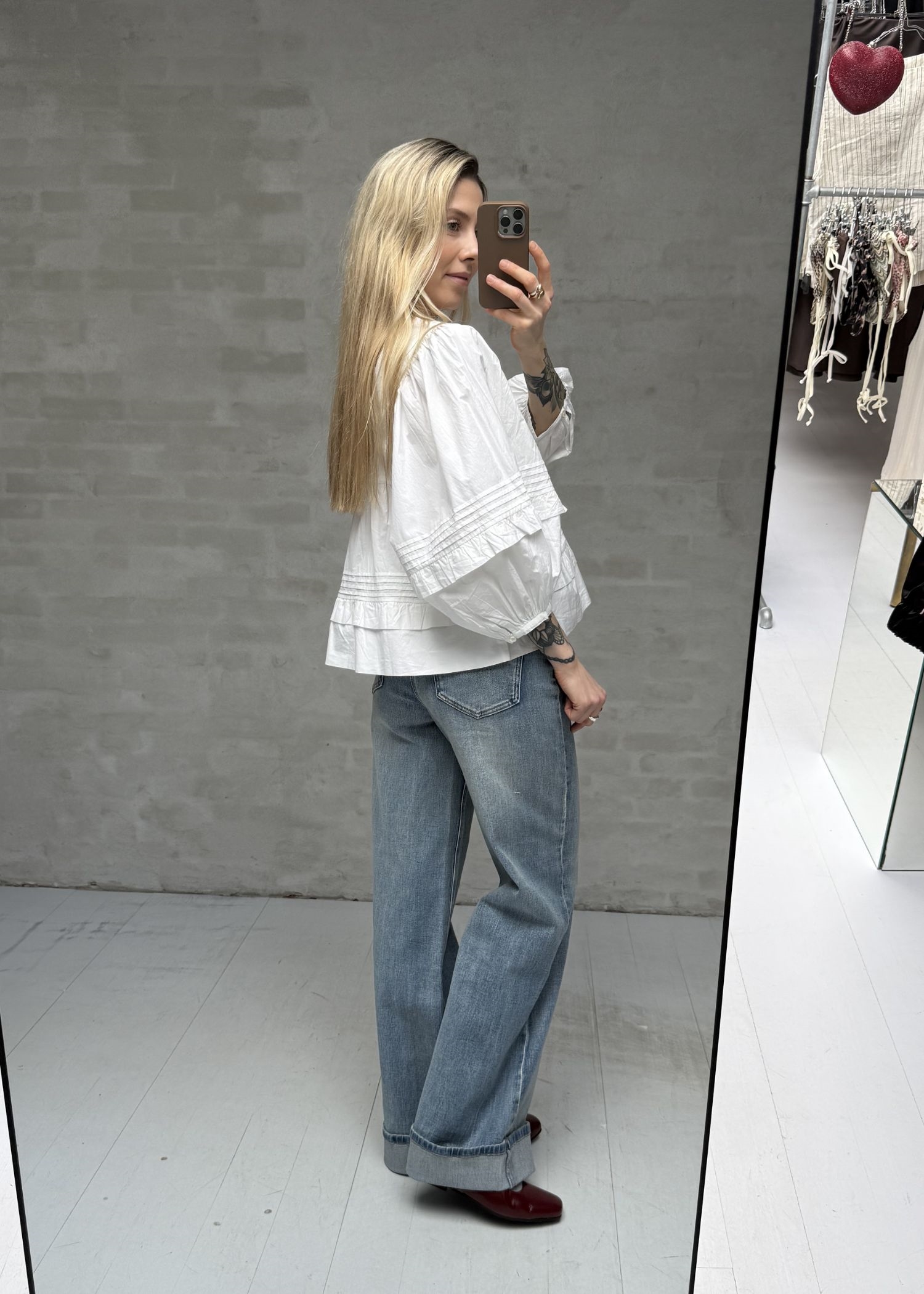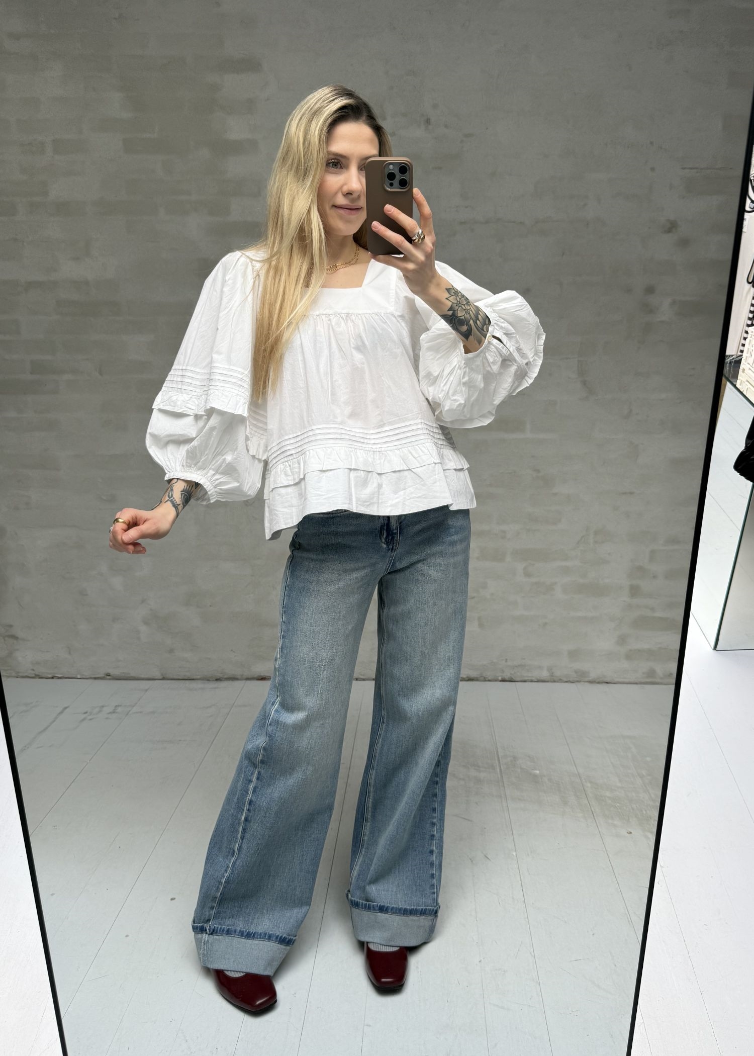 Blusen har firkantet halsudskæring, fine flæsedetaljer, samt markante posede ærmer med knaplukning forneden.