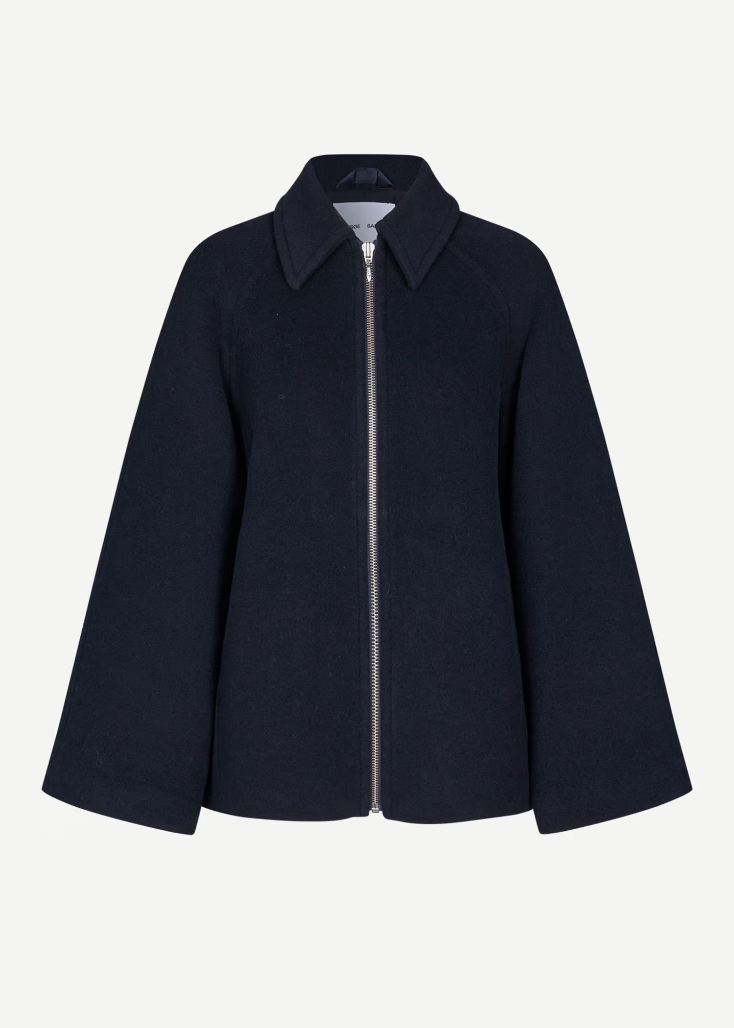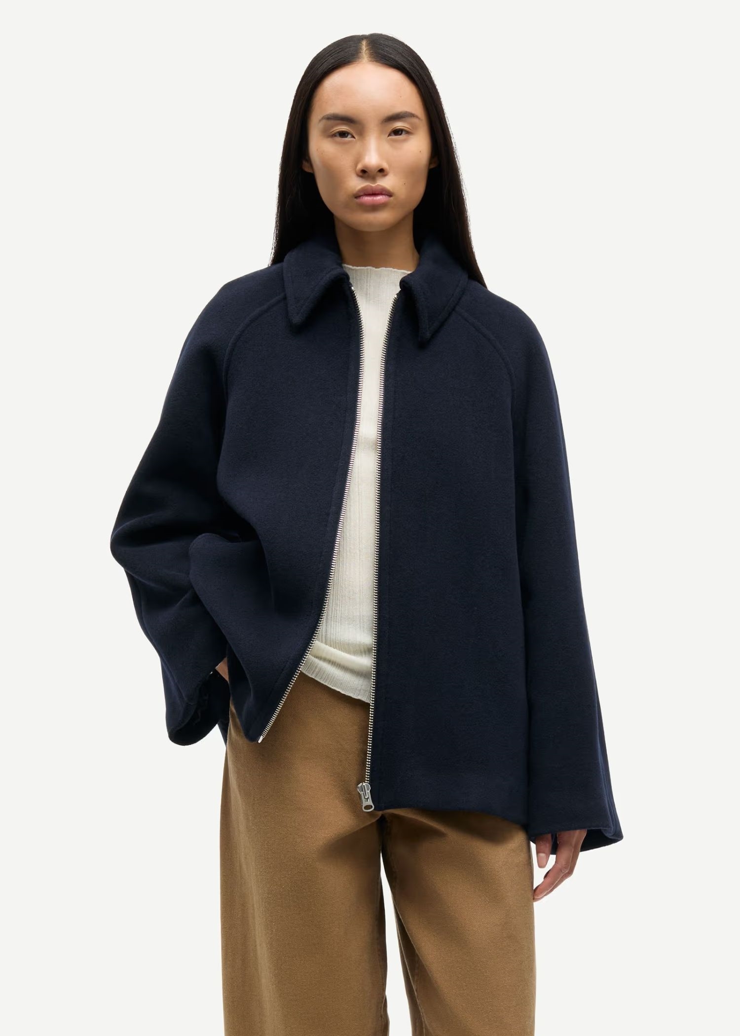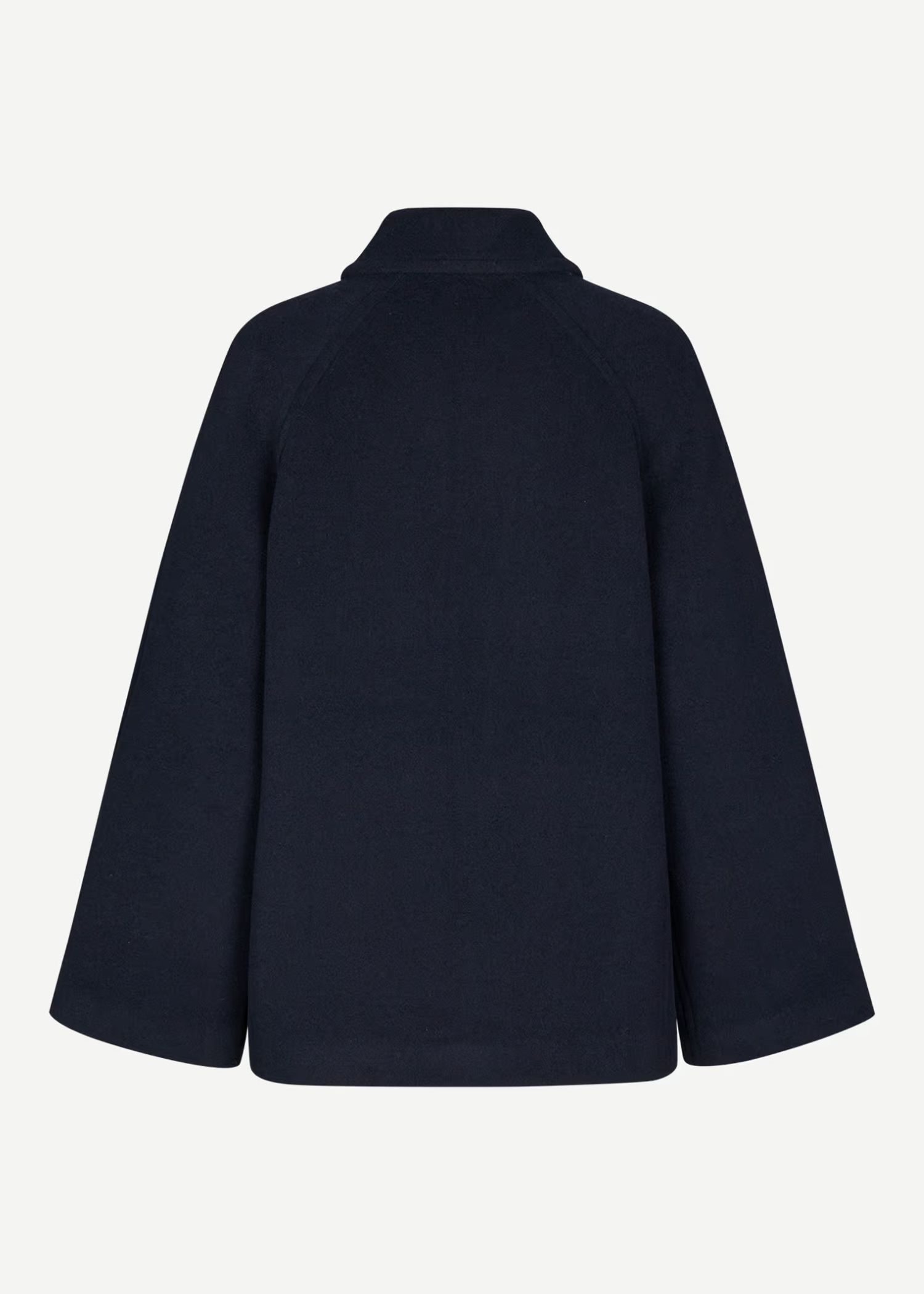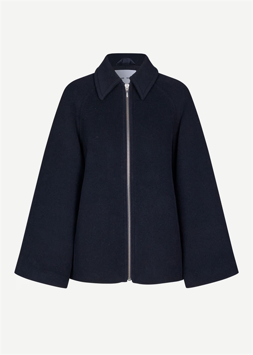 Navy jakke fra Samsøe med løs pasform. Lynlåslukning foran. Sidelommer foran og inderlomme. Vatteret med Meida-isolering. Hovedmaterialet er Manteco MWool®, vævet i Italien af en genanvendt uldblanding.