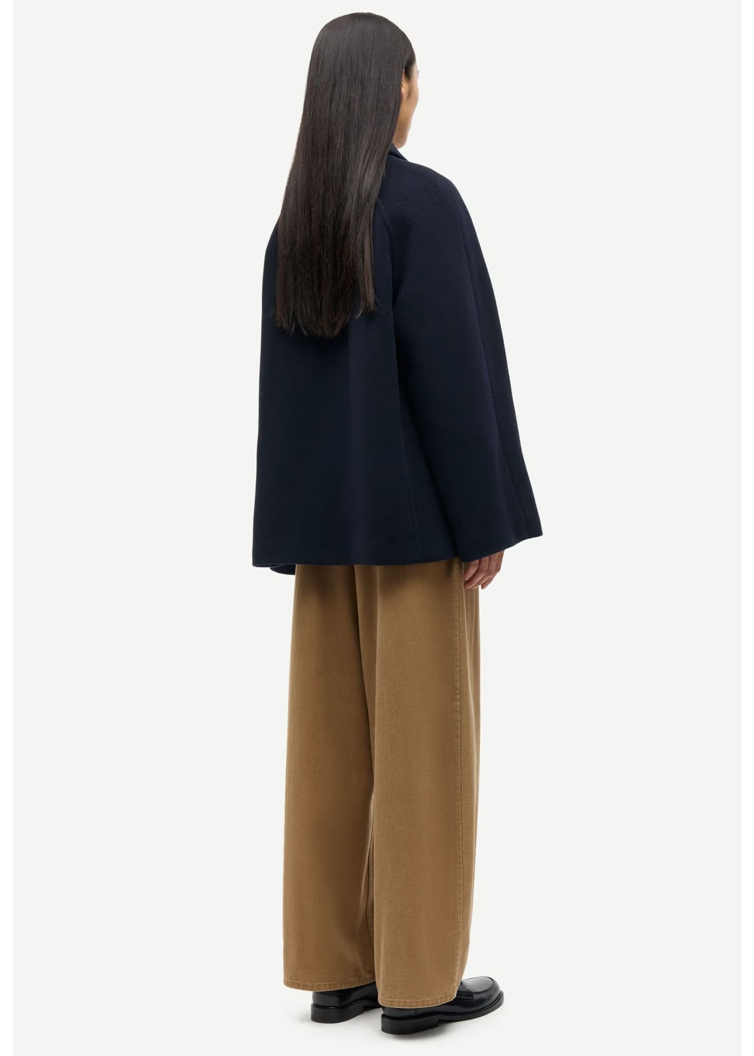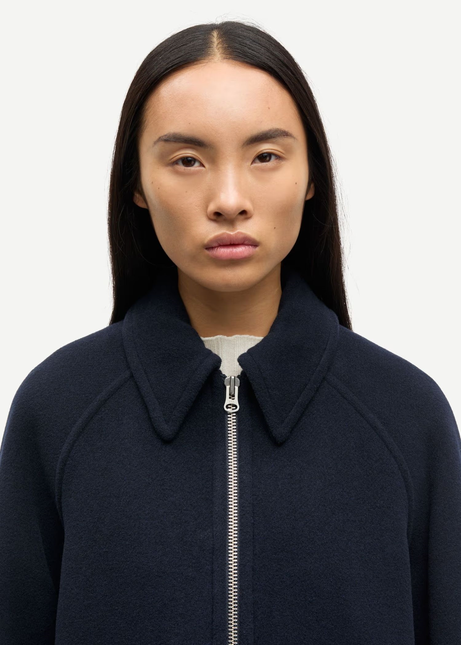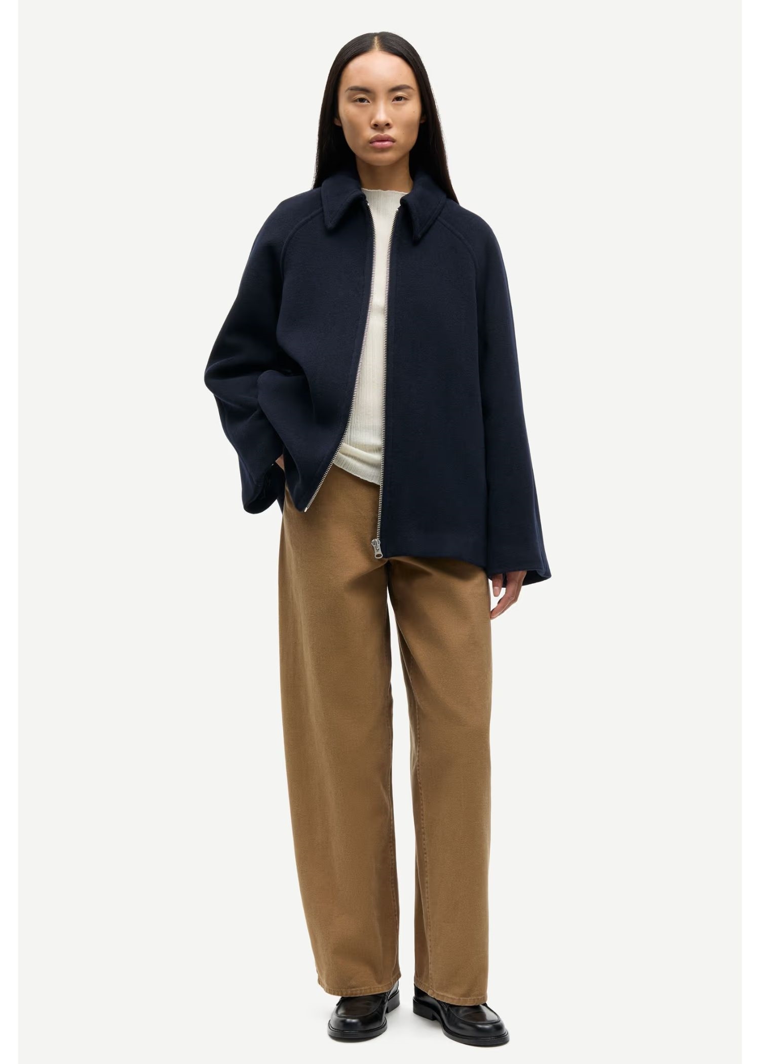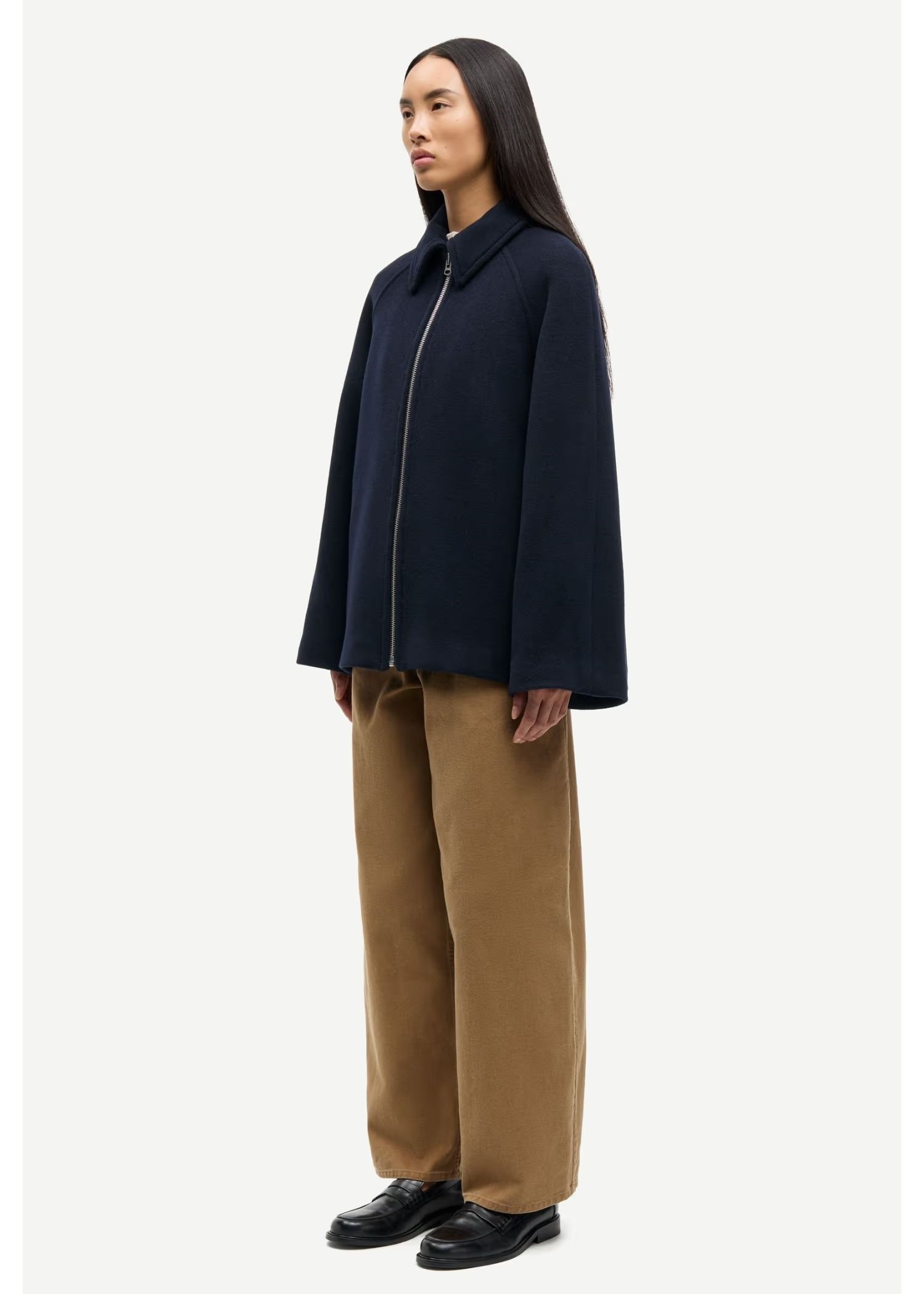 Navy jakke fra Samsøe med løs pasform. Lynlåslukning foran. Sidelommer foran og inderlomme. Vatteret med Meida-isolering. Hovedmaterialet er Manteco MWool®, vævet i Italien af en genanvendt uldblanding.