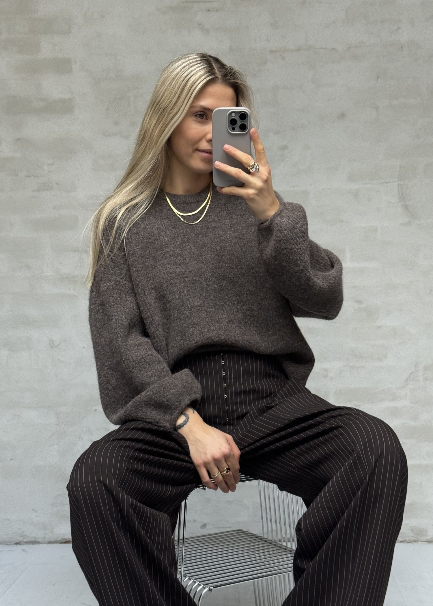 Bryn meleret strik fra Gestuz i en blød blandingskvalitet, med o-hals, samt lange løse ærmer med elastikafslutning.