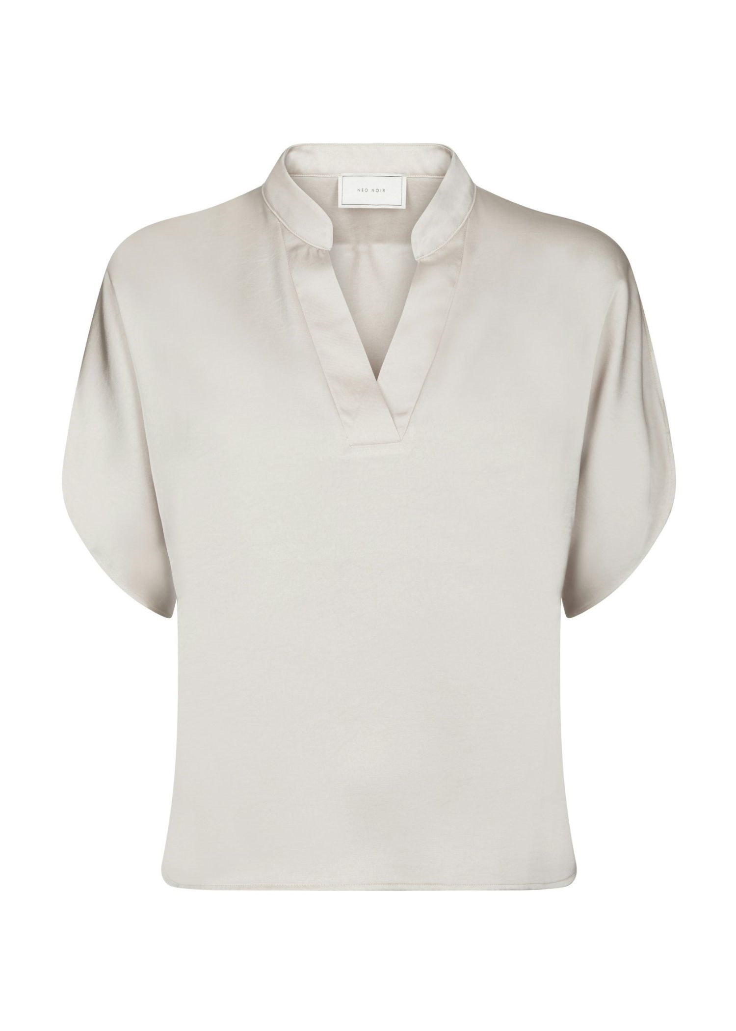 Off White bluse fra Neo Noir i en shiny polyester kvalitet med stretch. Blusen har v-hals, samt korte ærmer med revneåbning.