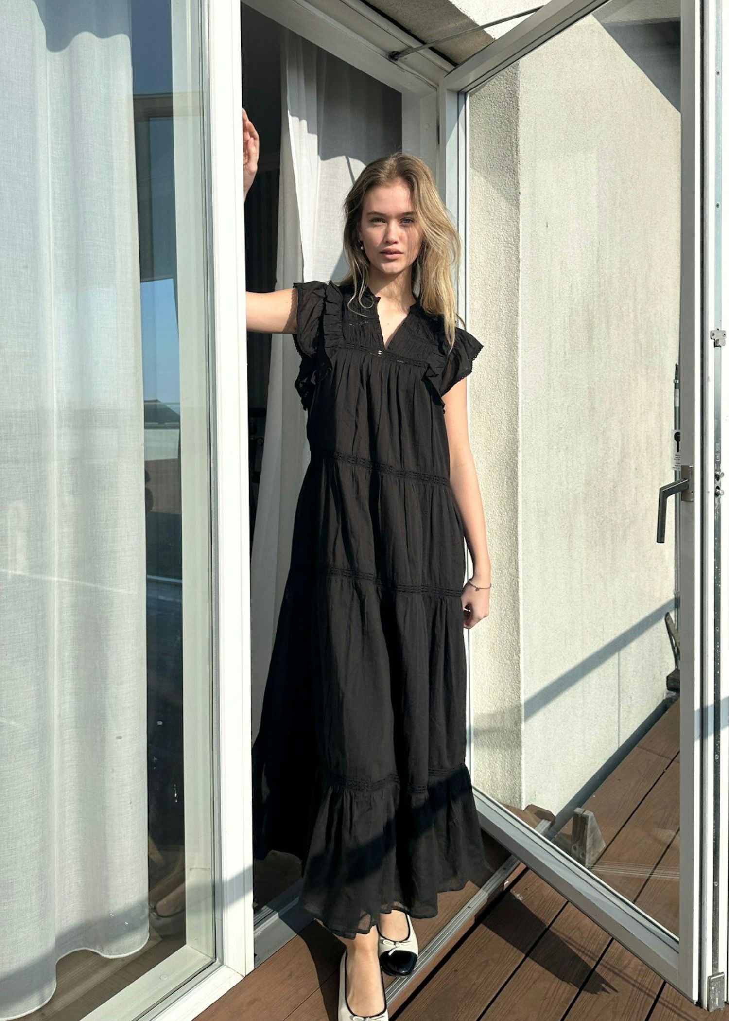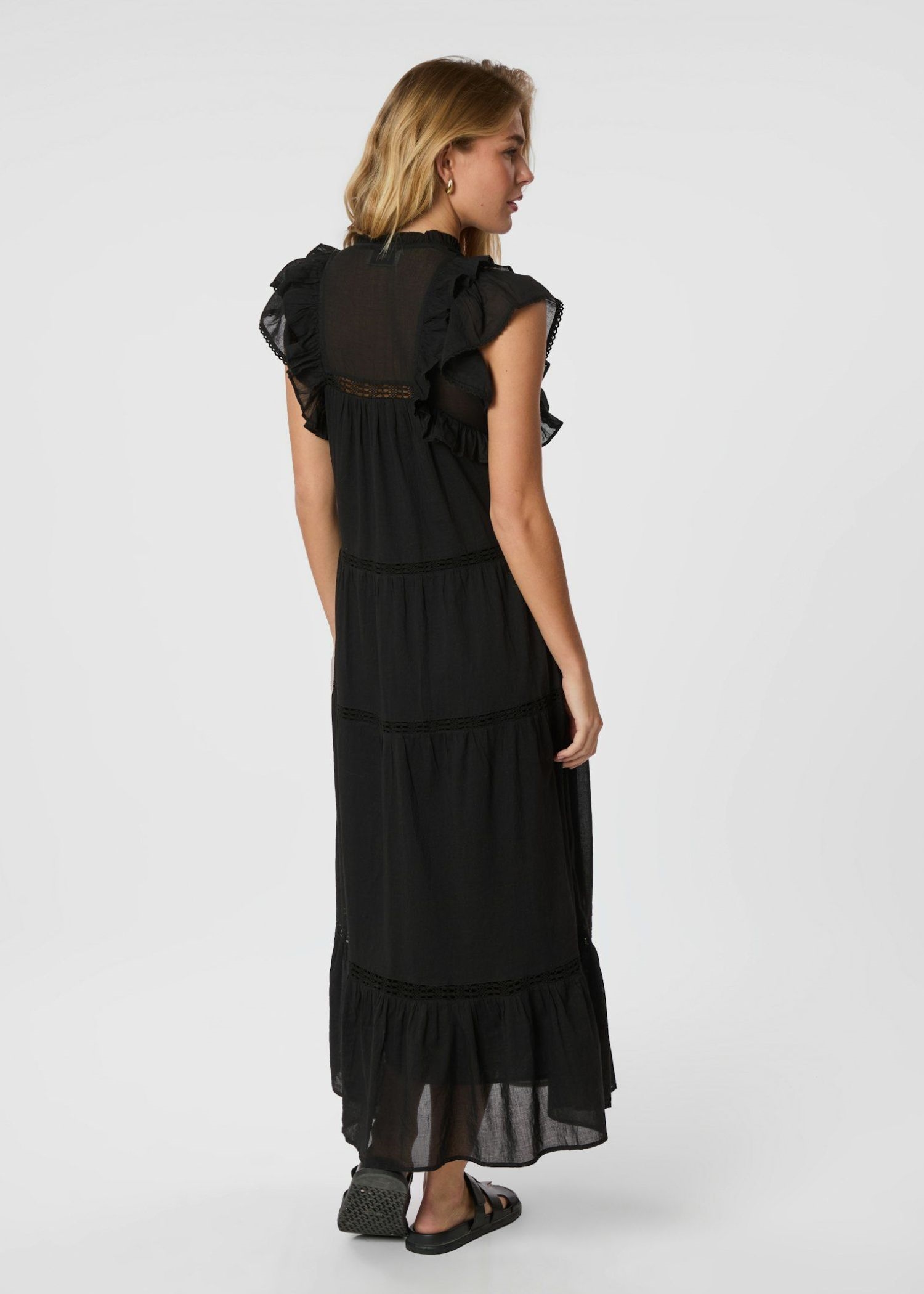 Sort lang kjole fra Neo Noir i en let bomuldskvalitet. Kjolen har foer, flæsekant i halsen med v-udskæring, samt flæser ved skuldre og broderie anglaise detaljer.