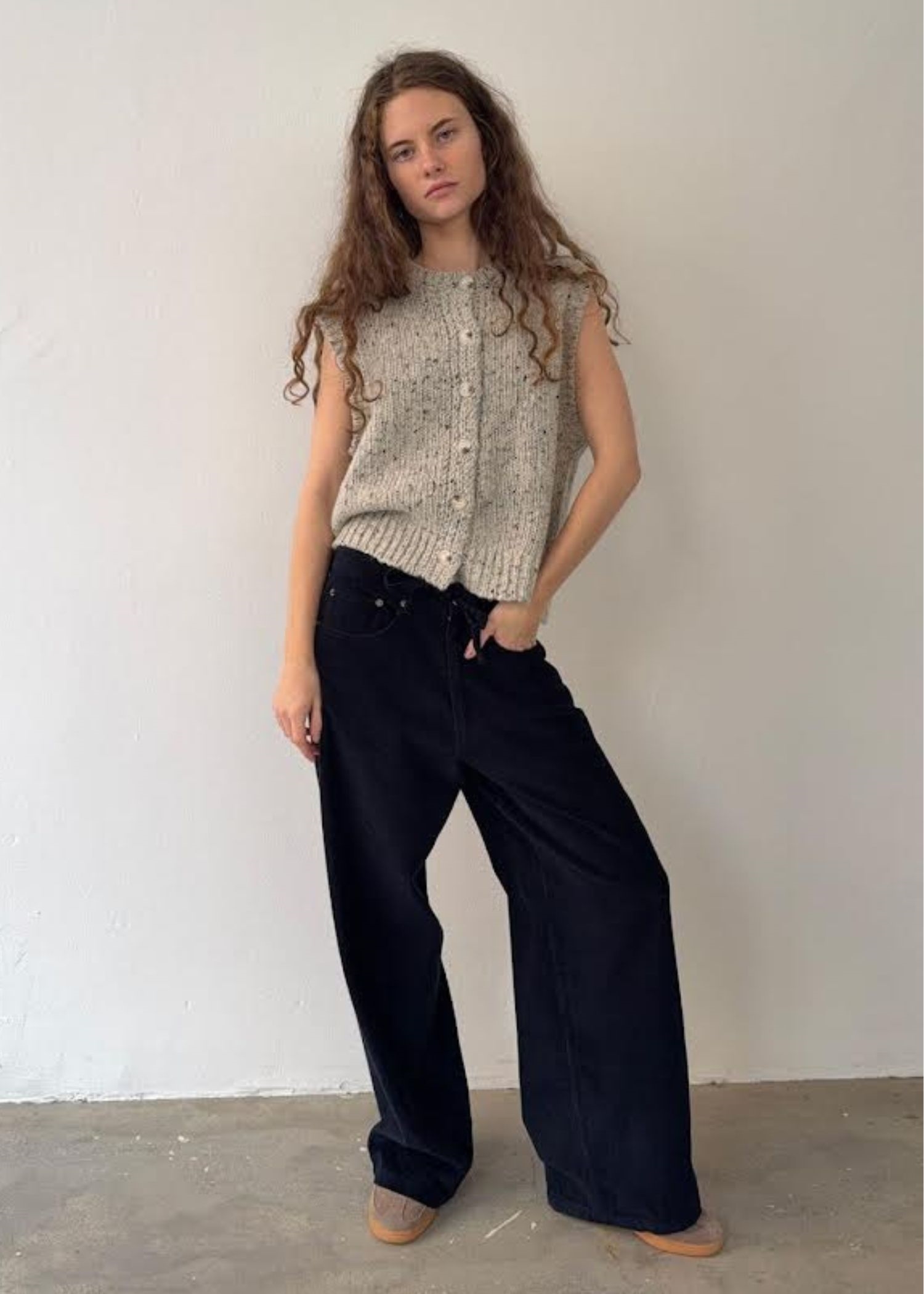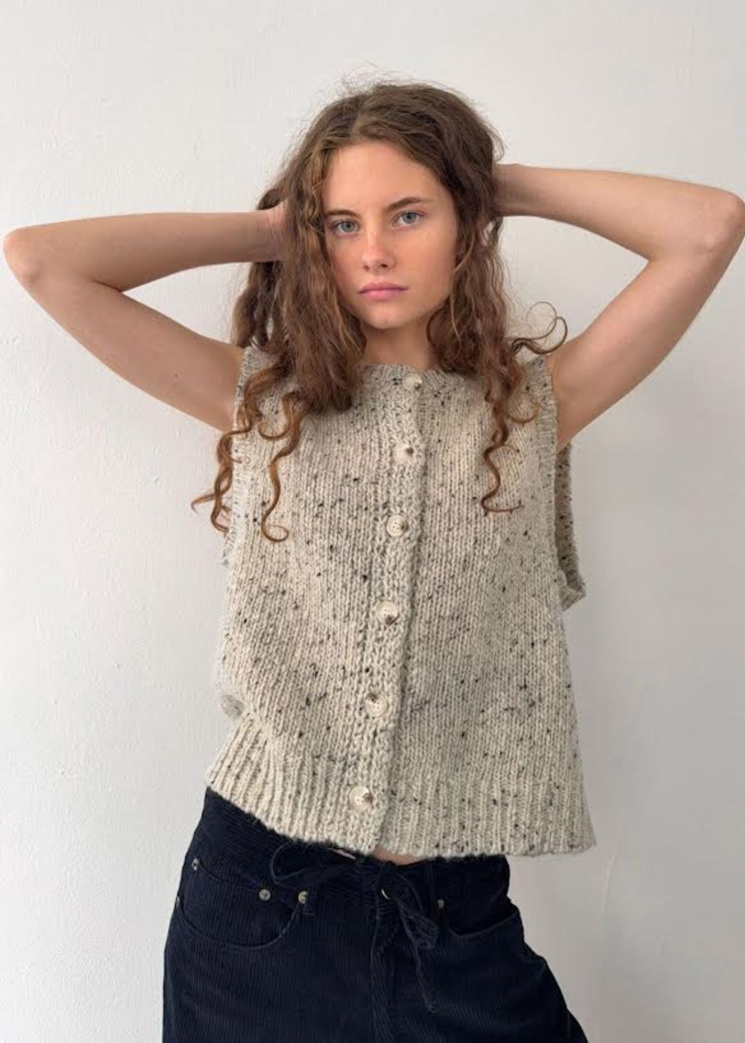 Lysegrå meleret ribstrikket vest med knaplukning og rund hals.