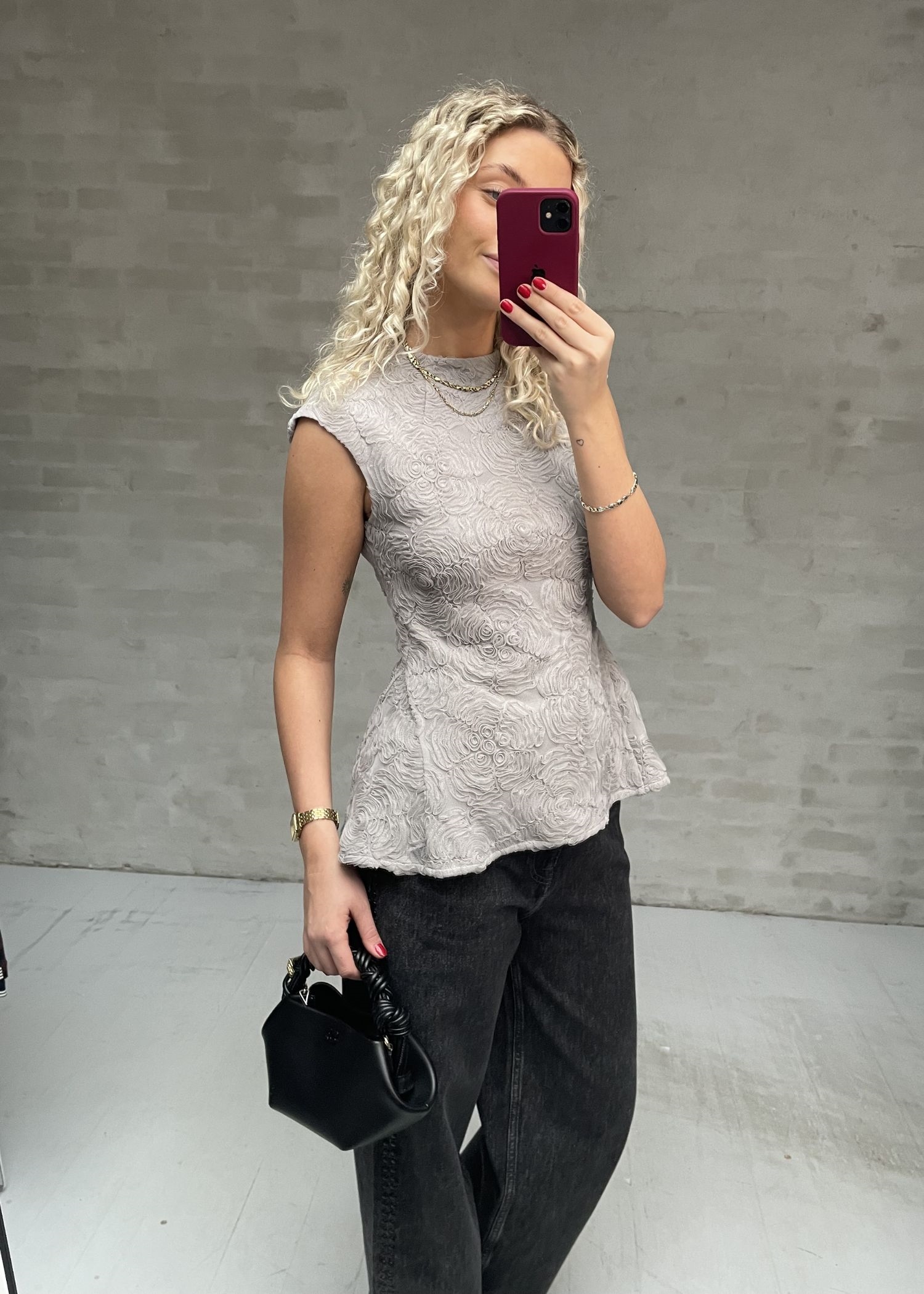 Lysegrå mesh bluse fra Rotate med rose mønster i et figursyet snit med lynlåslukning i ryggen.