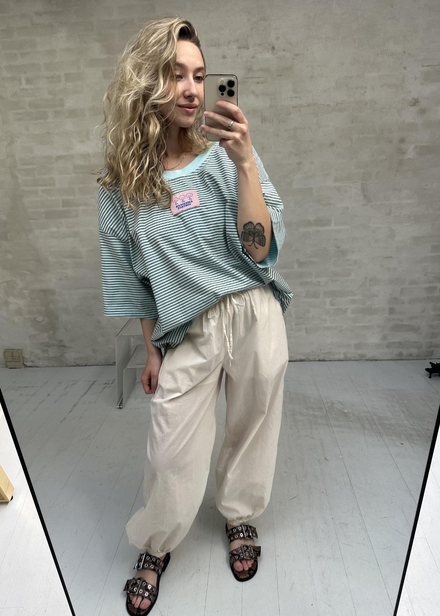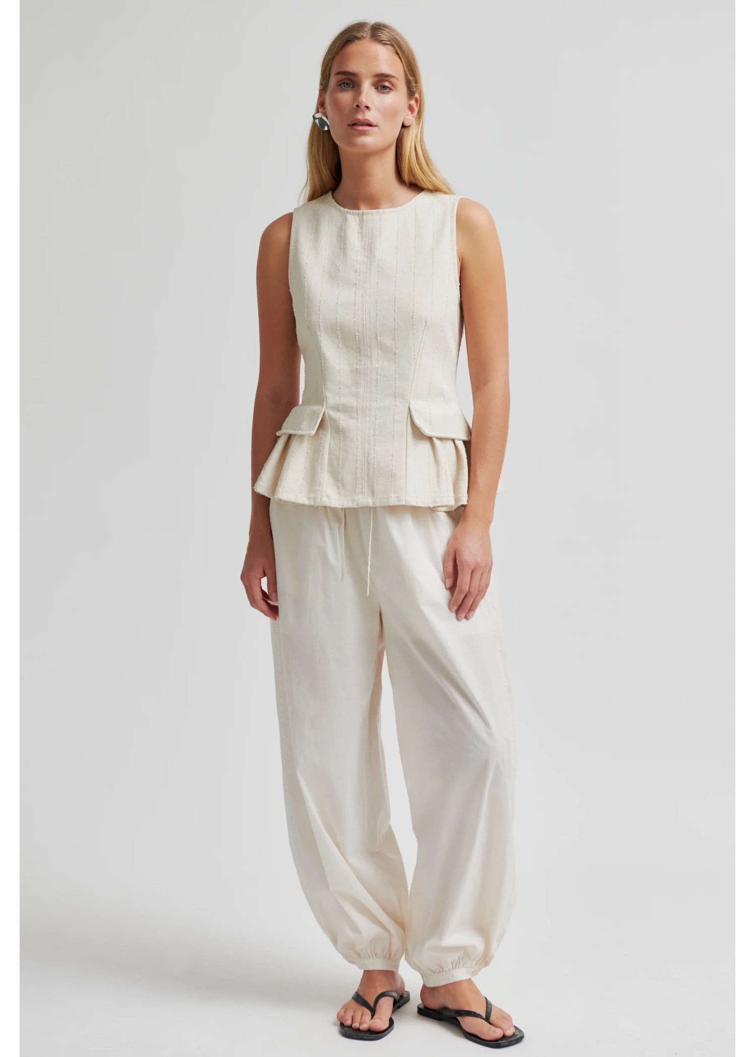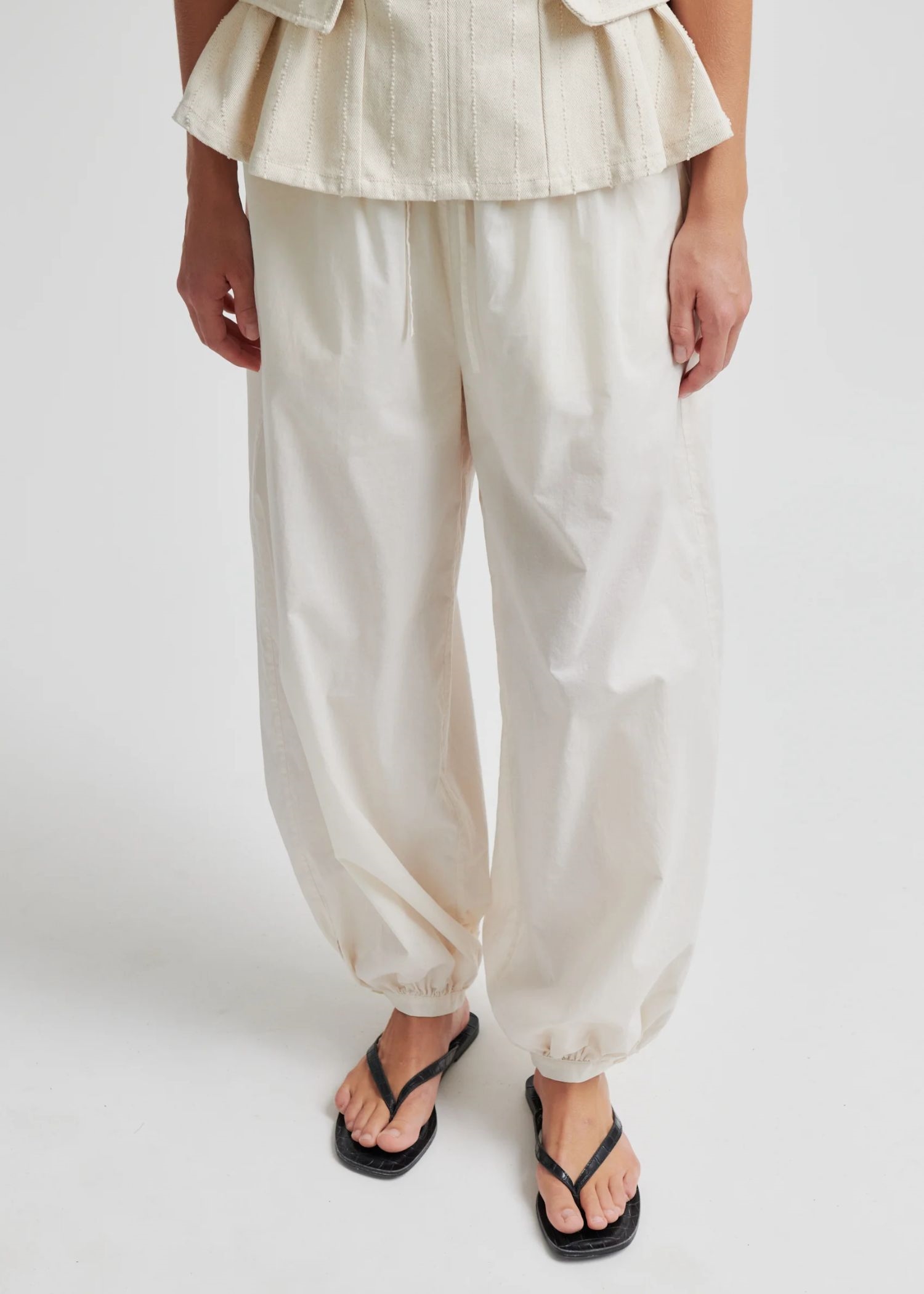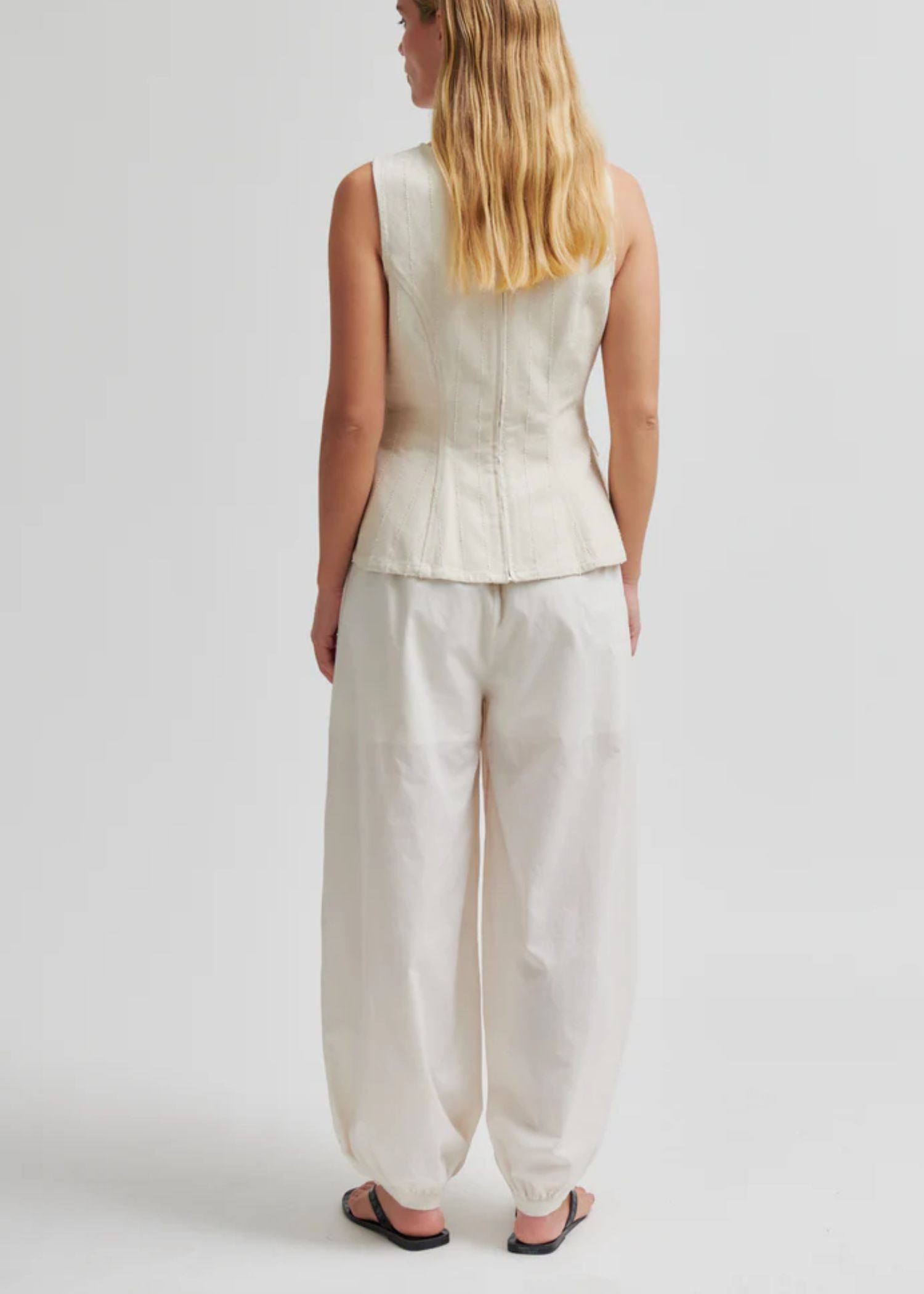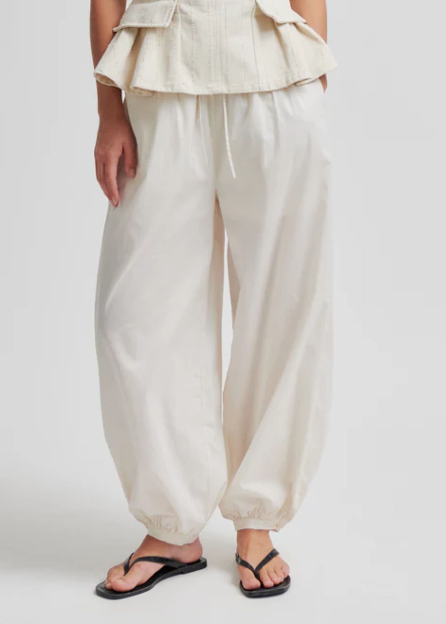 Off white haremsbukser fra Second Female i en lækker økologisk bomuldskvalitet. Buksen har bindebånd, elastisk talje bagpå og to sidelommer. Knaplukning ved anklerne. Mellemhøj talje med ballonben, der går ind ved anklerne.
