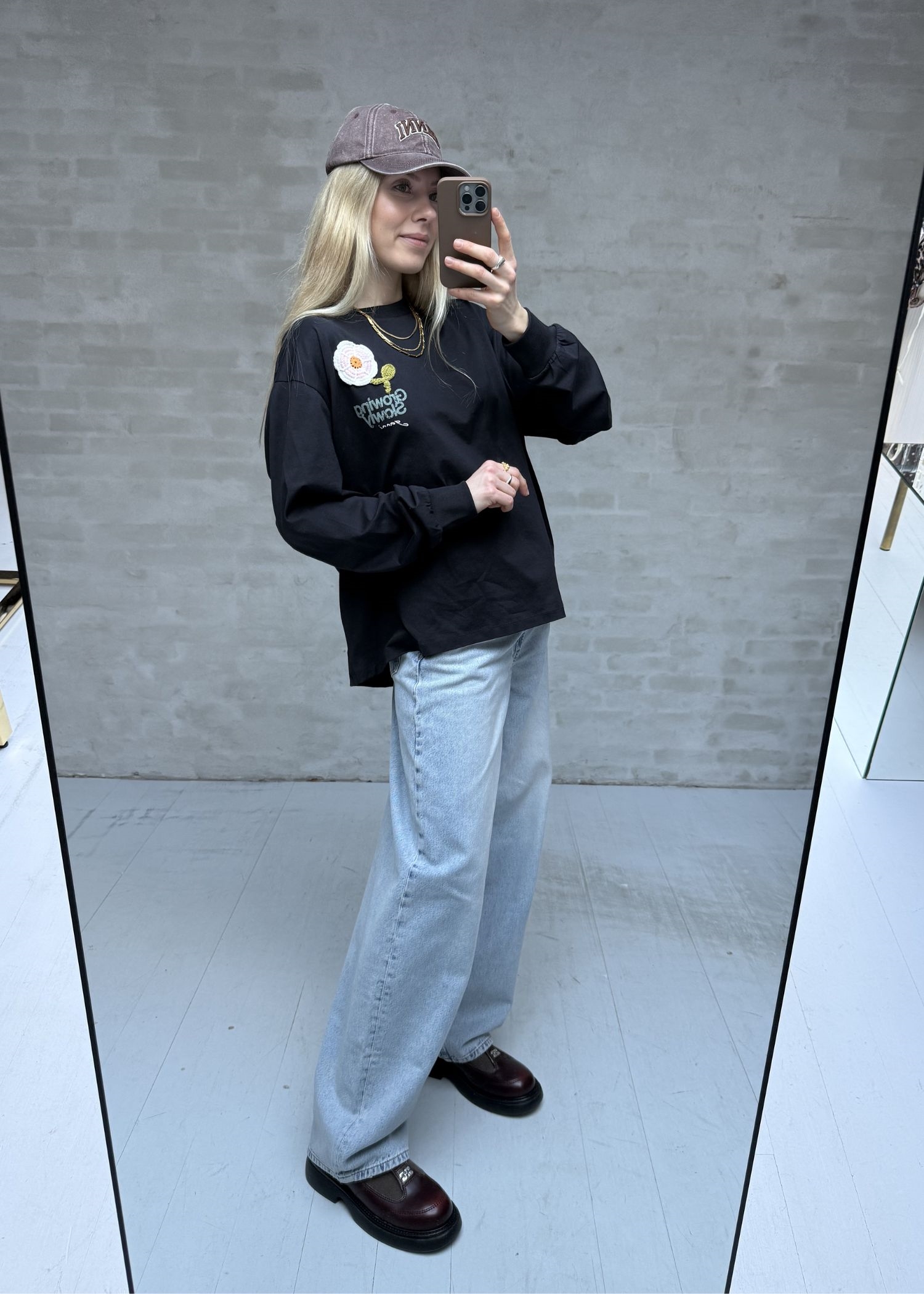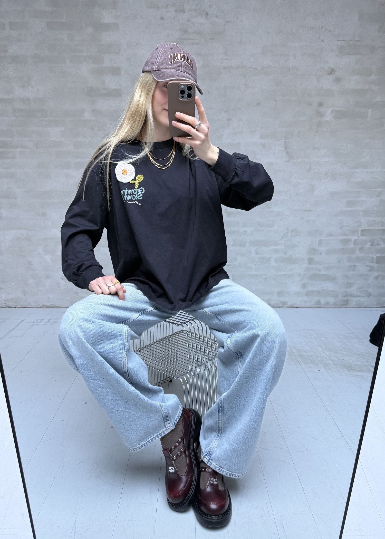 Basic cotton jersey long sleeve crochet patch bluse Phantom A1050176 Ganni