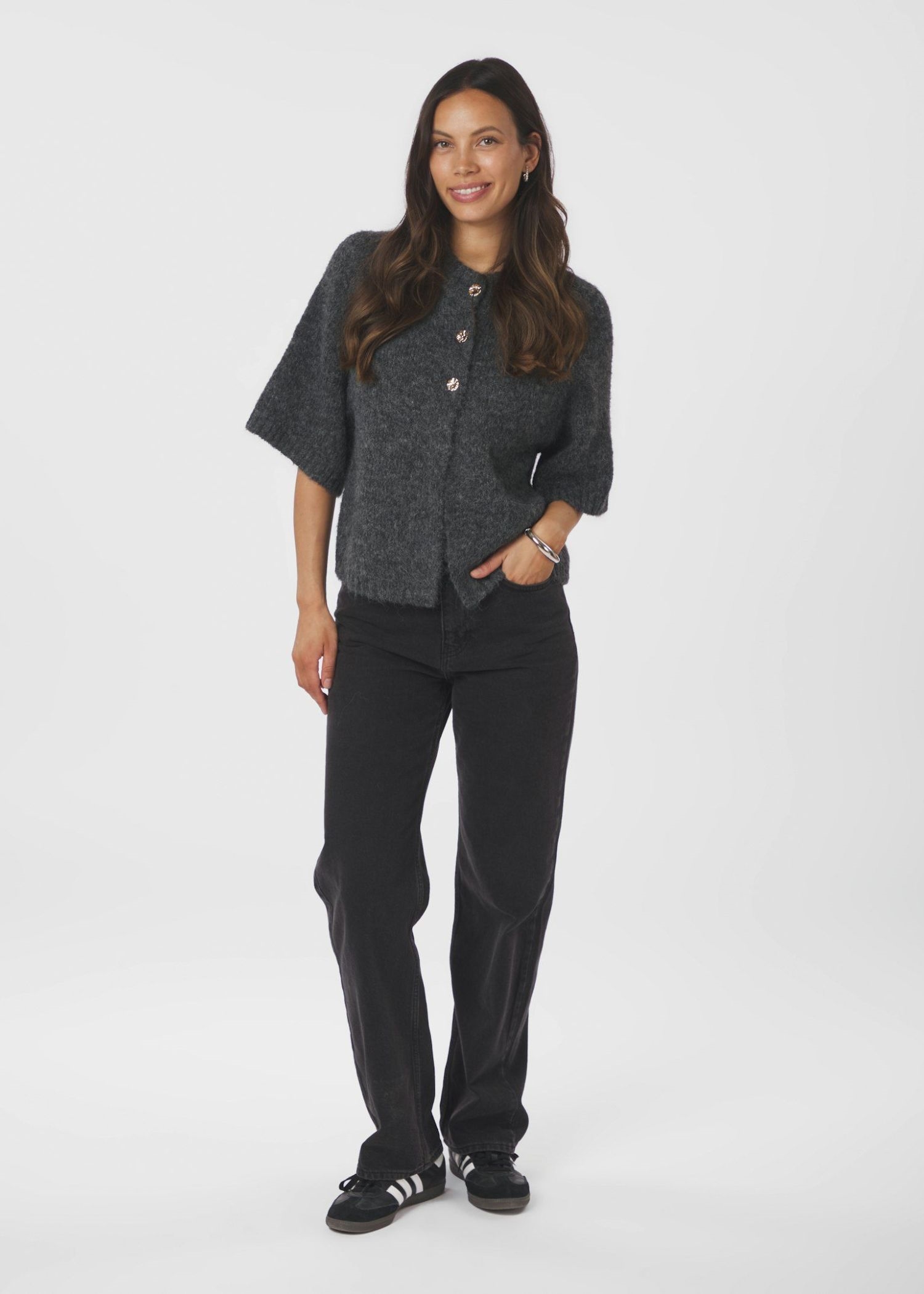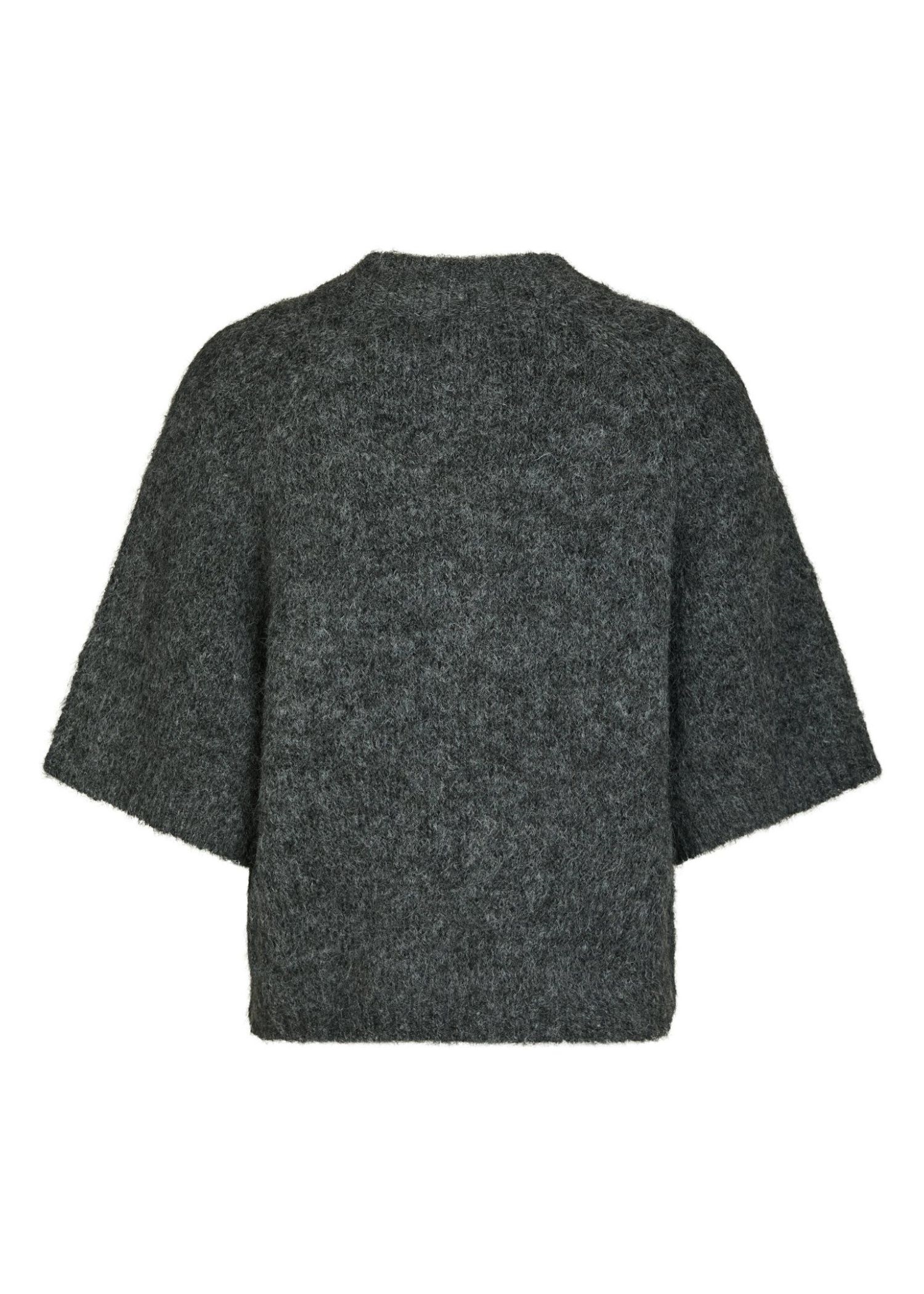 Koksgrå meleret strik cardigan fra Neo Noir i en blødere strikkvalitet, med o-hals, gennemgående knaplukning med fine guldknapper, samt løse 3/4 ærmer.