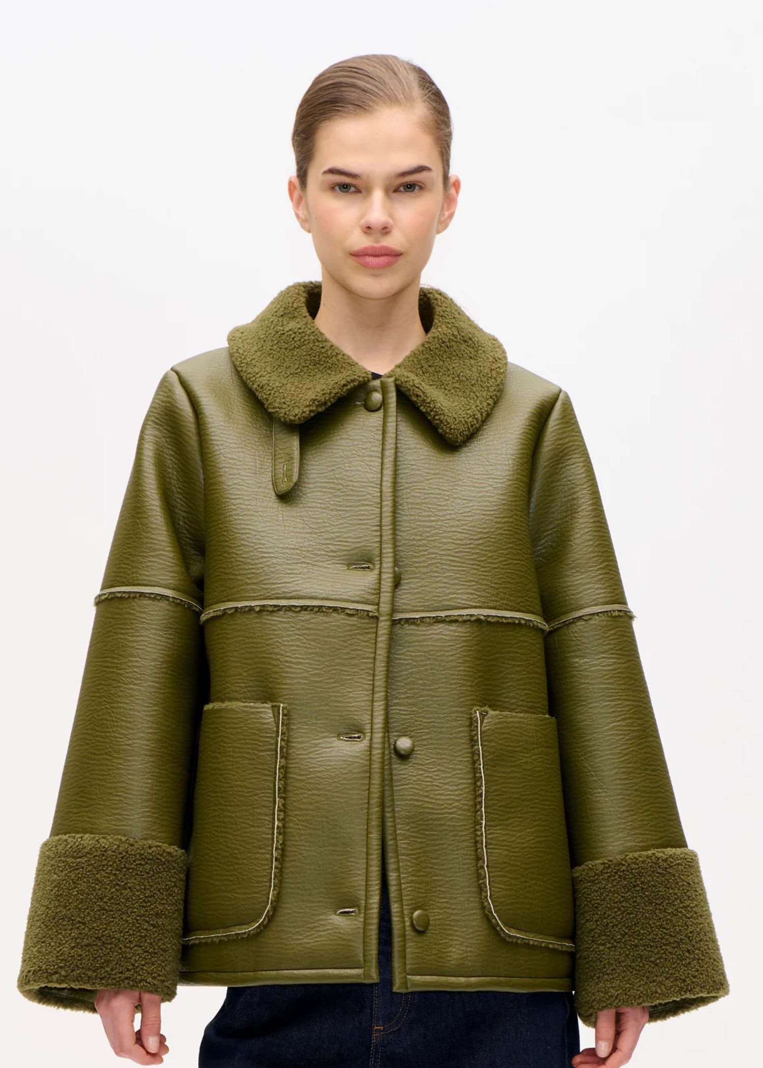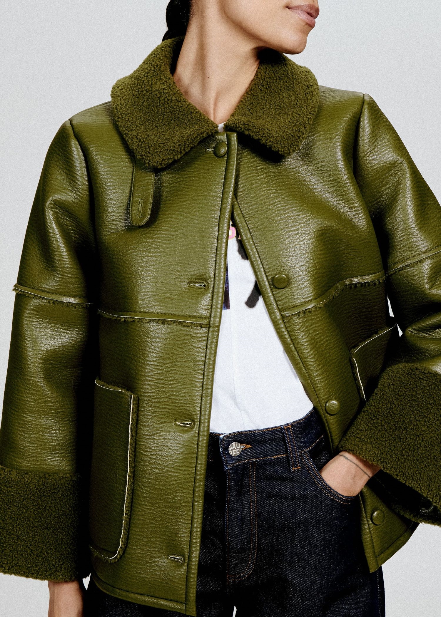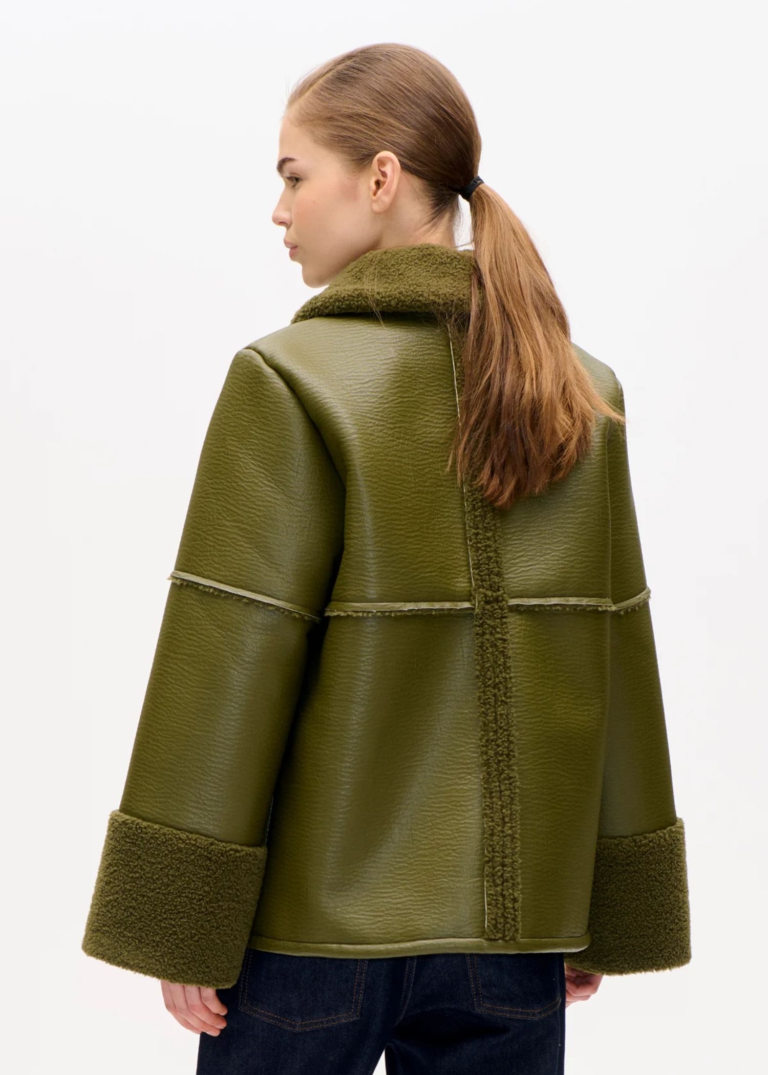 Birdie-jakken fra Baum er et populært og iøjnefaldende stykke overtøj i tekstureret kunstlæder. Som en cool kontrast til det kunstige læder har vi tilføjet blød krave og manchetter i kunstigt lammeskind samt detaljer ned langs bagsiden af jakken. Læderjakken har en behagelig løs pasform med ekstra lange ærmer og påsyede lommer i siderne samt en praktisk halslukning, så du kan justere kraven. En sand favorit i overtøjet, som du kan tage med dig gennem de koldere årstider.