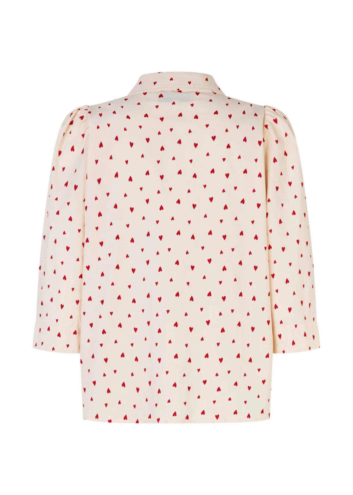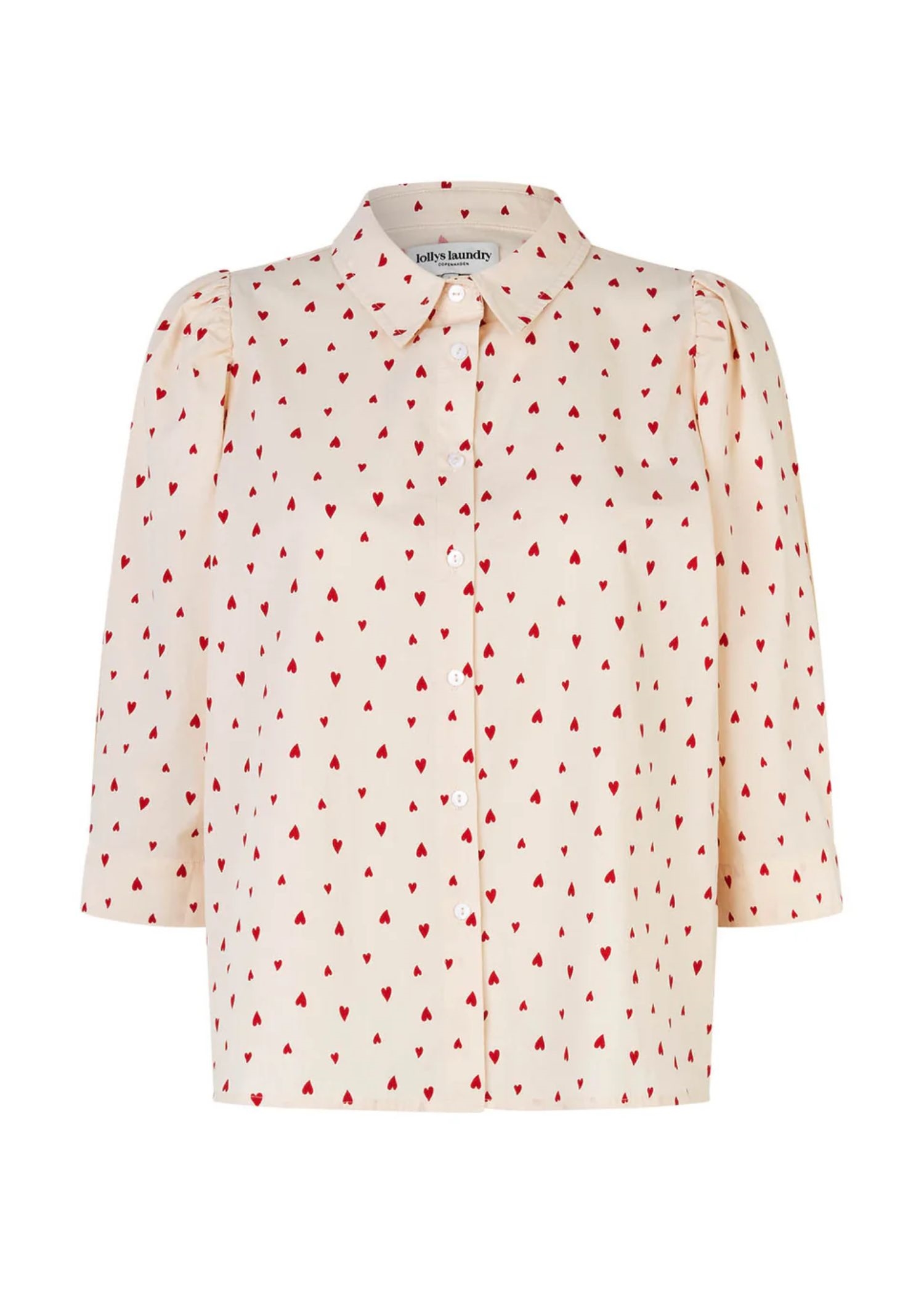 Off White skjorte fra Lollys Laundry med rødt hjerteprint i 100% bomuld, med krave, gennemgående knaplukning foran, samt let puffede 3/4 ærmer.