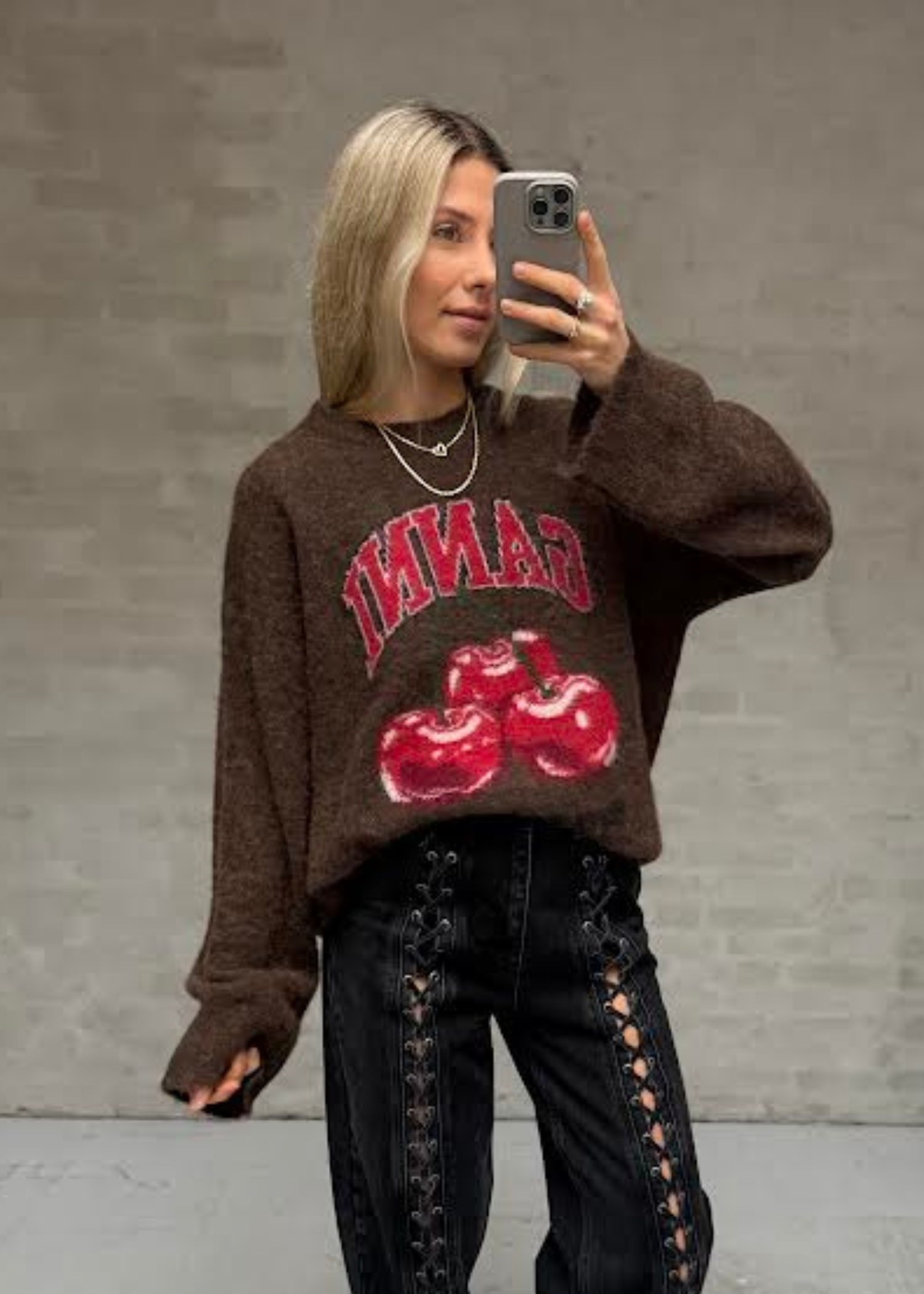 Mørkebrun alpaca strik fra Ganni med rund halsudskæring, lange ærmer og grafisk cherry print og et GANNI-logo.