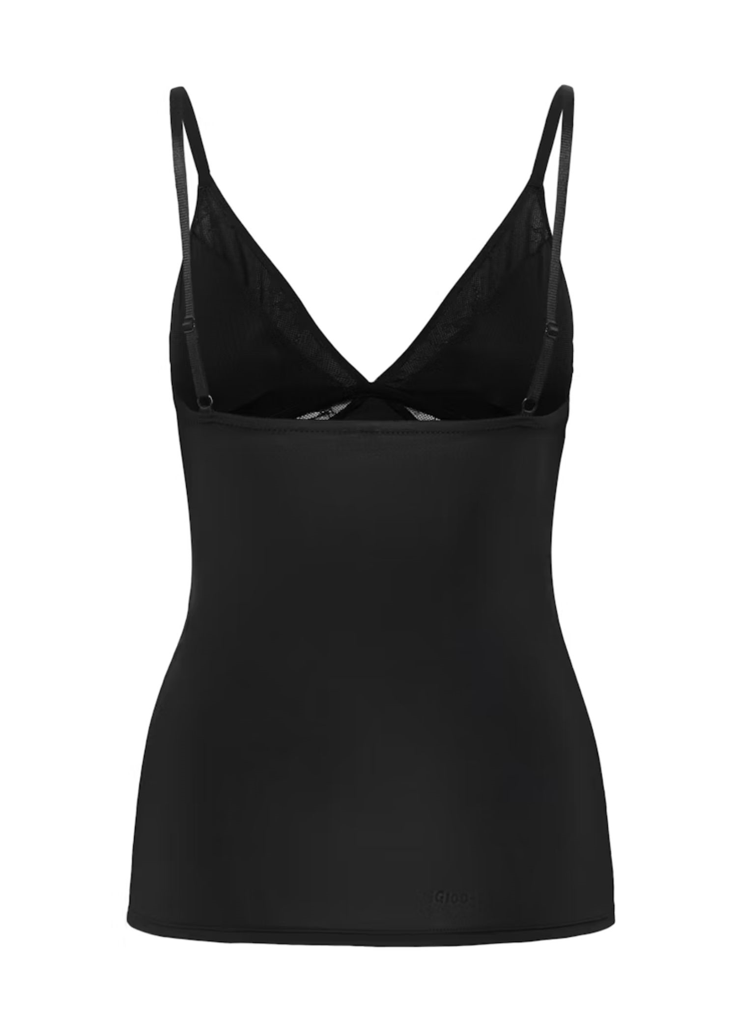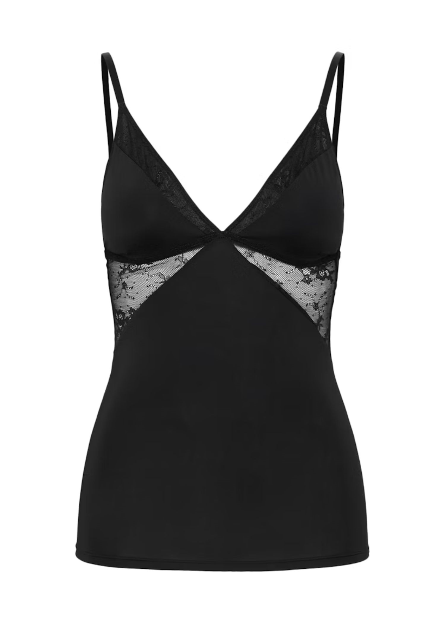 Sort camisole-top fra Gestuz med fine blondepaneler under brystet og i siderne. Designet med justerbare, smalle stropper og dyb V-udskæring for et elegant, feminint udtryk. Perfekt både alene eller under en blazer