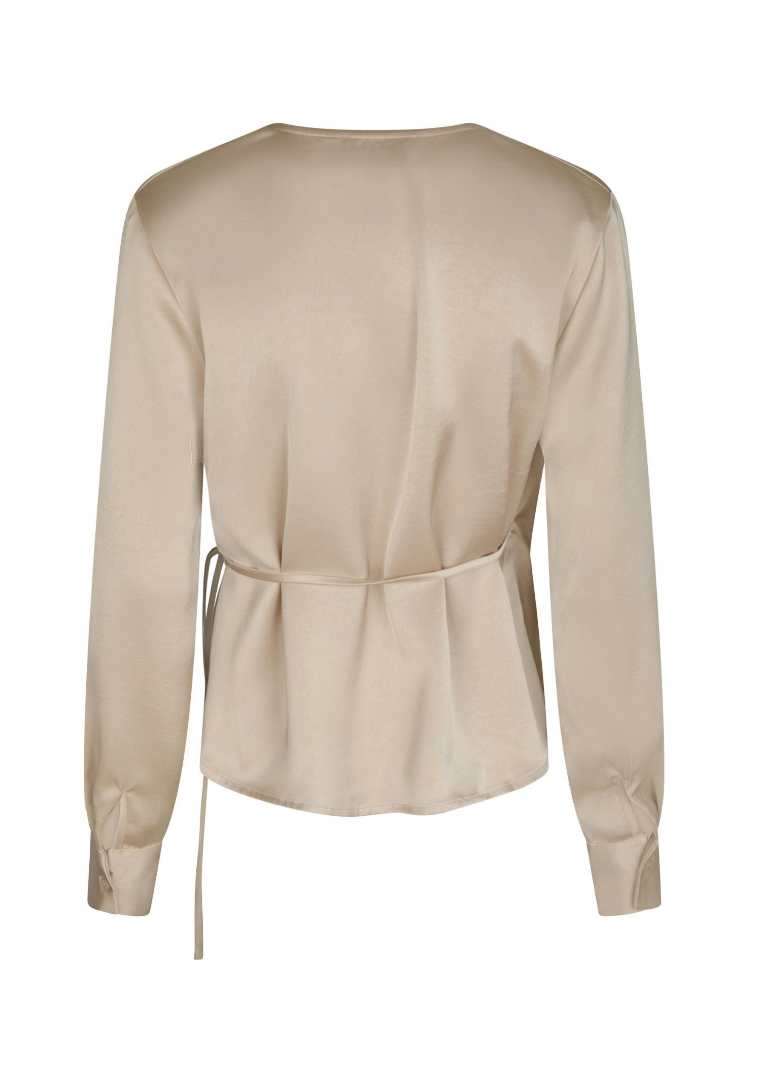 Champagne farvet satin wrap bluse fra Neo Noir med rynkedetaljer ved halsen, samt lange ærmer med knaplukning.