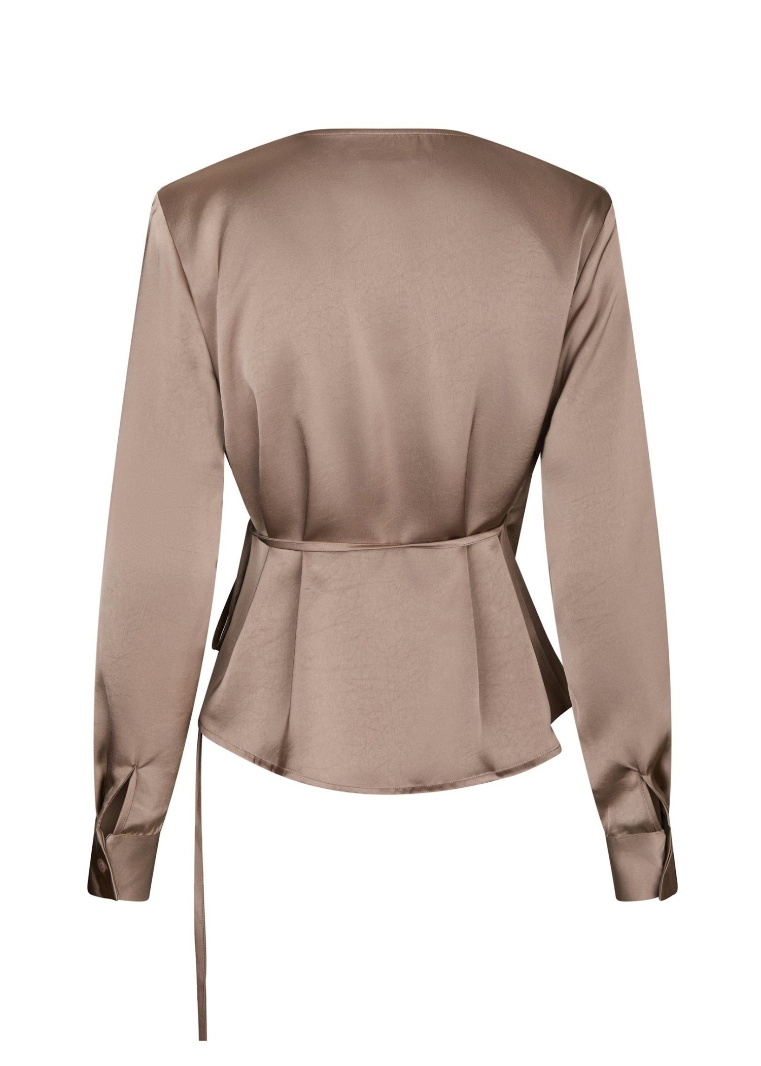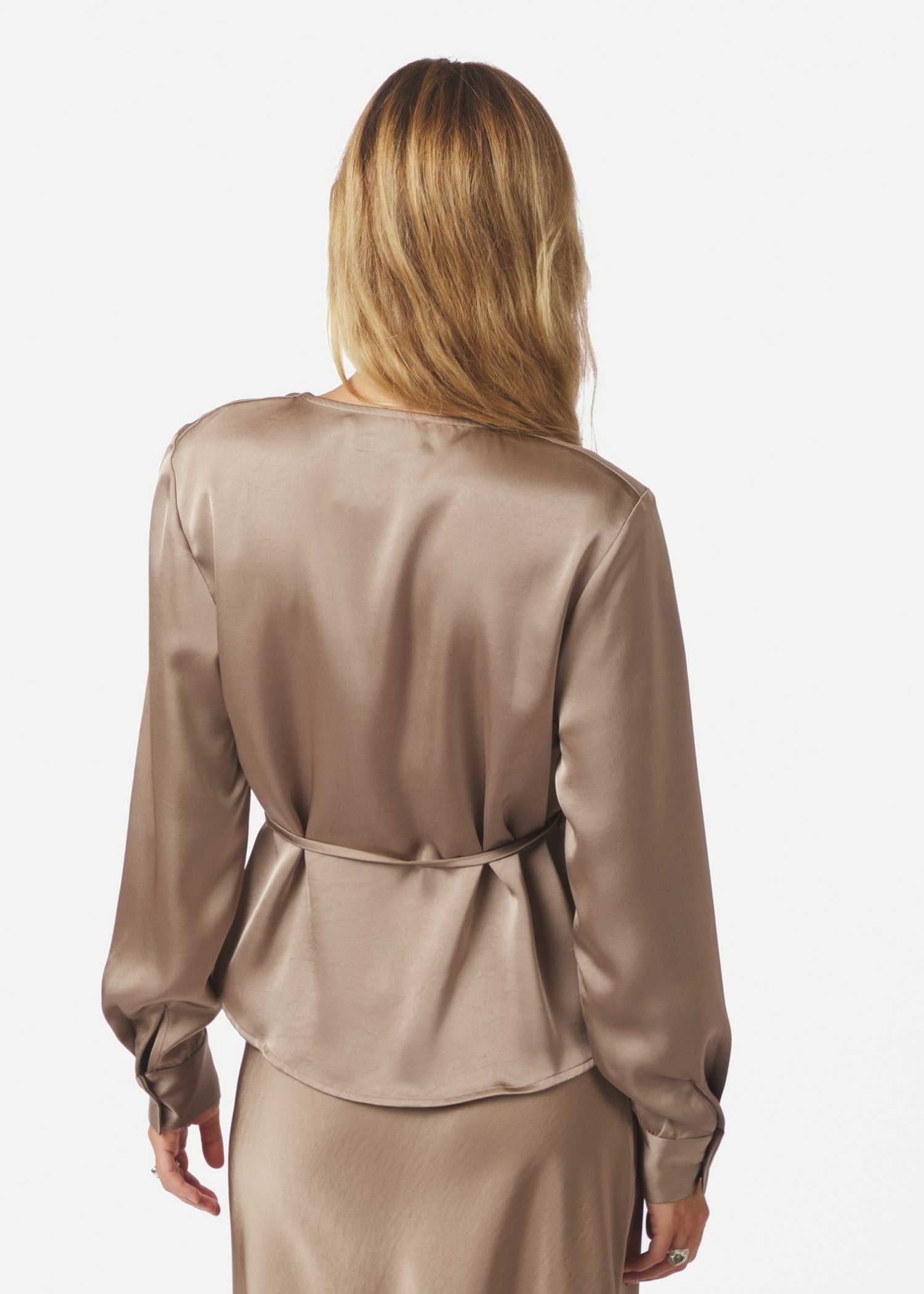 Taupe farvet satin wrap bluse fra Neo Noir med rynkedetaljer ved halsen, samt lange ærmer med knaplukning.