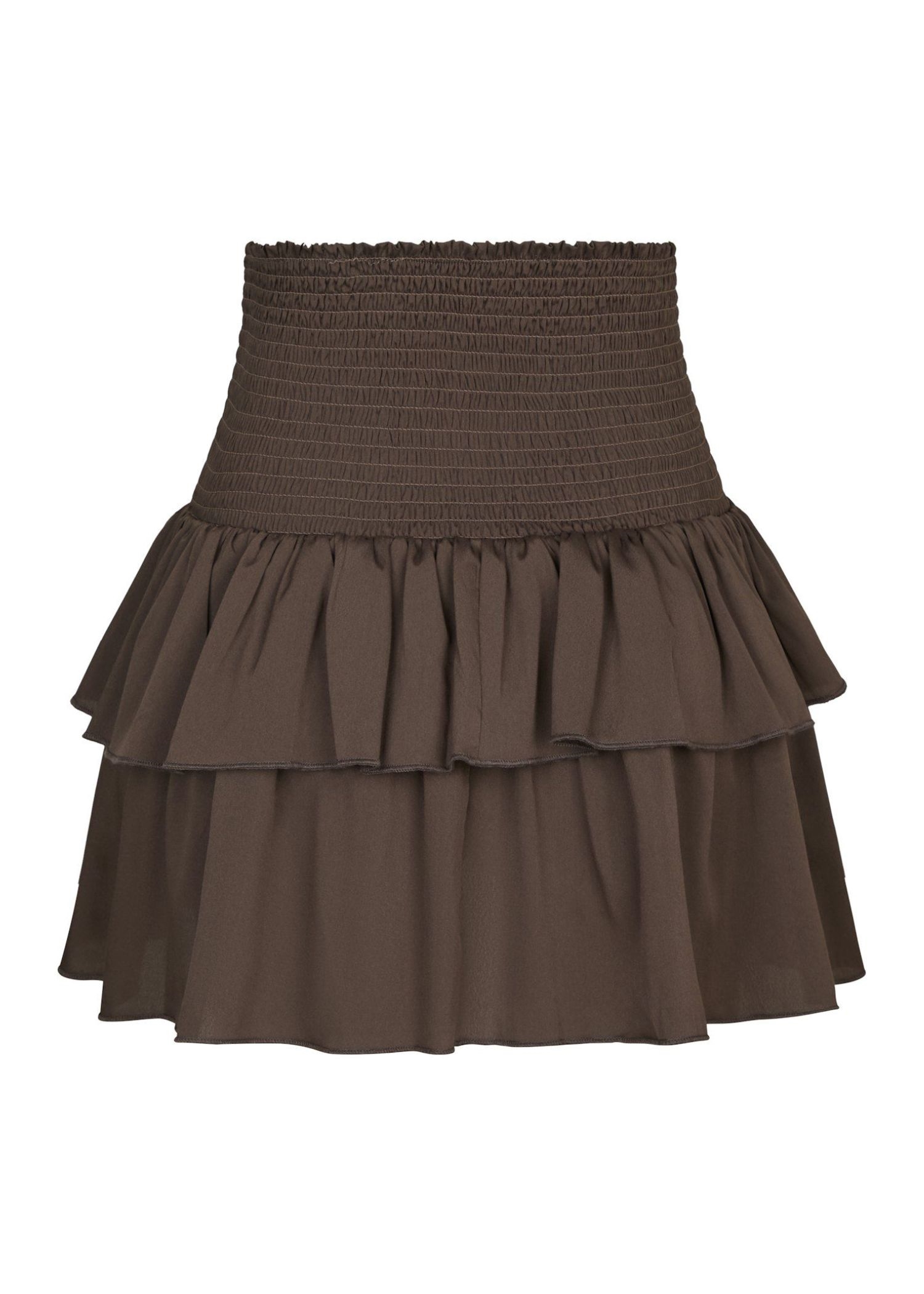 Mørkebrun kort nederdel fra Neo Noir med smockelastik i taljen og to flæselag.