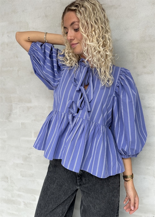 Lavendel stribet bluse fra Boii Studios med bindedetaljer, samt 3/4 posede ærmer med elastikafslutning.