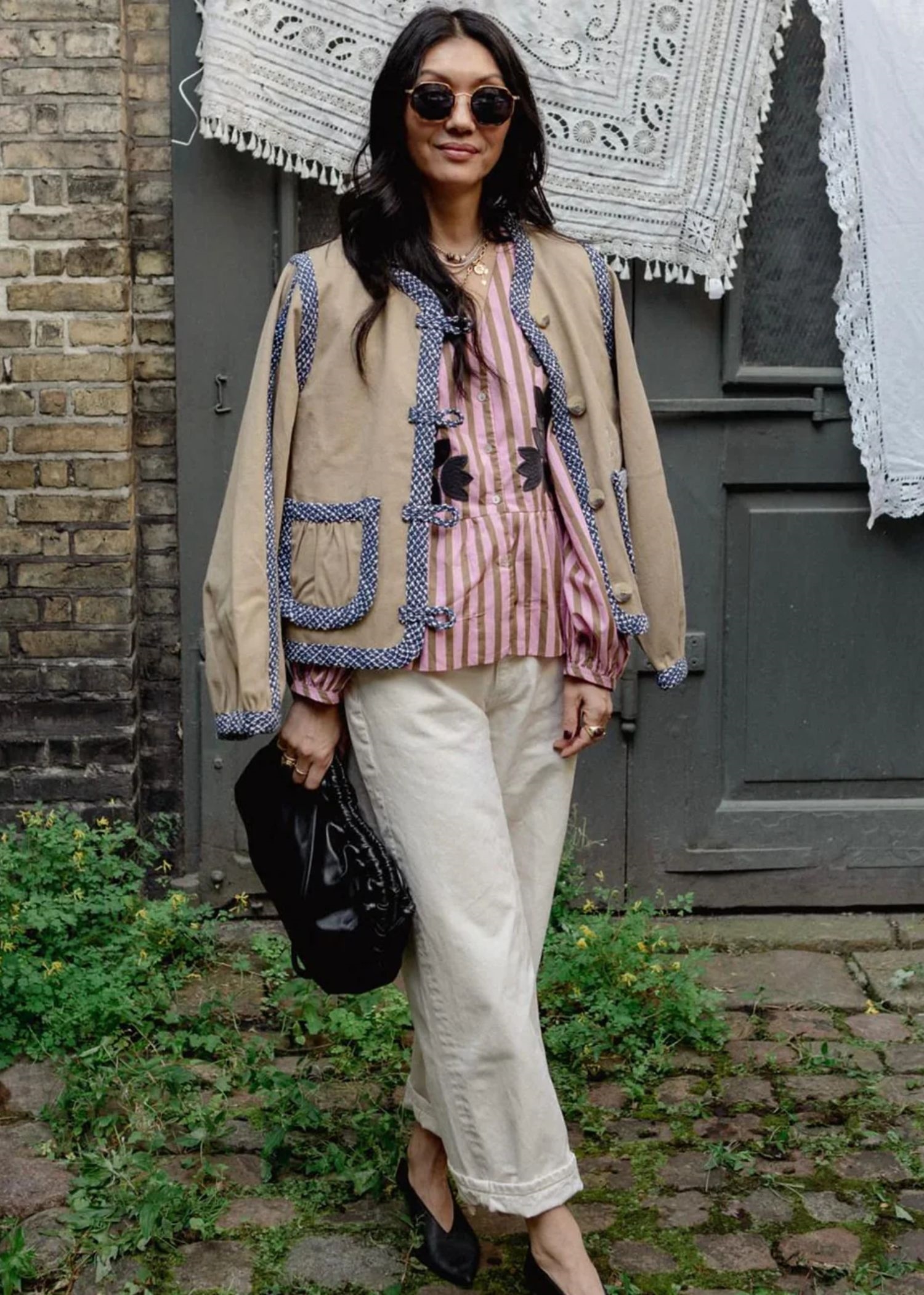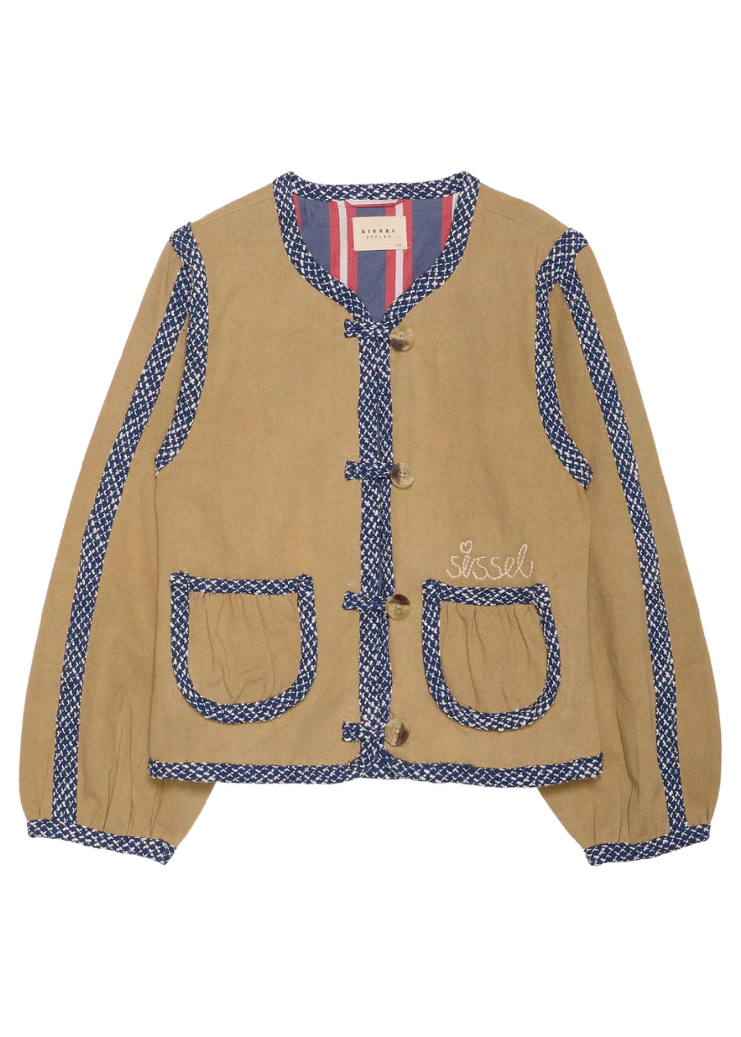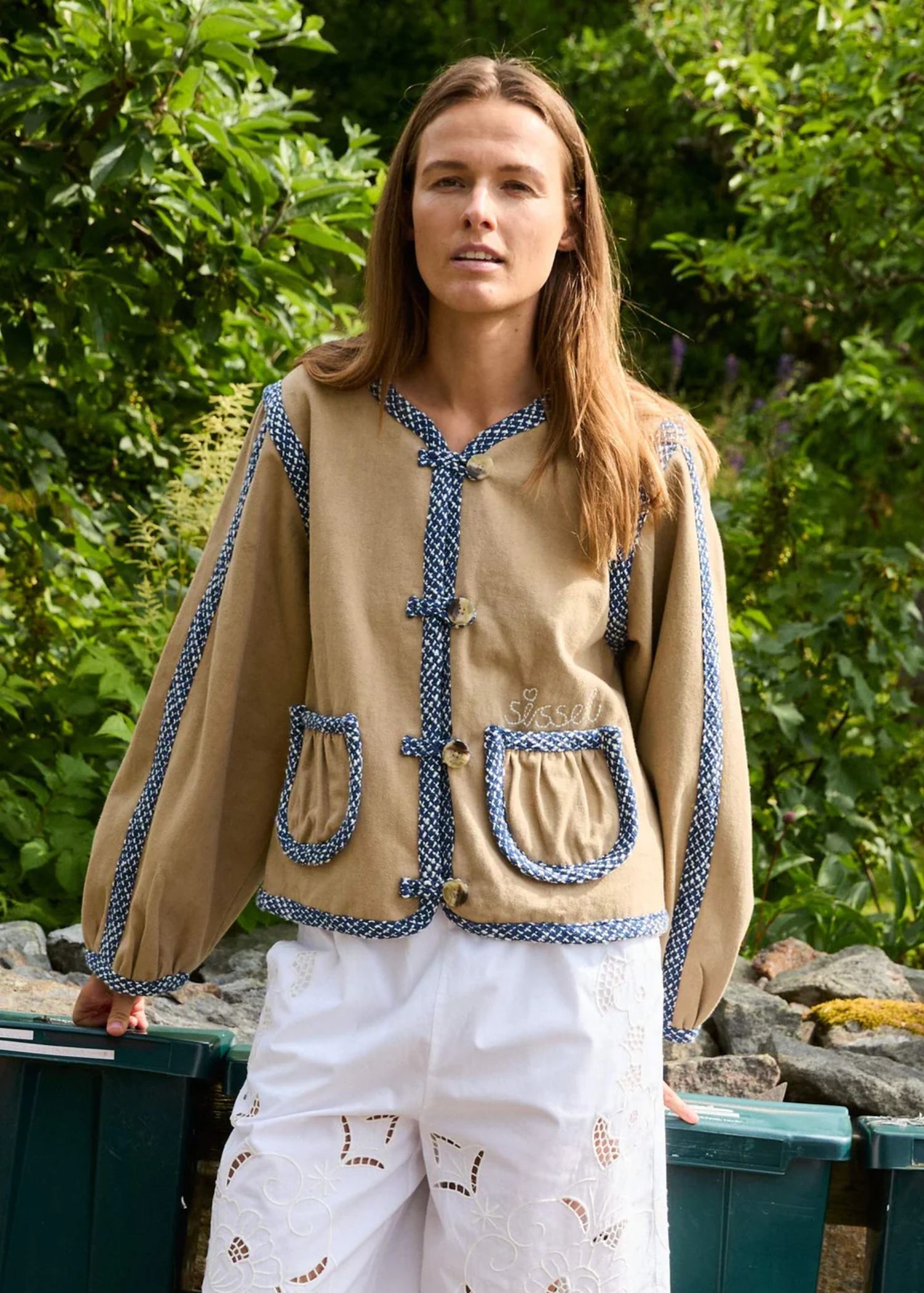 Como-jakken fra Sissel Edelbo er en feminin jakke fremstillet i 100 % økologisk bomuldstwill og foret med overskydende bomuld i garnfarvede striber. Den har voluminøse, formede ærmer og en O-formet halsudskæring. Forstykket er detaljeret med fire knapper i benlook og løkker som lukning. Jakken har to forlommer, afsluttet med fine rynkedetaljer. Jakkens kanter er blødt formede og kantet med brede, markante bouclébånd. En fin broderet “Sissel”-signatur er placeret over venstre forlomme.
