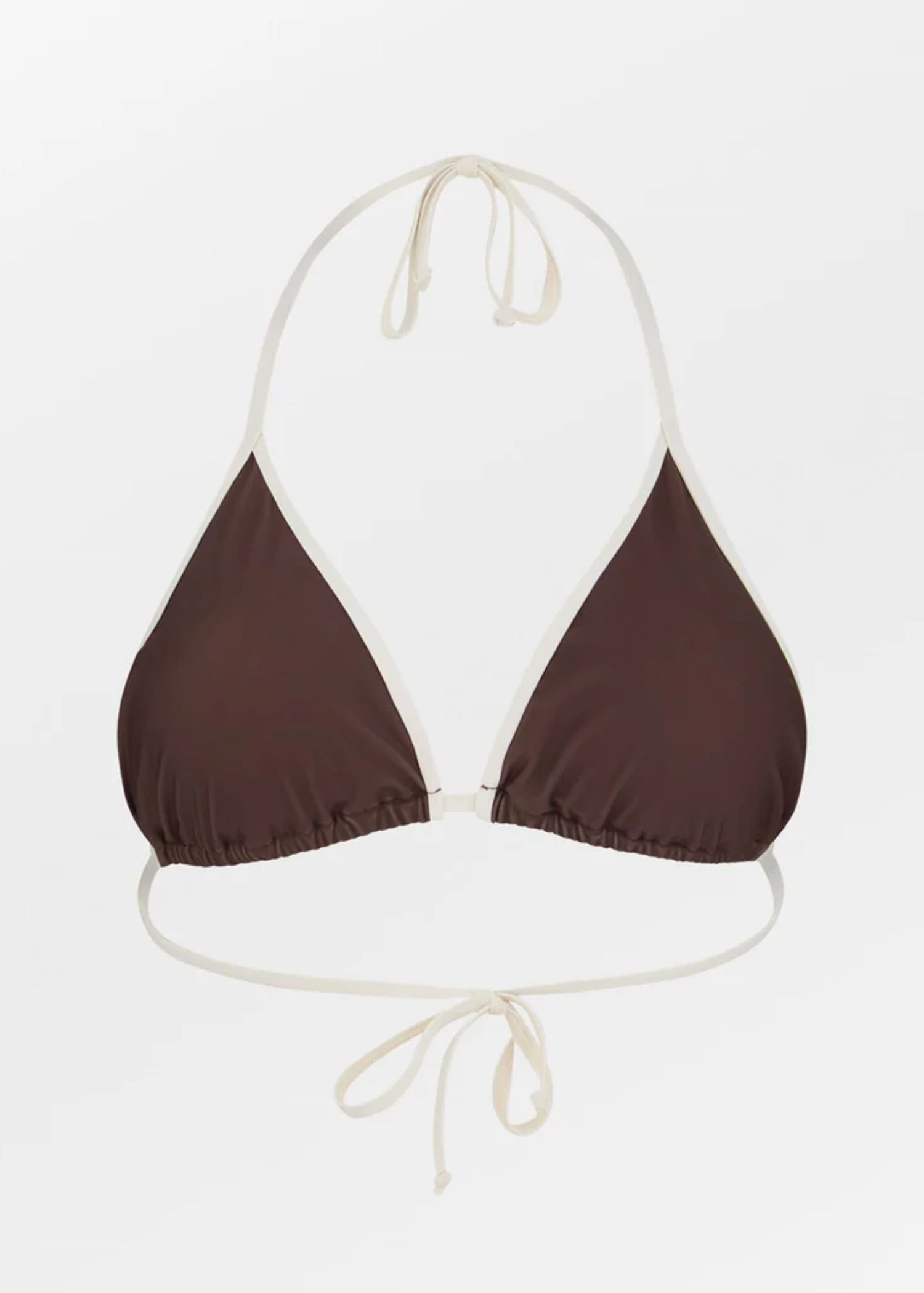 Contrast Bel Bikini top fra Becksöndergaard er en af vores personlige favoritter. En bikini top designet i 85% recyled polyester og 15% elastan. Bikini toppen har justerbare stropper på både ryg og i nakken, som gør det muligt at tilpasse, så den passer bedst til dig. Med dens Hot Fudge Brown farve og hvide kontrast syninger, vil du være sikker på, at tiltrække opmærksomhed.