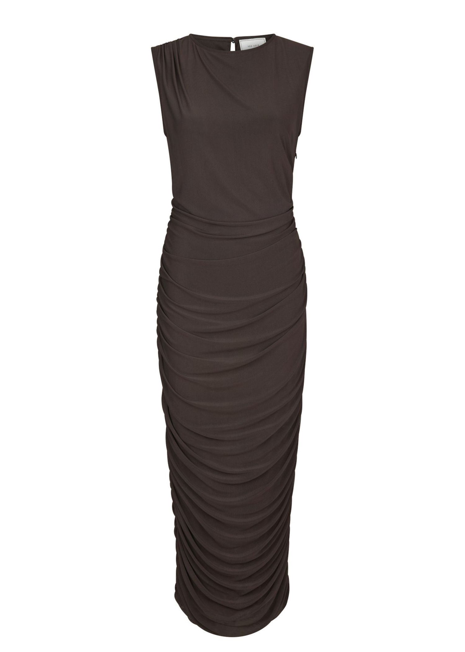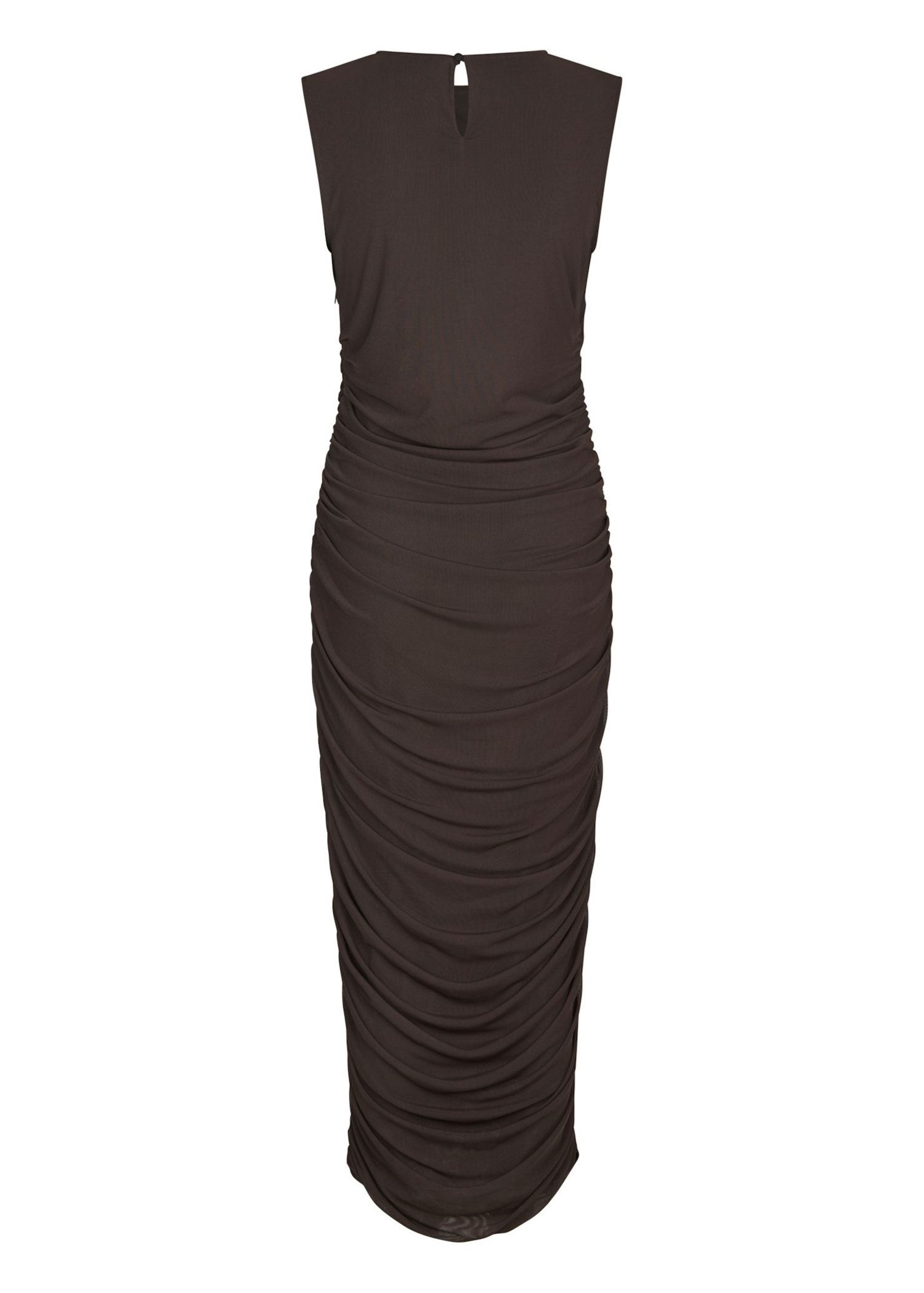 Mørkebrun mesh kjole fra Neo Noir. Kjolen i en let polyester kvalitet med stretch har en bred o-hals, samt rynkedetaljer langs siderne.