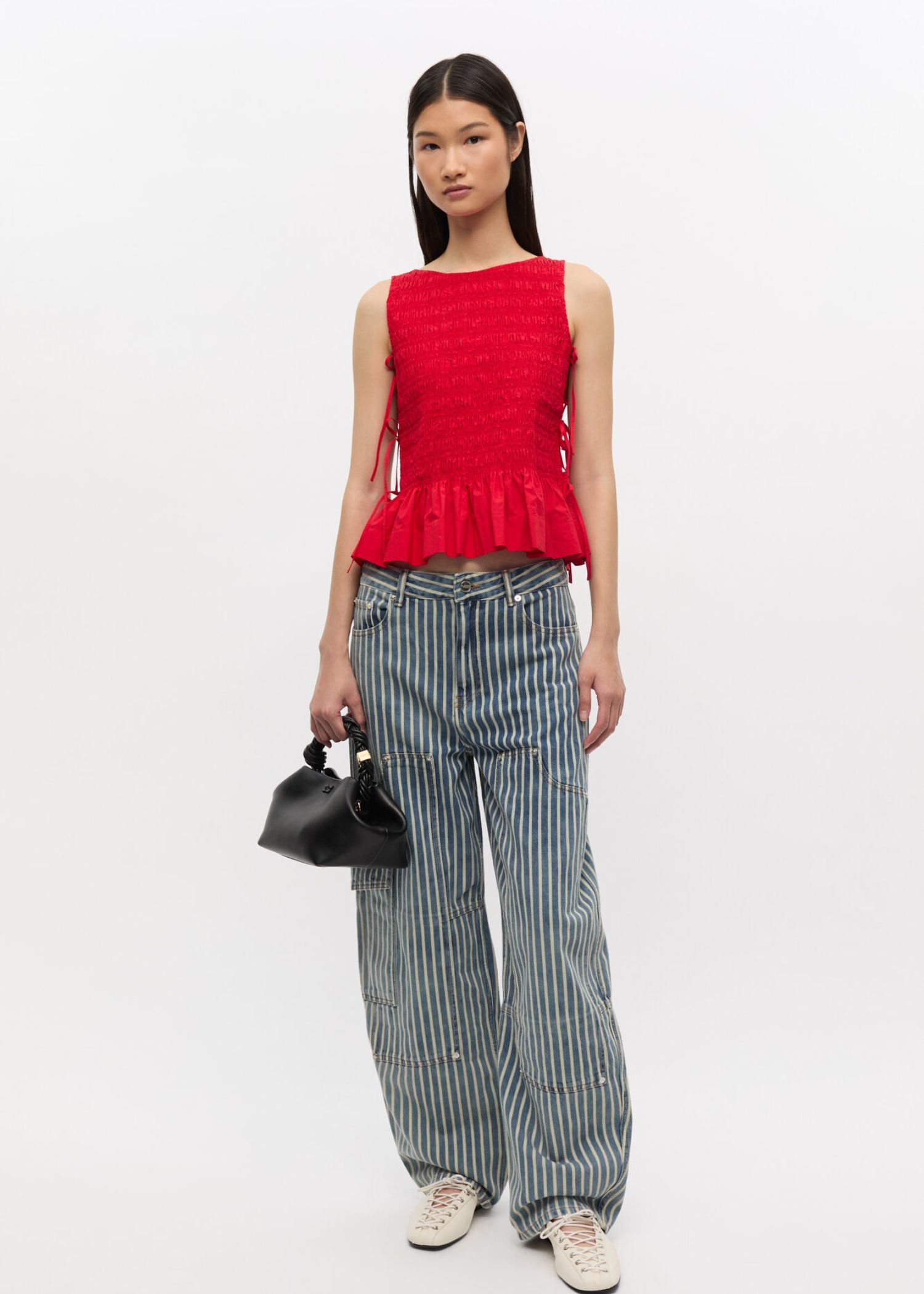 Rød smocktop fra Ganni er ærmeløs og har snøredetaljer langs siderne, dyb ryg og flæsekant.