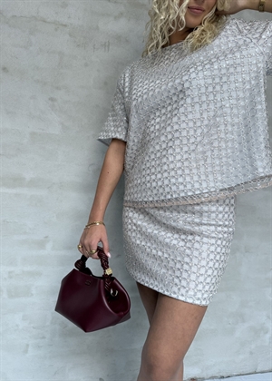 Flot lysegrå perlemønstret tee fra Rotate i en let polyester/viskose kvalitet med stretch. Blusen har o-hals, skjult lynlåslukning i nakken, aftagelige skulderpuder, samt korte løse ærmer.