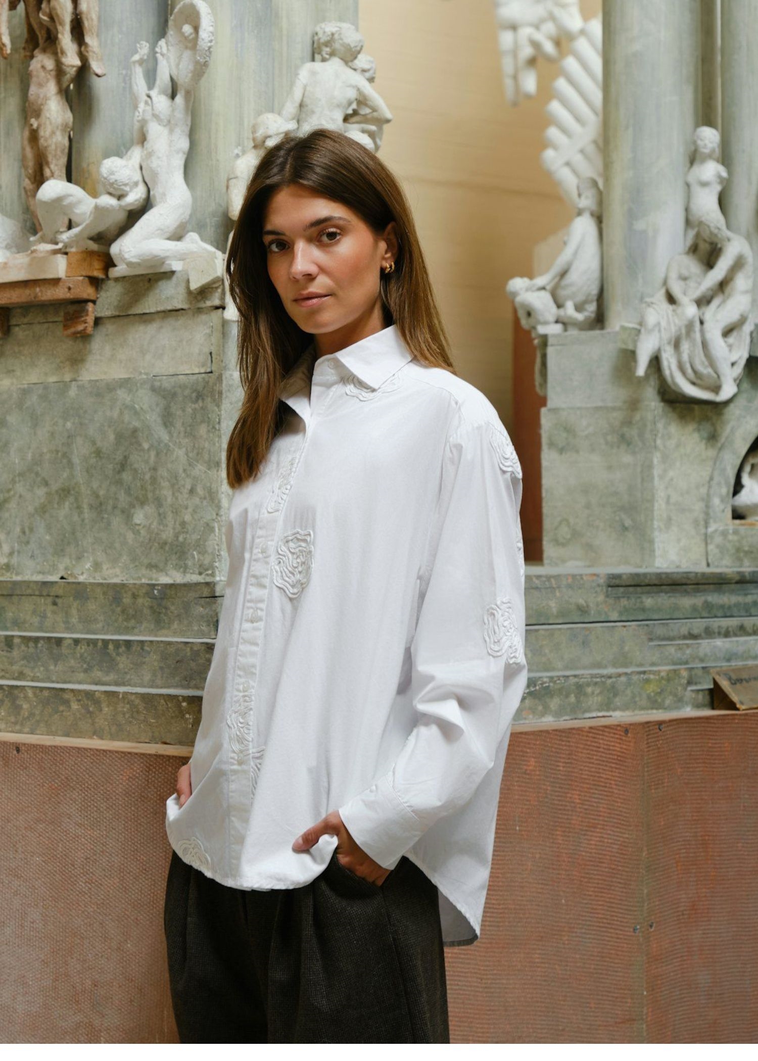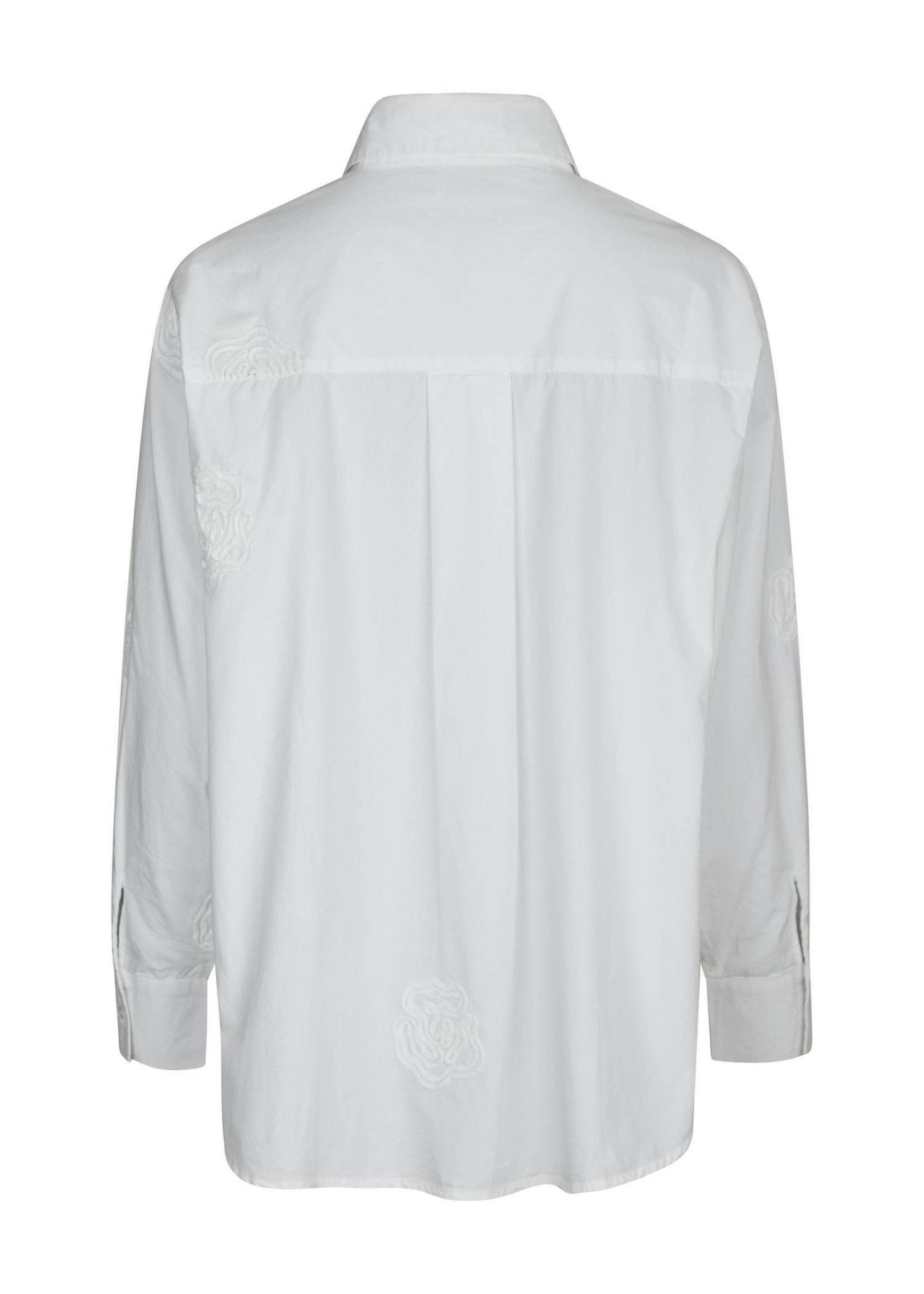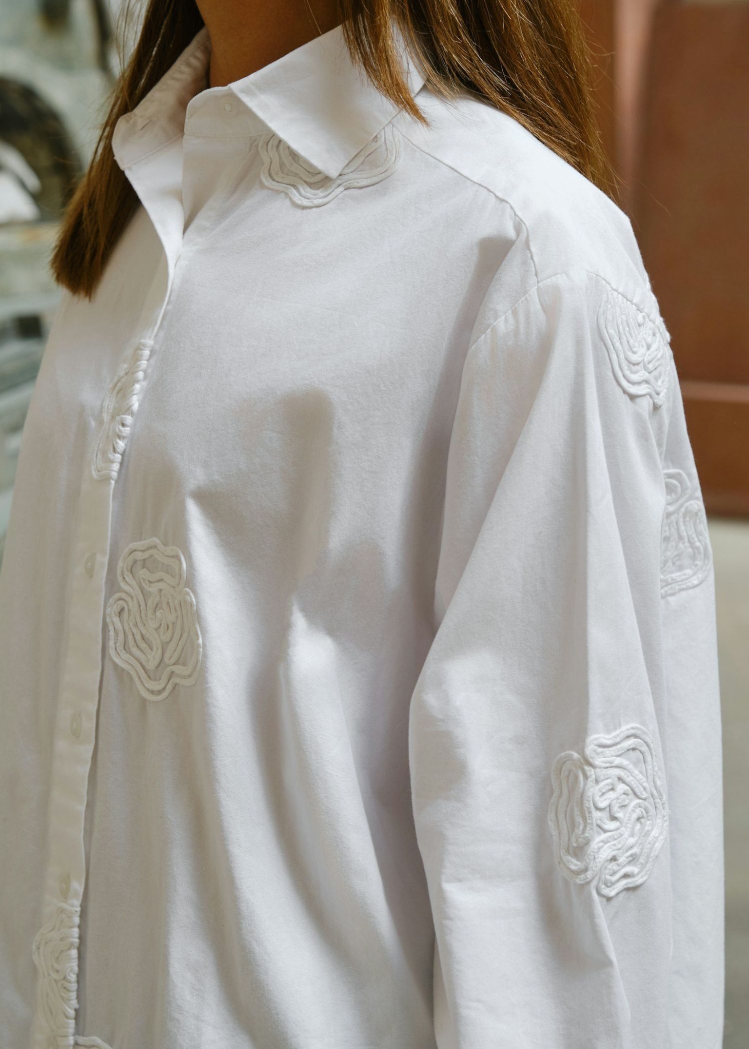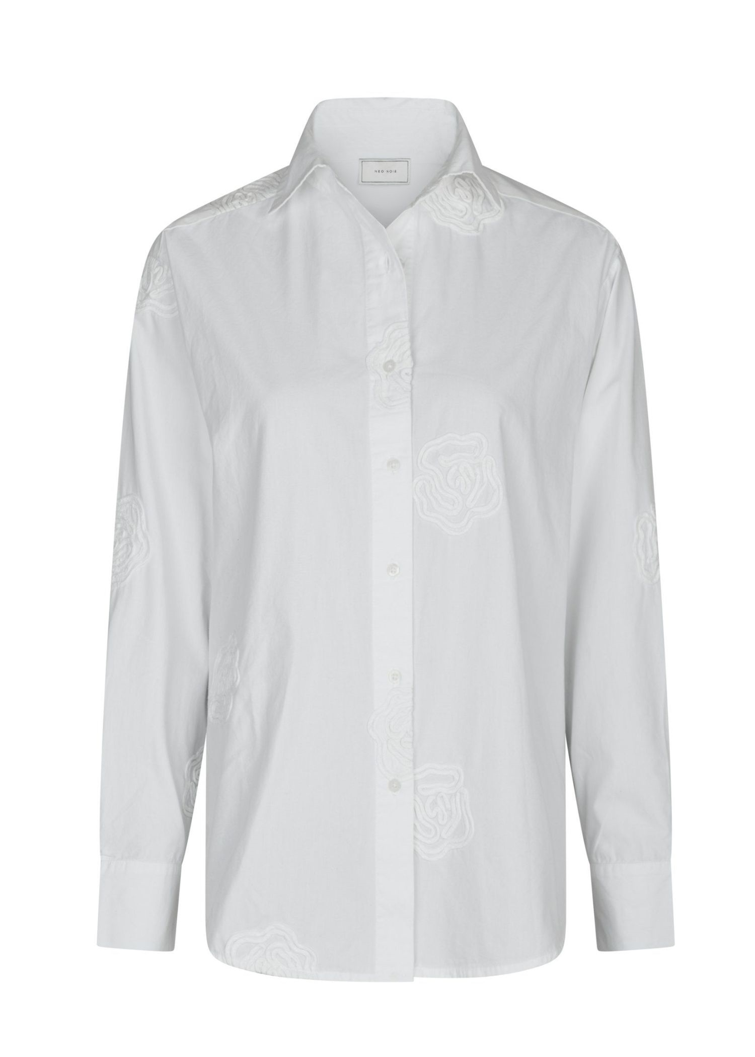 Hvid bomuldsskjorte fra Neo Noir med påsyede snore blomster, krave, gennemgående knaplukning, samt lange ærmer med knaplukning ved manchet.