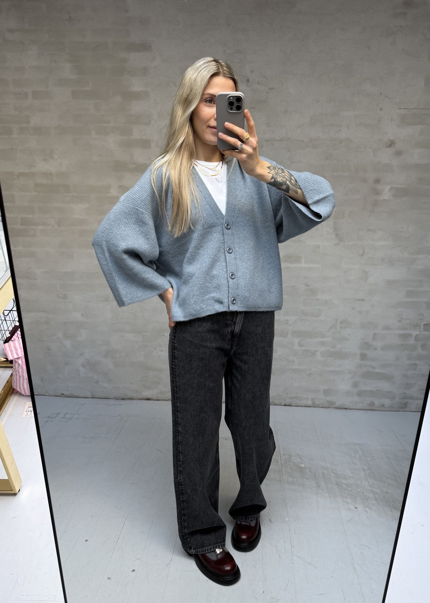 Dueblå ribstrikket cardigan fra American Vintage i en bred oversize model med v-hals, tone i tone knaplukning, smat 3/4 brede ærmer.