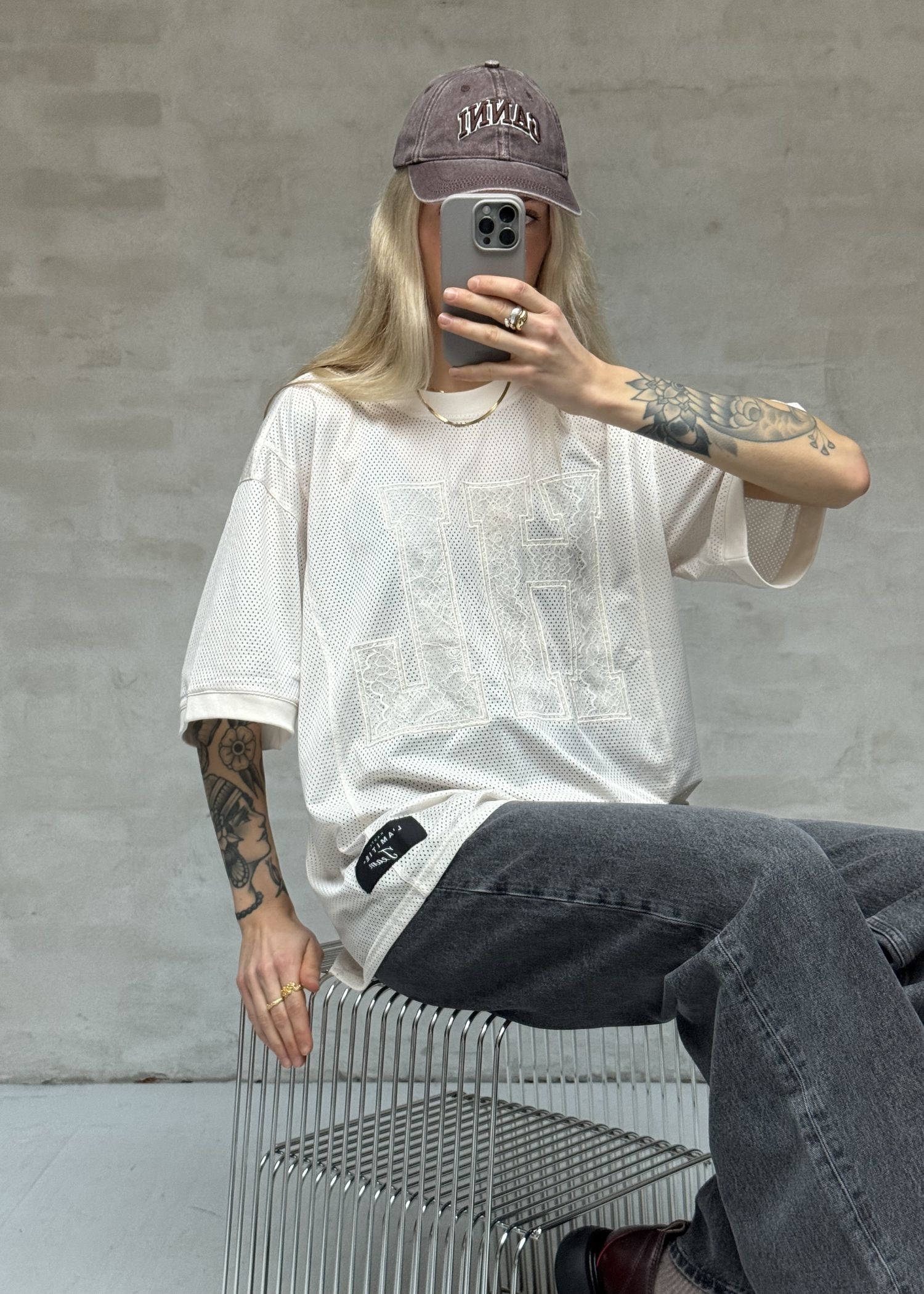 Cool off-white boxy tee fra Haute L'amitié i en let polyester kvalitet, med o-hals korte løse ærmer med rib-afslutning, hulmønster, tone i tone blonde "HL" signatur foran, samt sort påsyet logo i bunden.