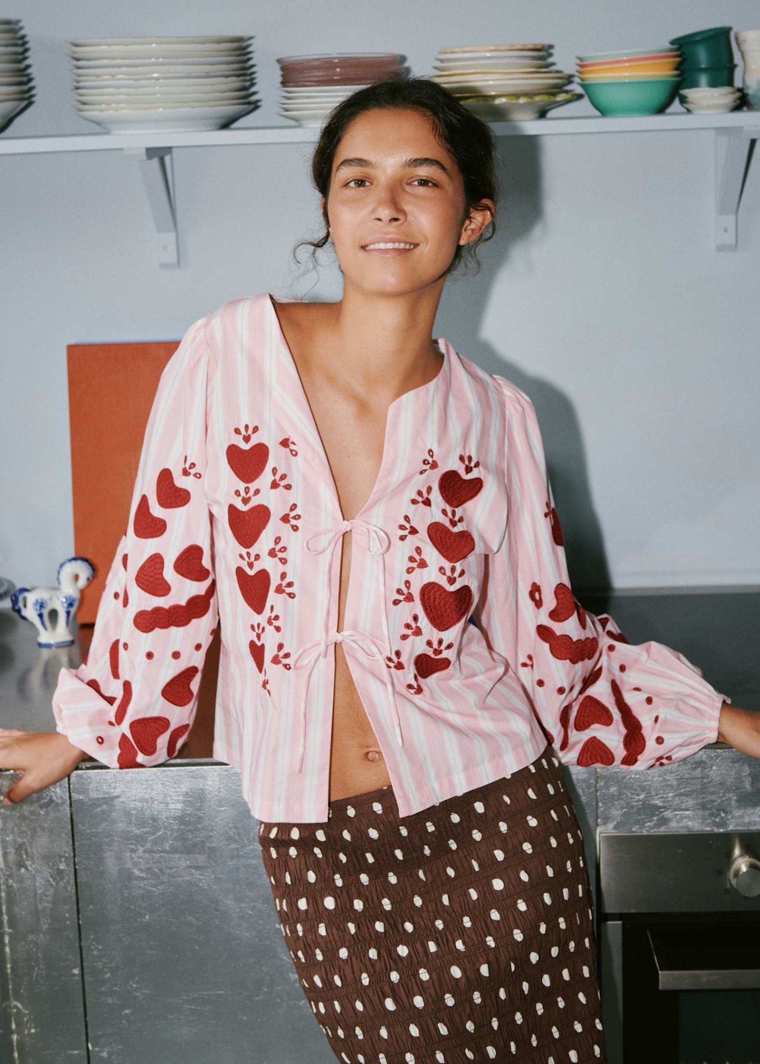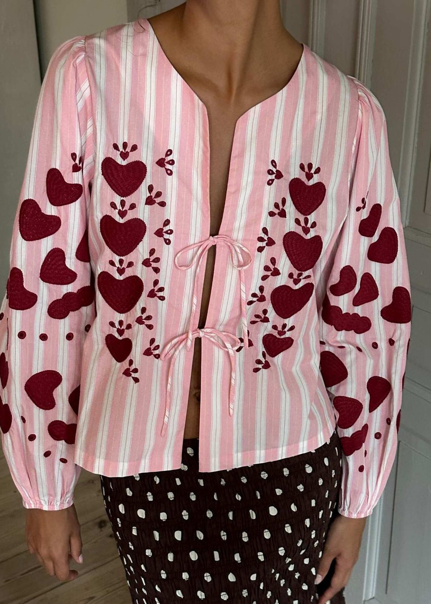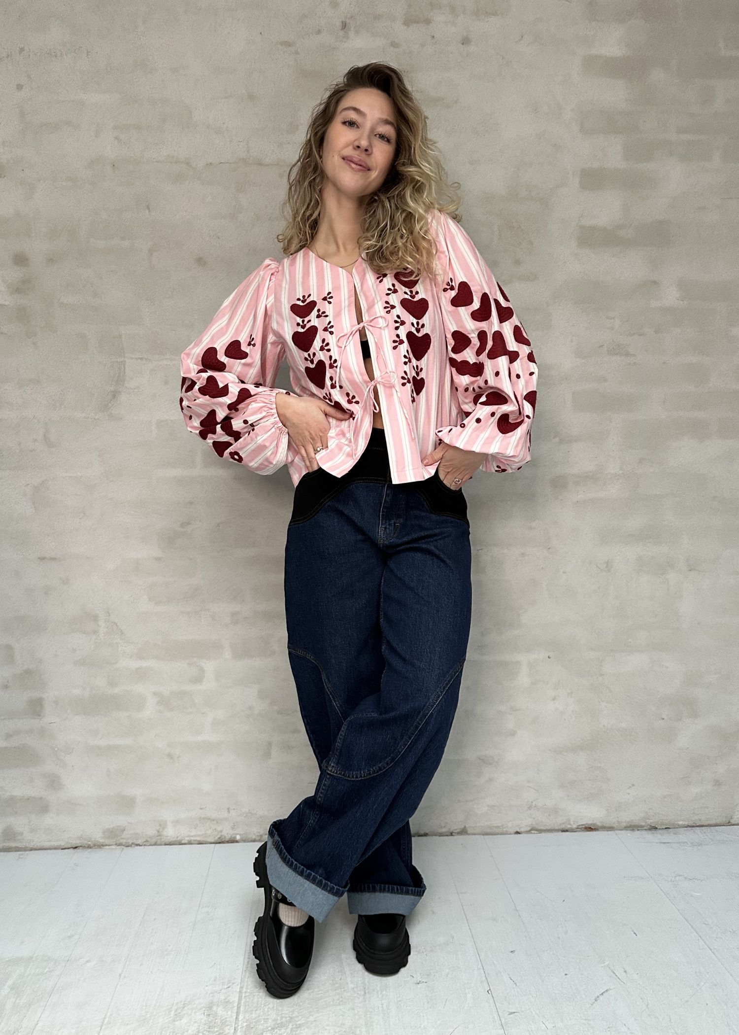 Elisabeth blusen fra Sissel Edelbo er en kort, feminin top fremstillet i 100% økologisk bomuld. Toppen har voluminøse ærmer med elastik indvendigt ved ærmeåbningerne. Den har en åben front og kan bindes med to sæt tynde bindebånd. Toppen er dekoreret med vores hjertebroderi, som er nænsomt placeret på forstykket samt på ærmerne.