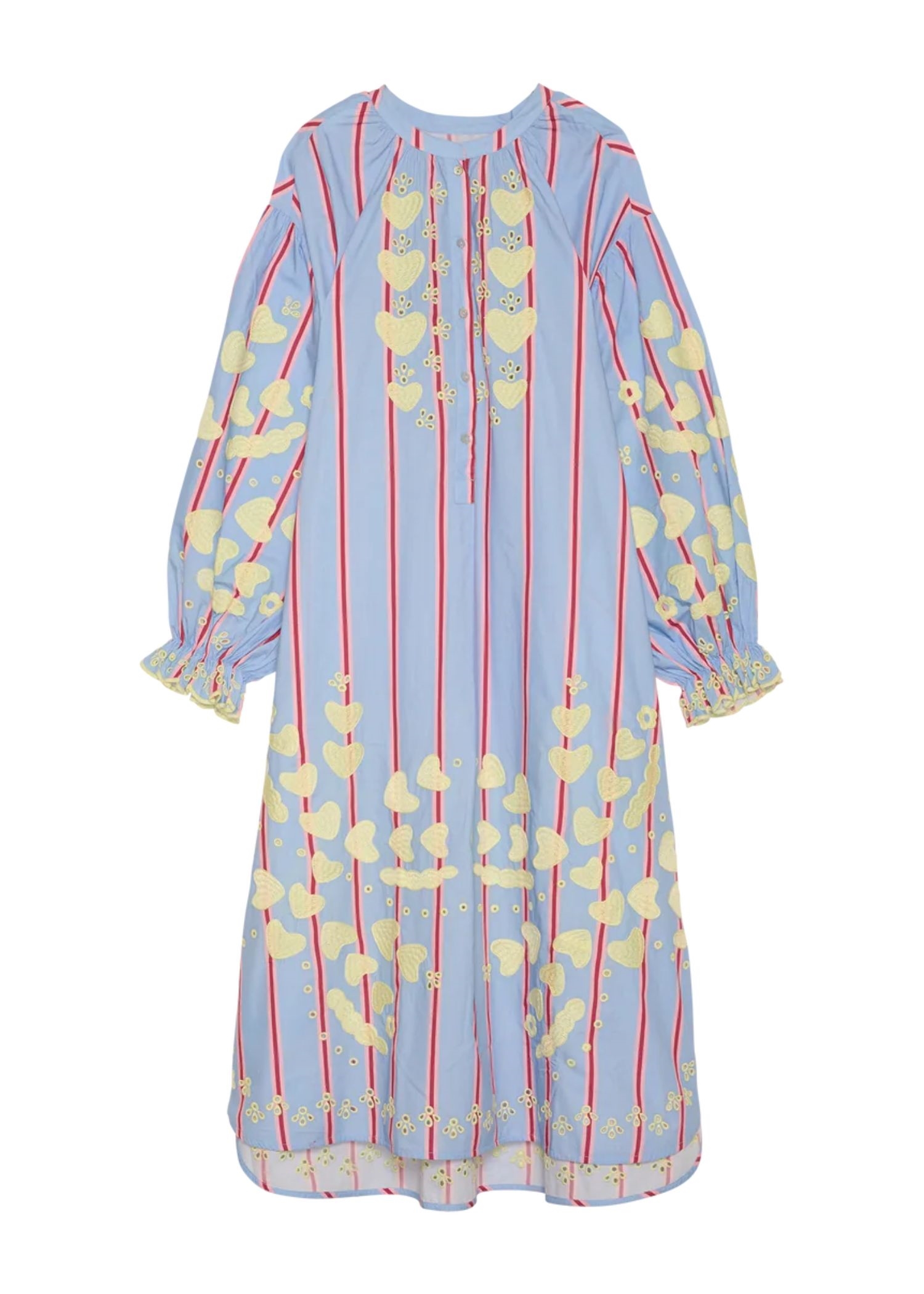 Elisabeth-kjolen fra Sissel Edelbo er en afslappet, men feminin kjole fremstillet i 100 % økologisk bomuldspoplin. Kjolen har sænkede skuldre og voluminøse ærmer med rynker og små manchetter ved ærmeåbningerne. Kraven har rynker omkring halsudskæringen, og perlemorsknapper er placeret på stolpelukningen foran. Der er lommer i sidesømmene. Kjolen er dekoreret med deres signatur-hjertebroderi, nænsomt placeret på brystet, ved kanten, på ærmeflæsen og nederst på kjolen.