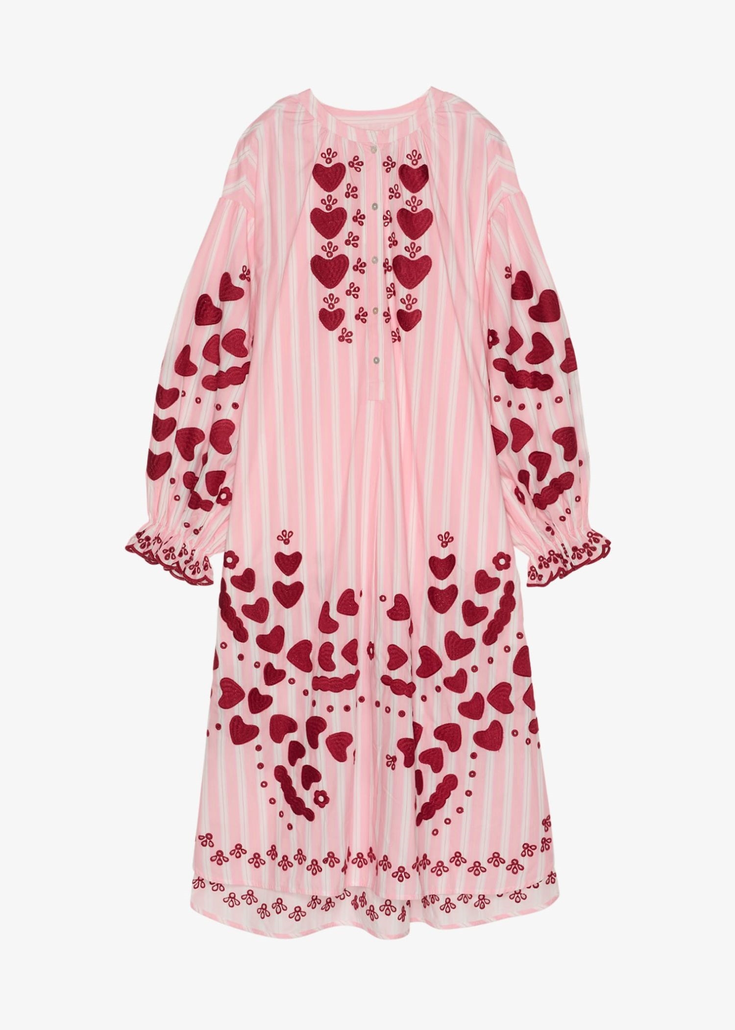 Kjolen er dekoreret med fine broderier, herunder vores signatur-hjertemotiv, som er placeret på brystet, ved kanten forneden, på ærmeflæsen samt nederst på kjolen.