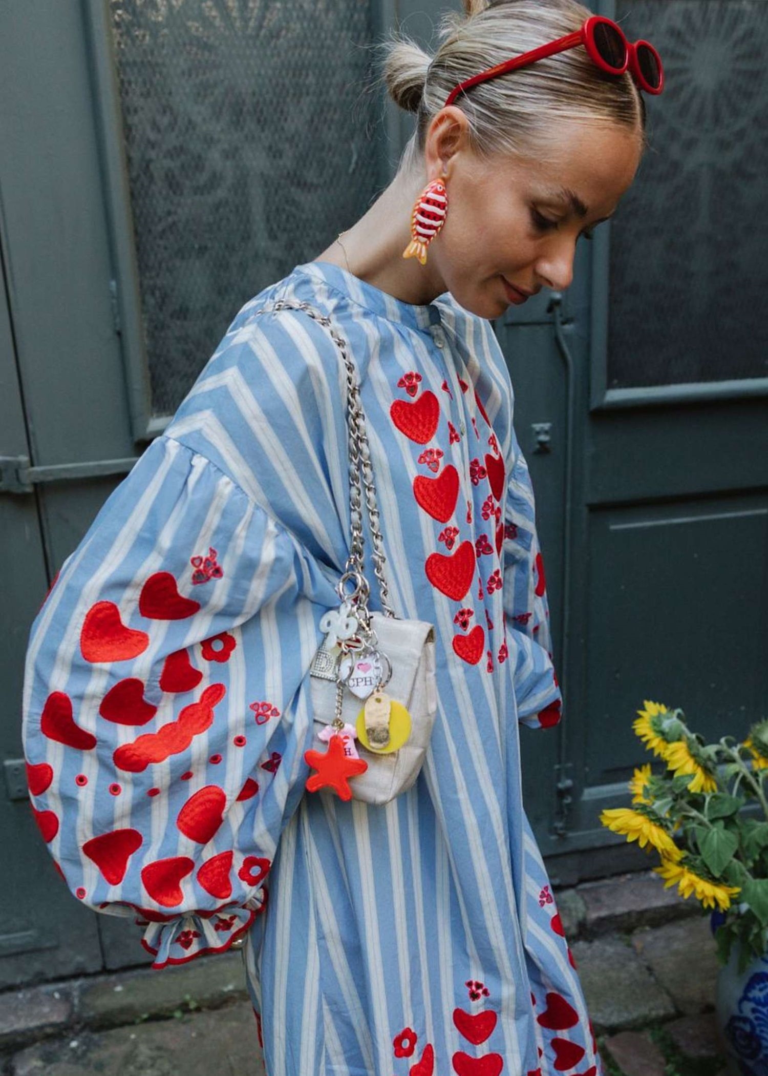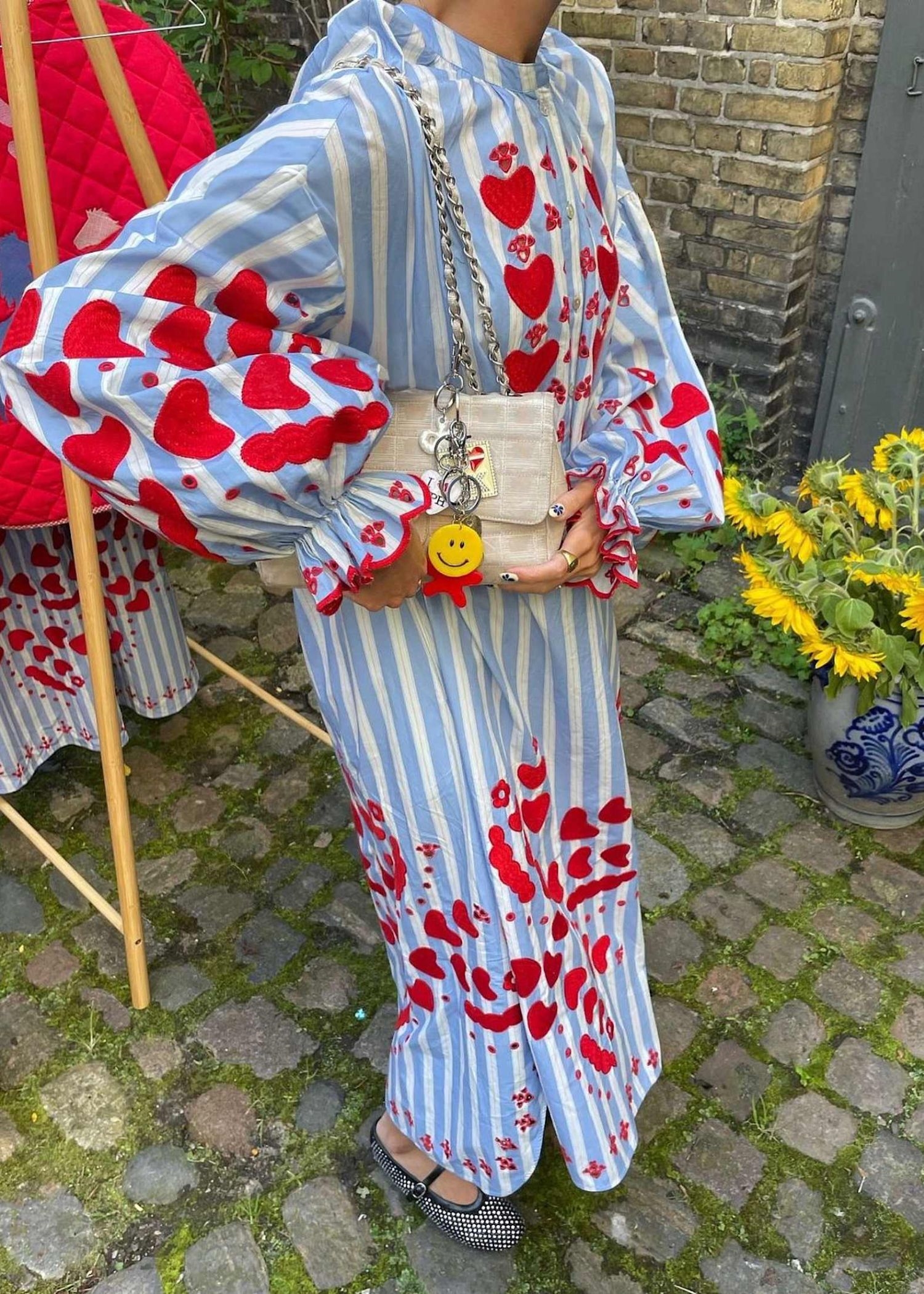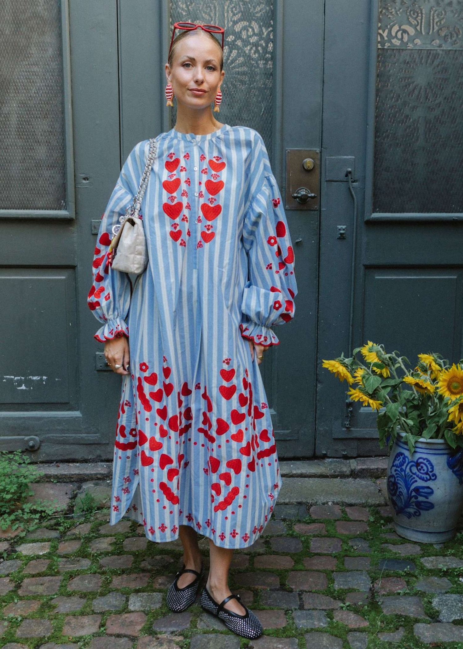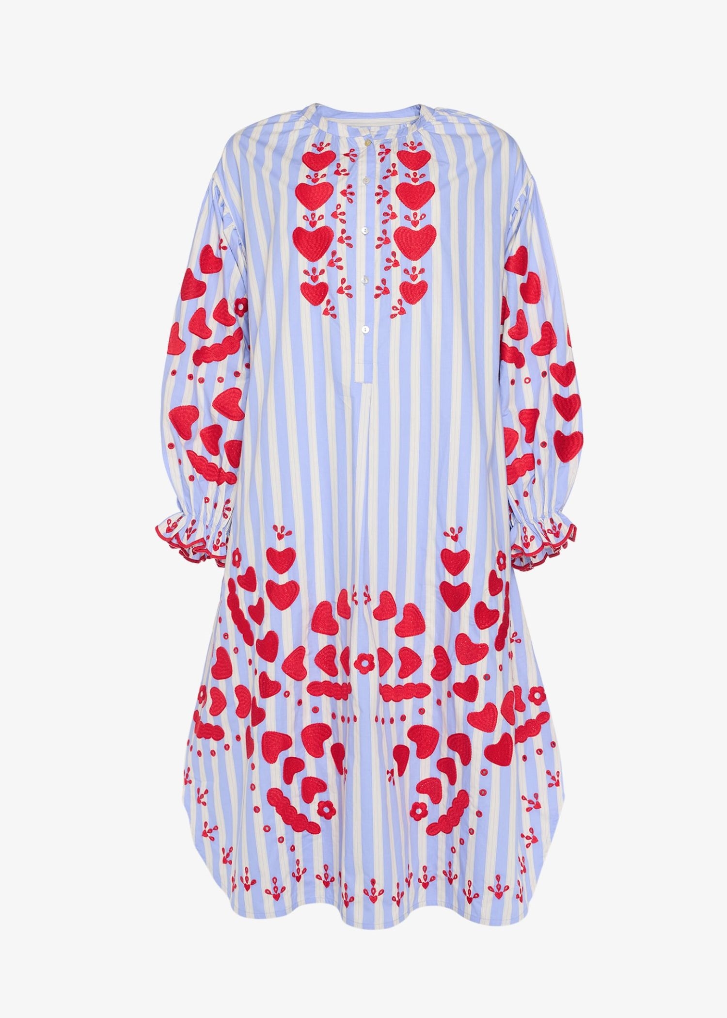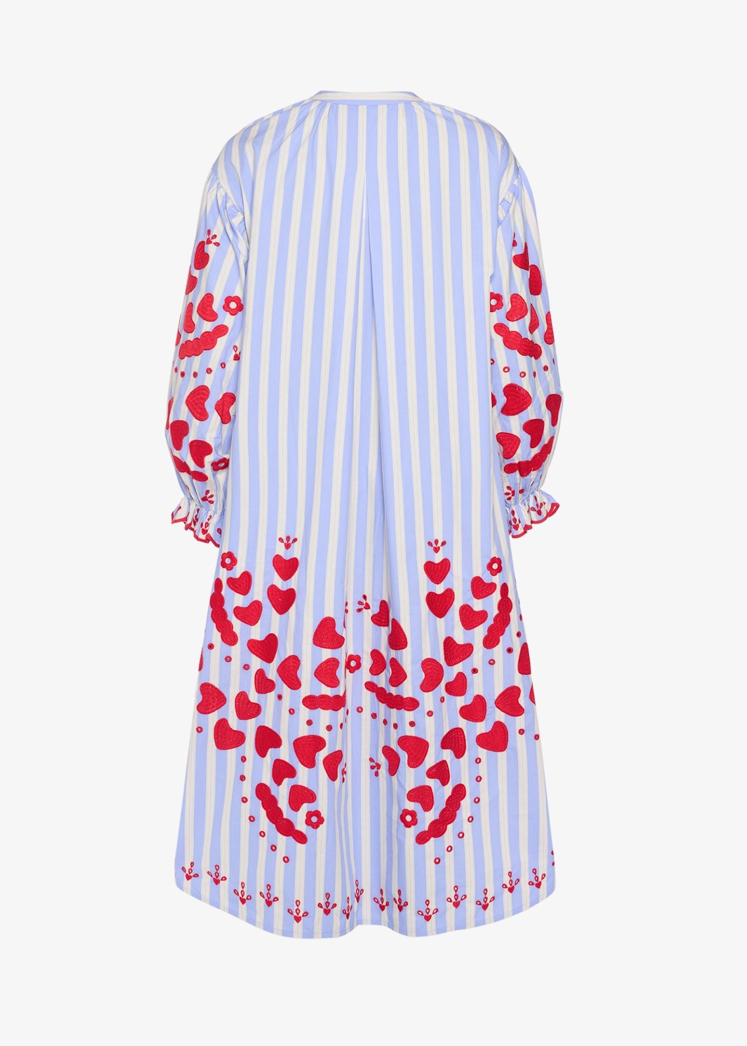Elisabeth Dress fra Sissel Edelbo er en afslappet, men feminin kjole fremstillet i 100% økologisk bomuldspoplin. Kjolen har sænkede skuldre med flæser langs ærmegabene. Den har voluminøse ærmer med rynker og små manchetter ved ærmeafslutningen. Kraven har rynker omkring halsudskæringen, og foran findes en stolpelukning med knapper i perlemor. I sidesømmene er der placeret lommer.Kjolen er dekoreret med vores karakteristiske hjertebroderi, som er nænsomt placeret på brystet, ved kanten forneden, på ærmeflæsen samt nederst på kjolen.