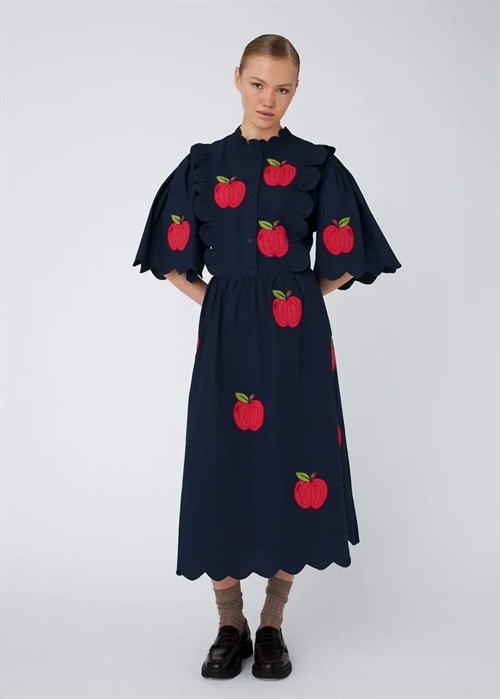Smuk navy midi kjole fra Stella Nova med påsyede røde æbler. Kjolen har flæsedetaljer, knaplukning i det øverste stykke, brede ærmer, samt bindebånd i taljen bagpå.