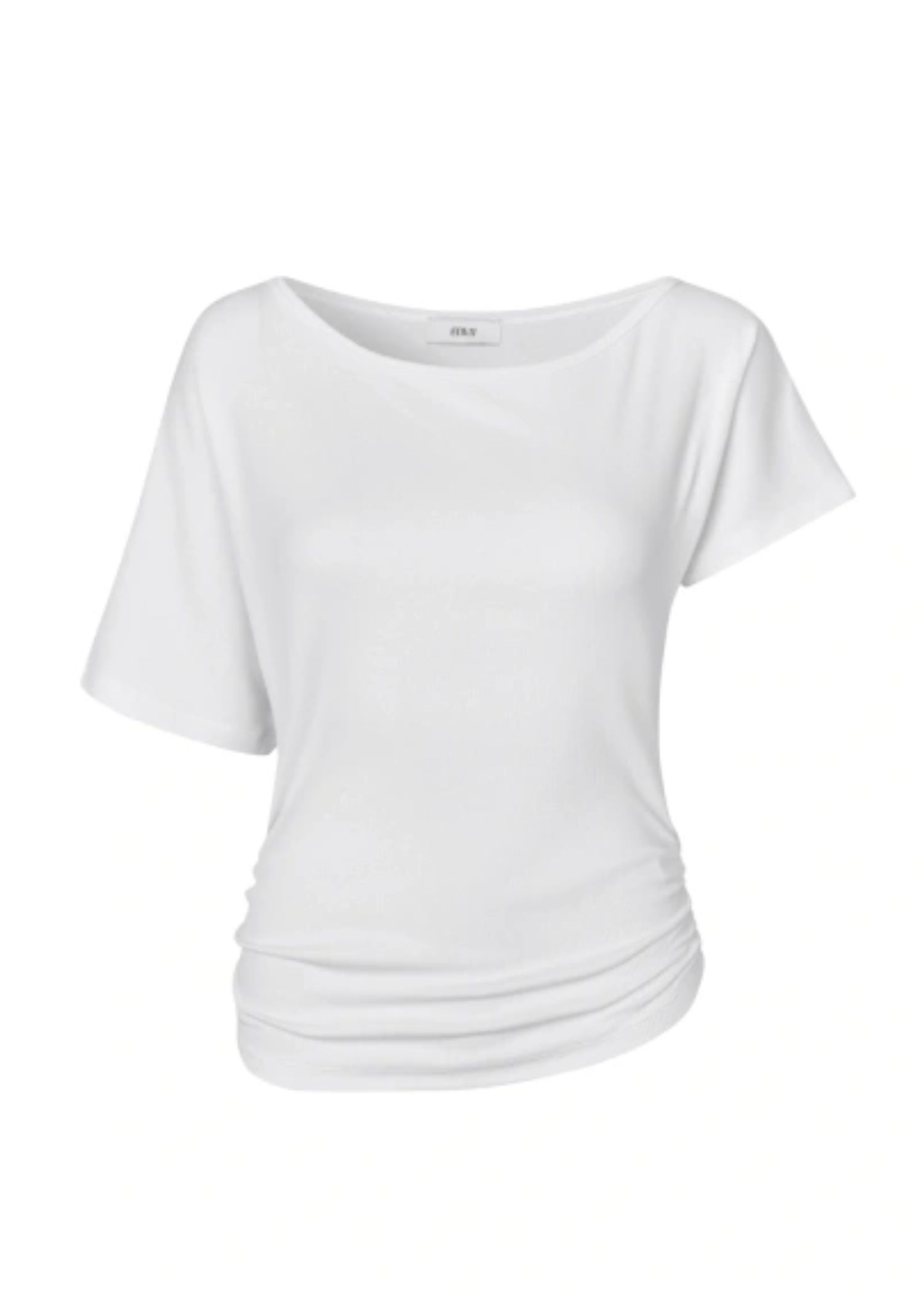 Hvid rib bluse fra Envii med bred halsudskæring, et kort ærme, et længere ærme, samt rynkedetaljer i siden.