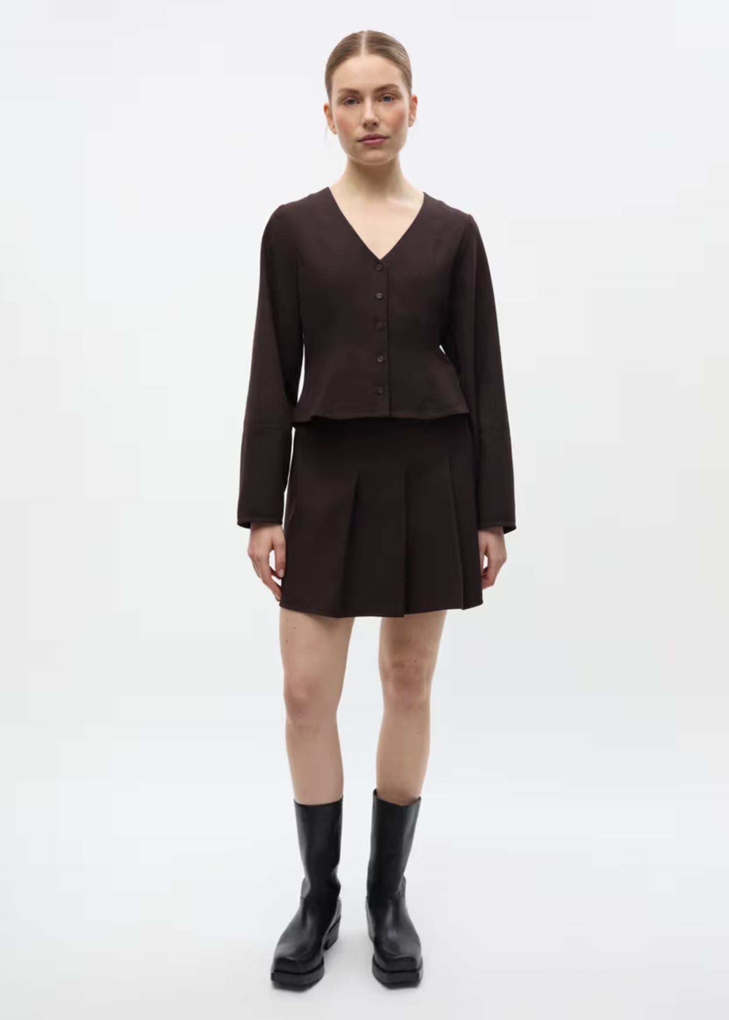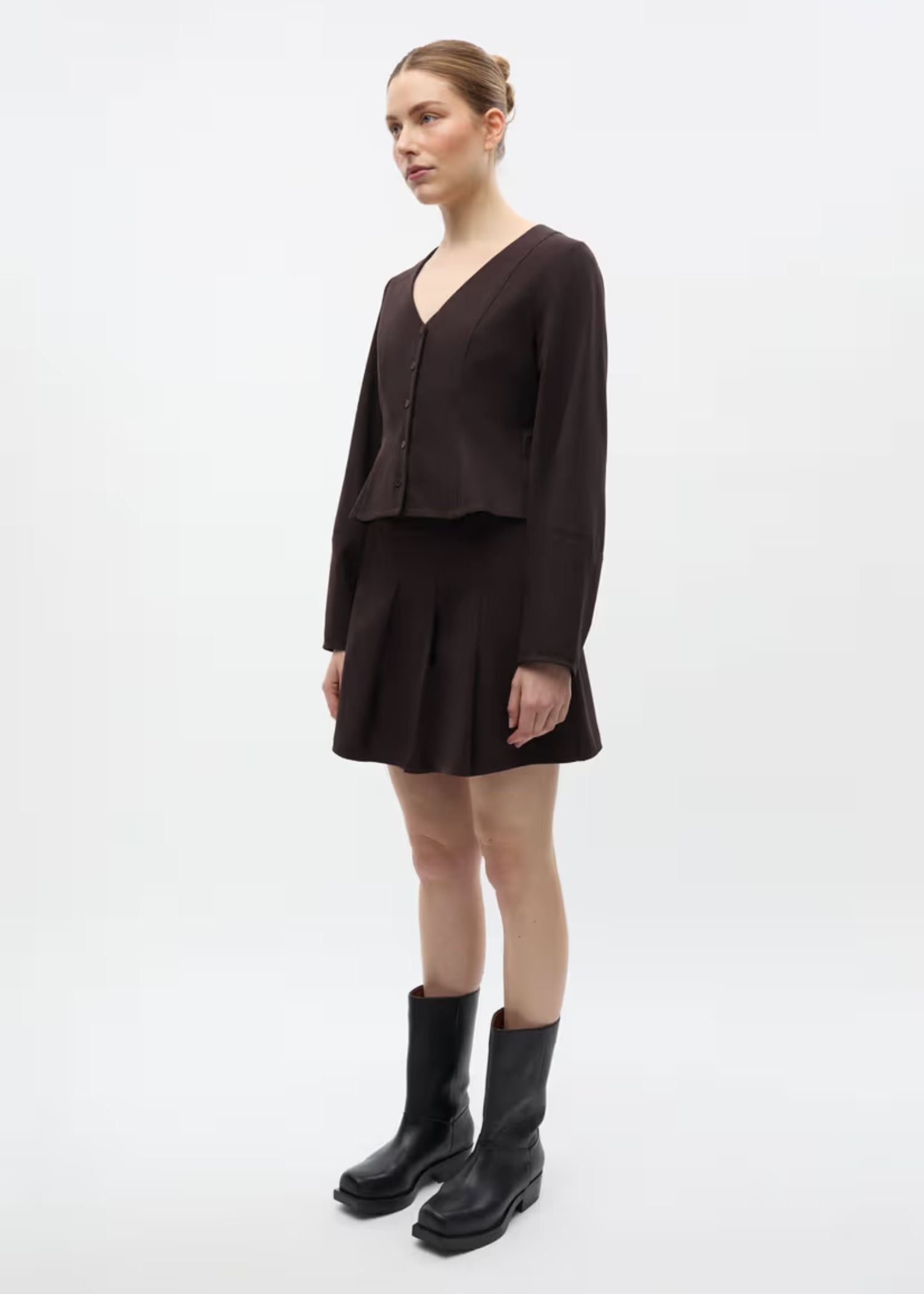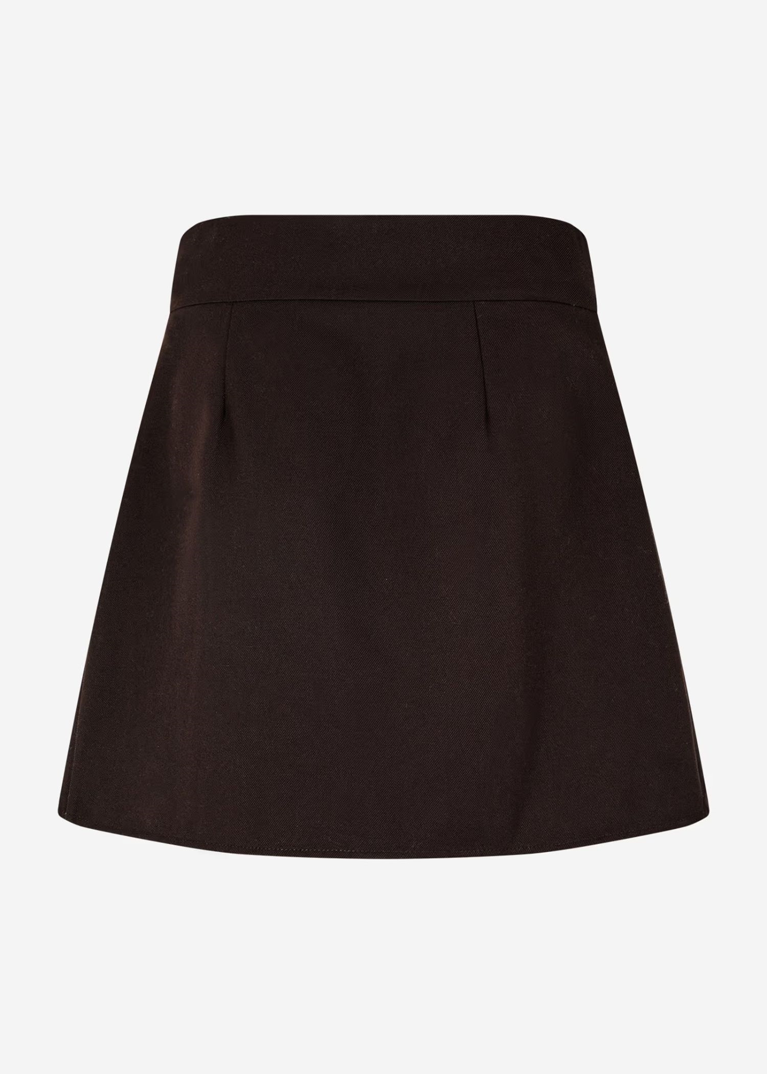 Kort mørkebrunt skirt med plisse læg foran, samt skjult lynlåslukning i den ene side.