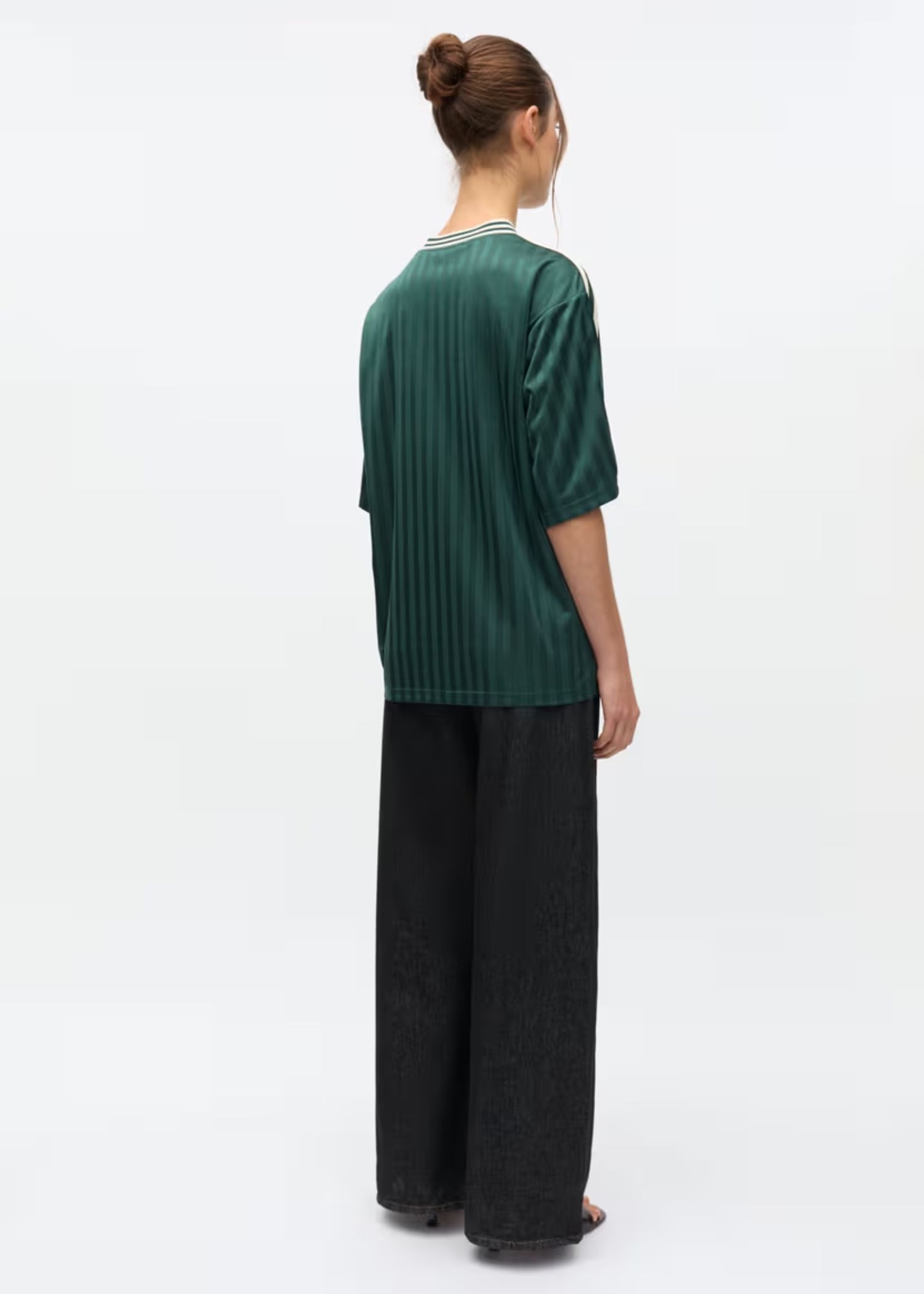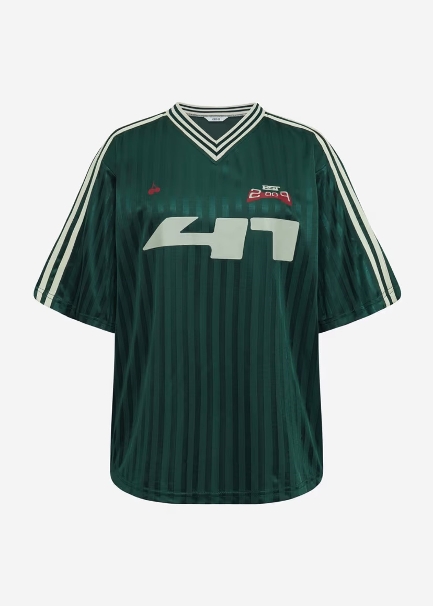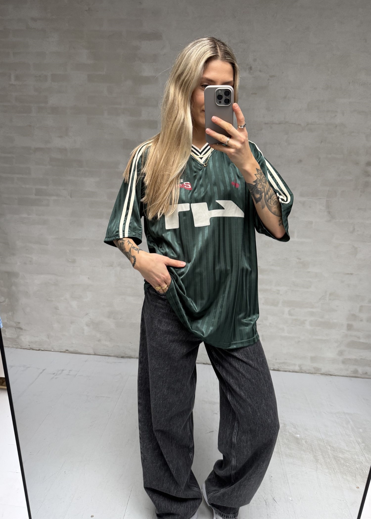 Mørkegrøn football tee fra Envii i en glat stribet let shiny polyester kvalitet med stribet ribkant i halsen, samt logo tryk på brystet.