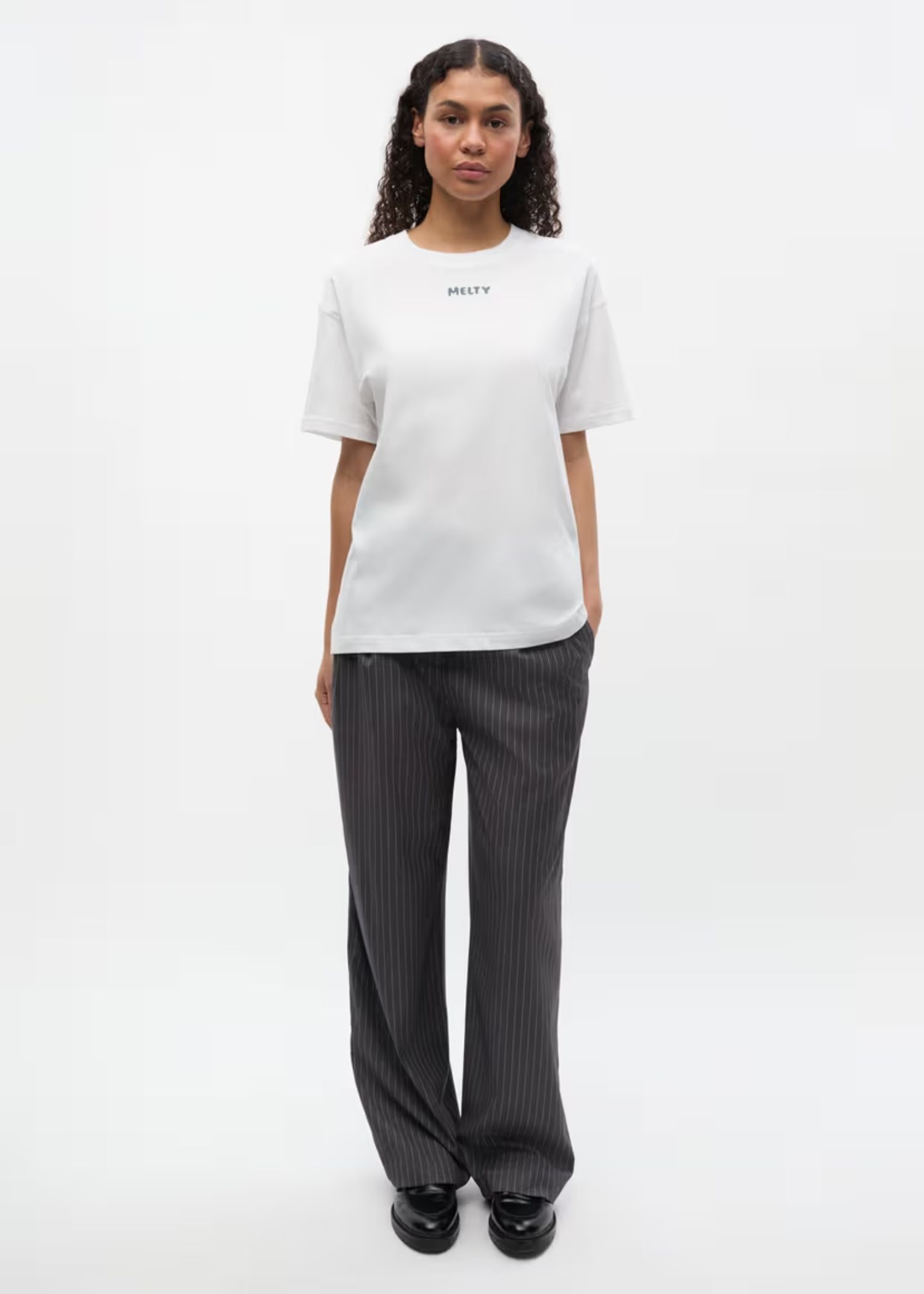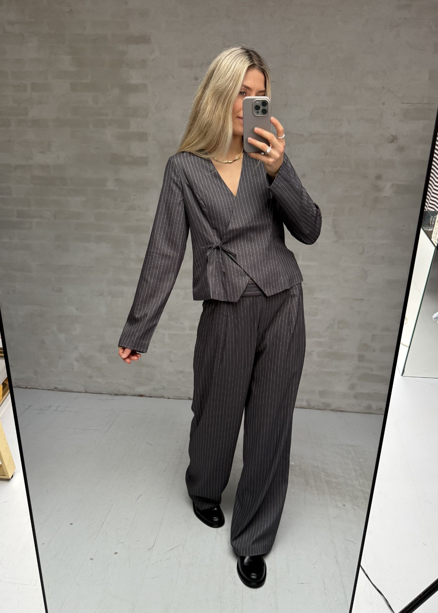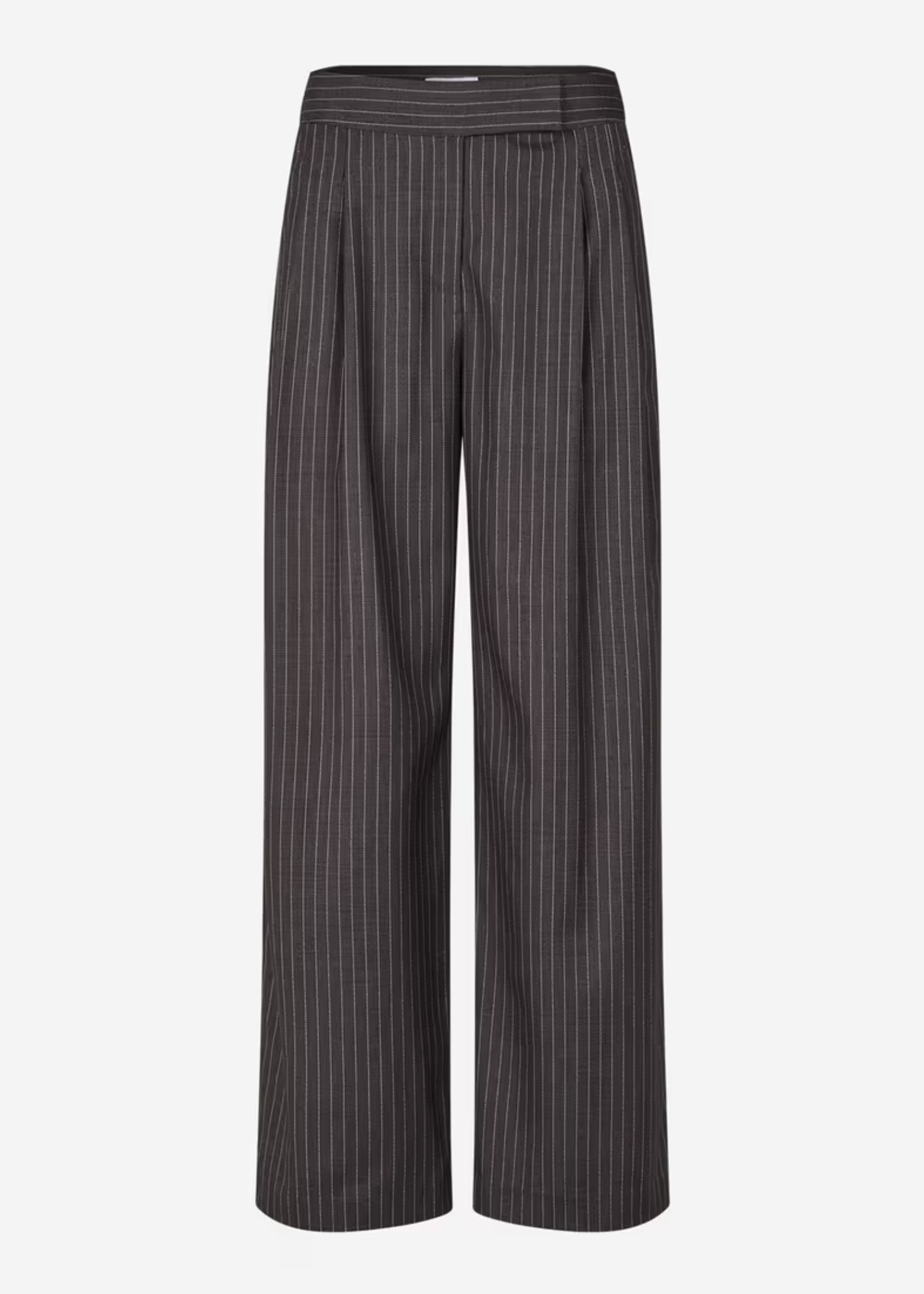 Koksgrå buks med nålestrib fra Envii i en blød polyester/viskose kvalitet med stretch. Buksen har brede lige ben, fast linning med skjult hægte/knap/lynlåslukning, skrå sidelommer, paspolerede baglommer.