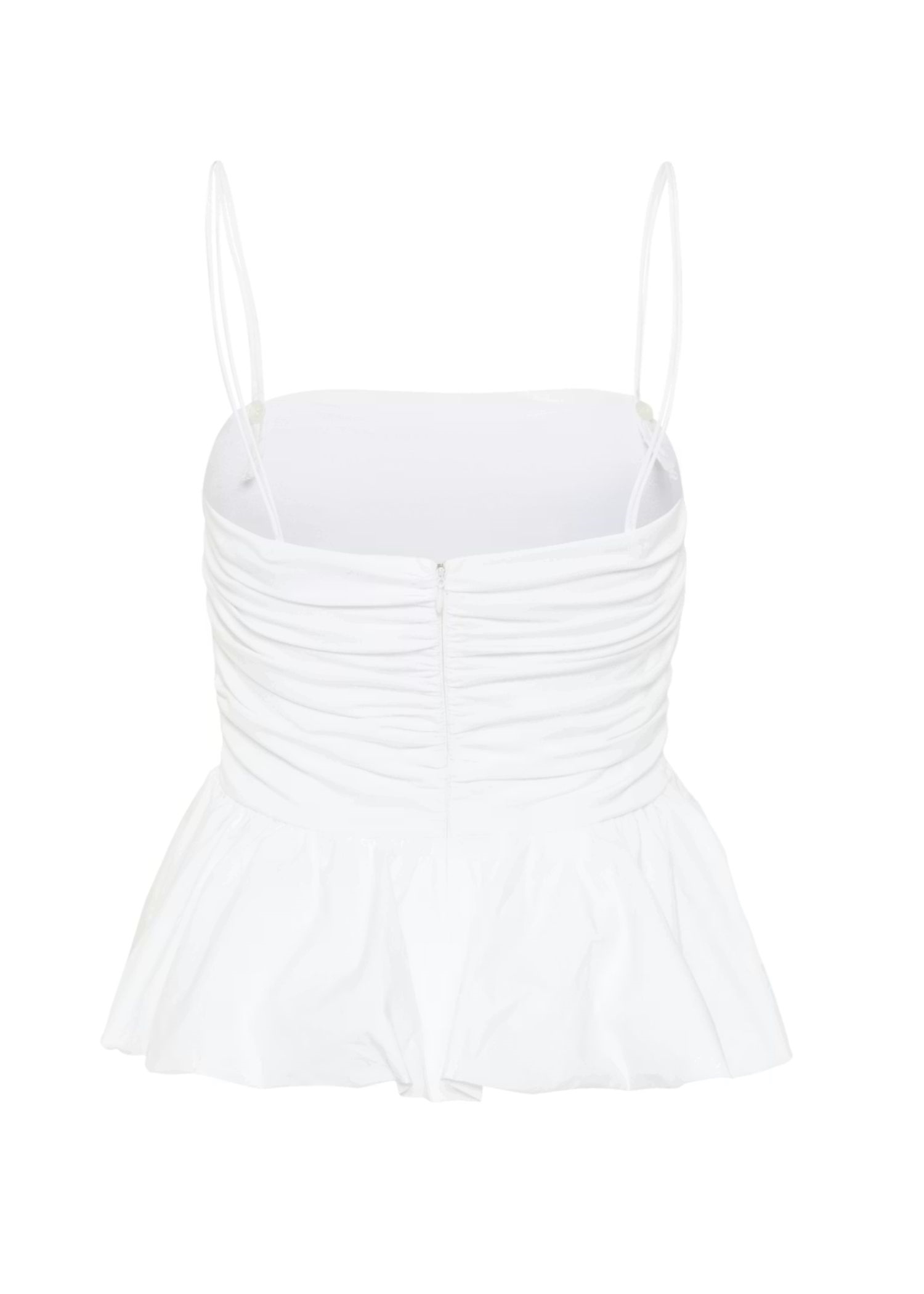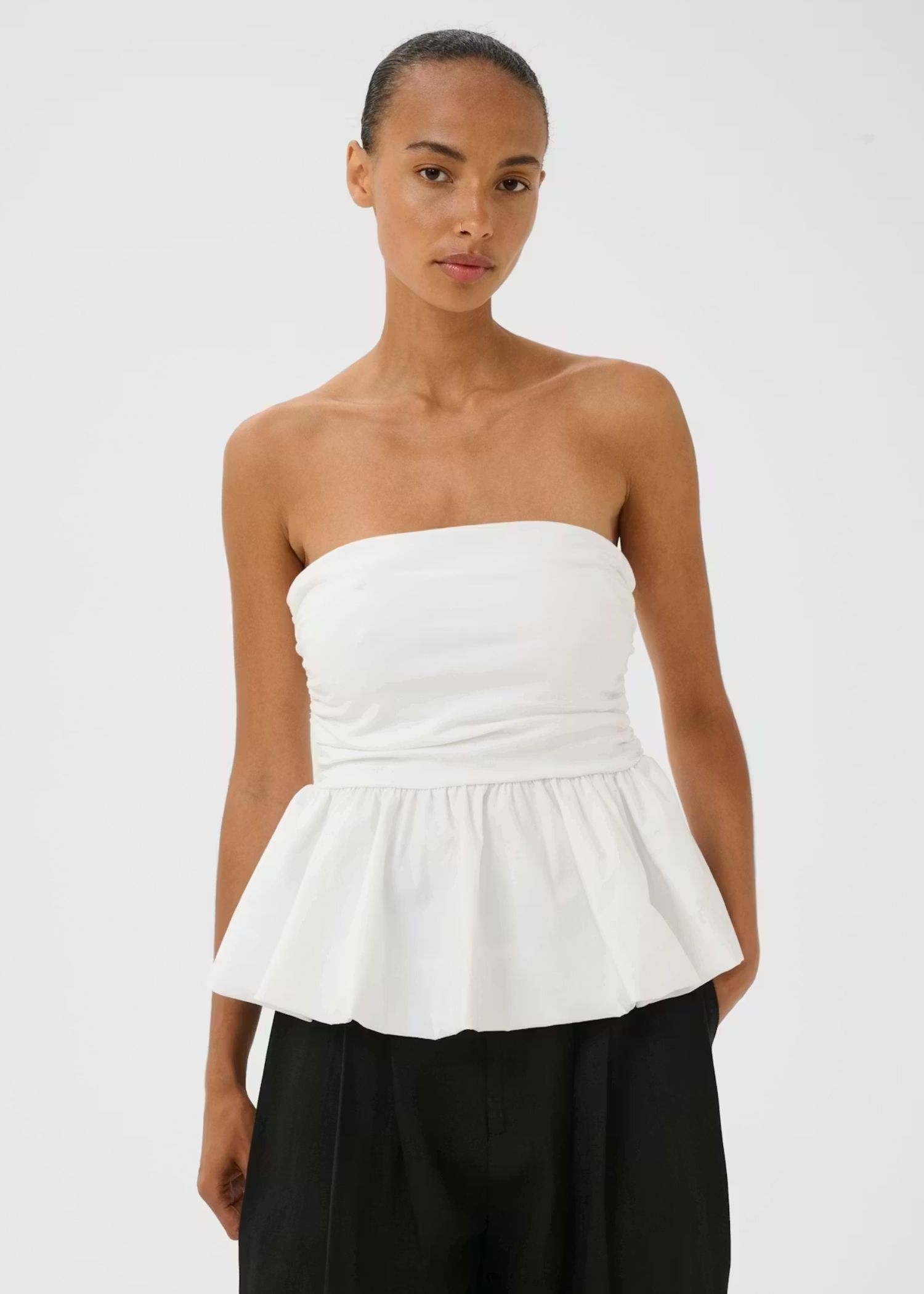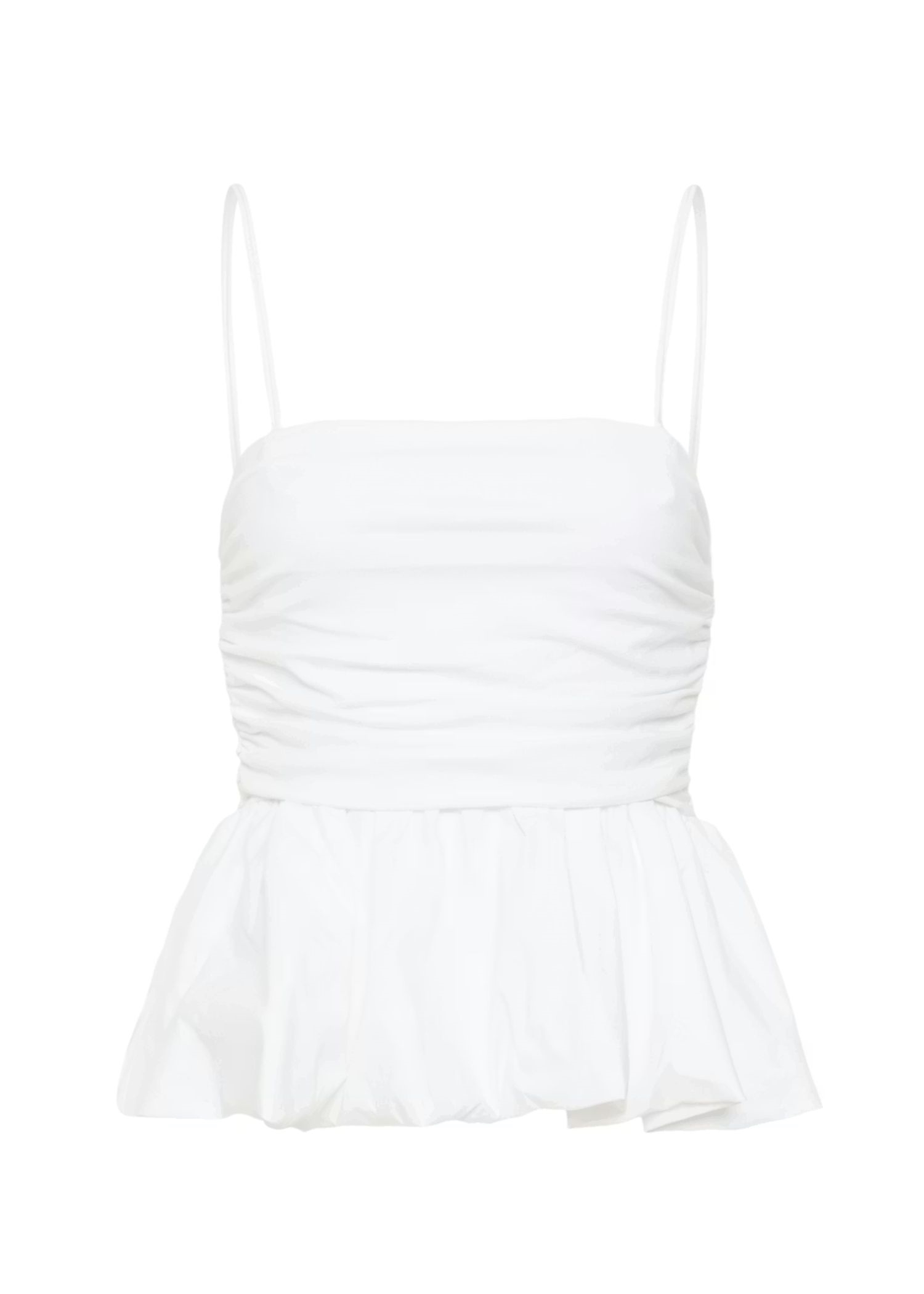Off White top fra Gestuz med rynket overdel og samlet peplum-nederste. Har smalle, aftagelige skulderstropper for variation. Tætsiddende snit og lige udskæring.