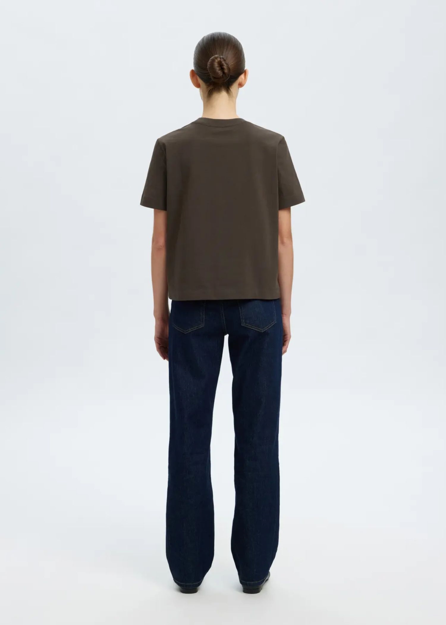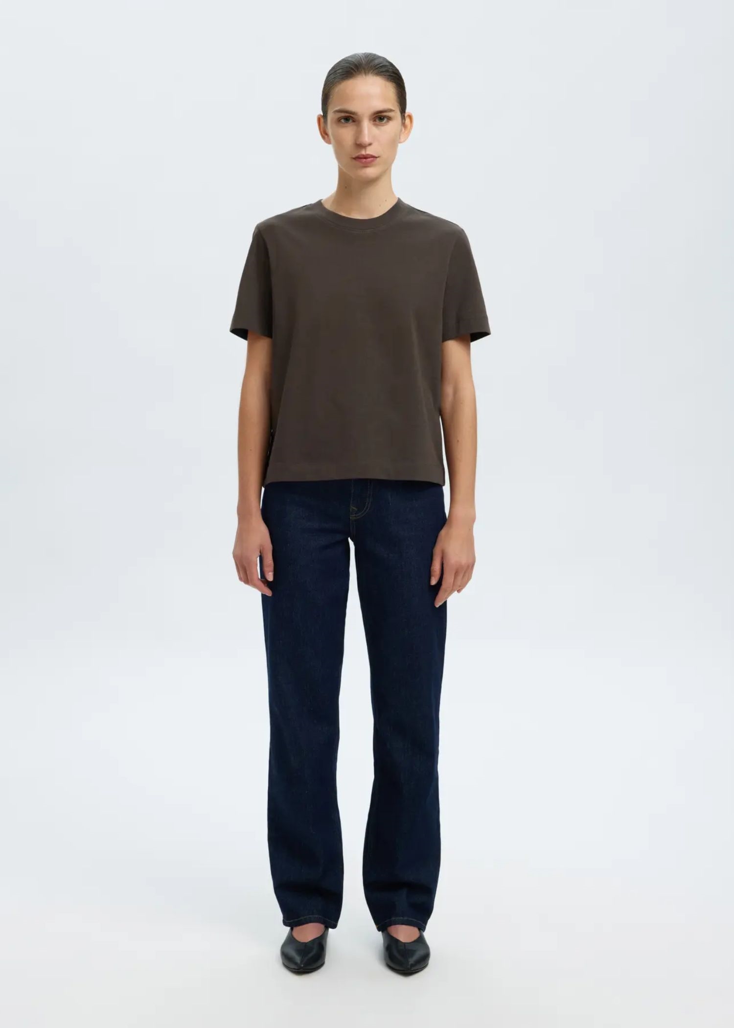 Klassisk mørkebrun t-shirt fra Selected Femme med en firkantet pasform, rund halsudskæring og korte ærmer.
