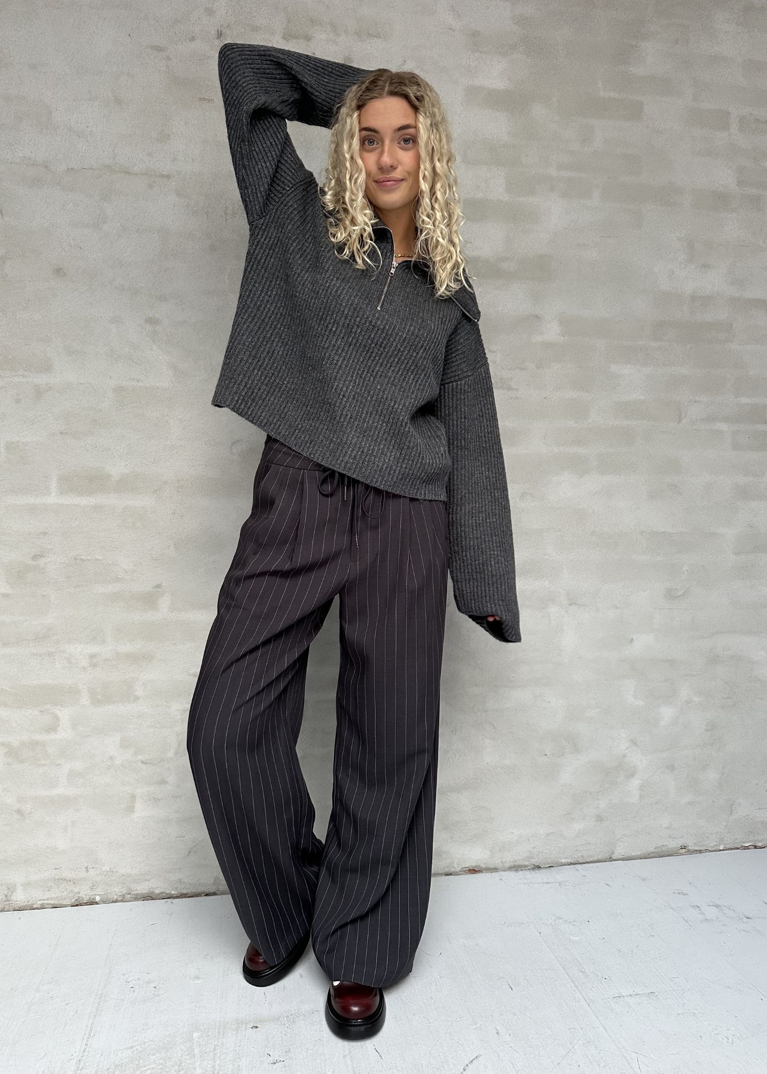 Koksgrå meleret strik fra Oval Square med høj krave med lynlås. Modellen er kort og bred med lange løse ærmer.