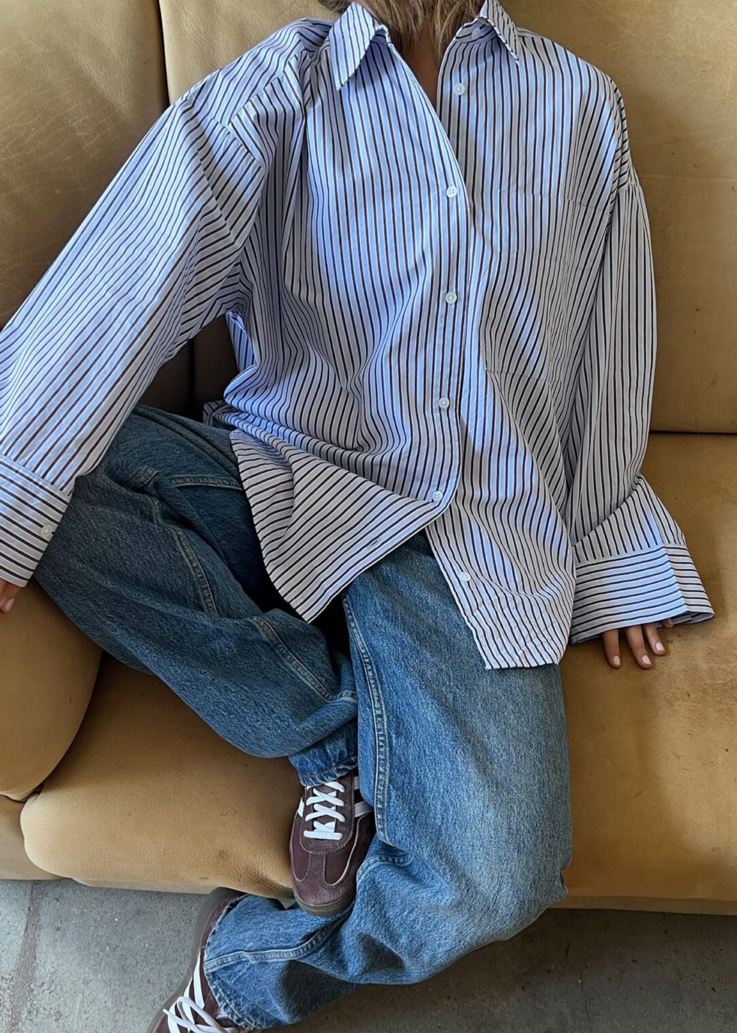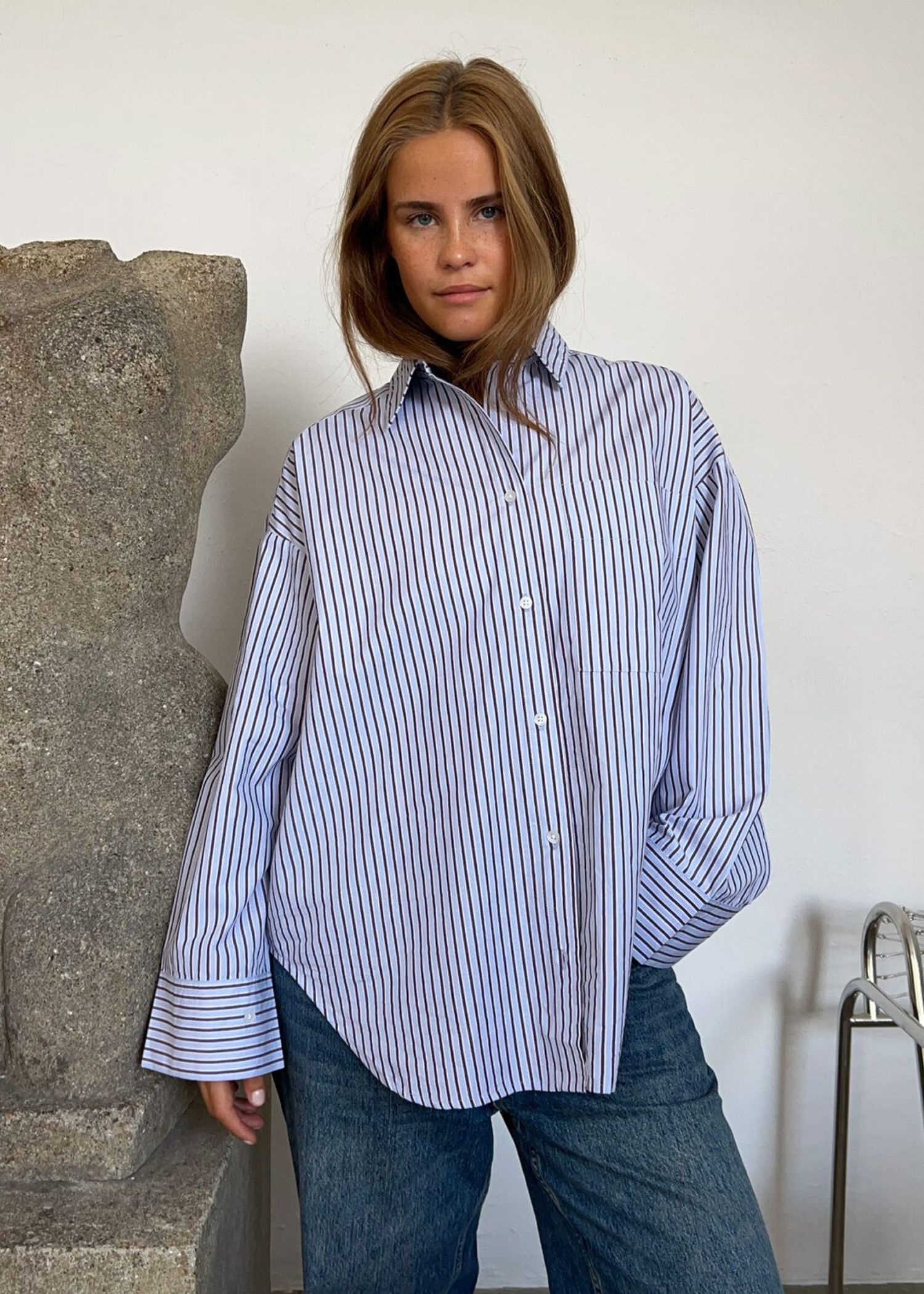 Blå/Bordeaux stribet oversize skjorte fra Boii Studios i 100% bomuld. Skjorten har knapper ned foran, ekstra længde bagpå og brede ærmer med 2 knapslukning, der kan justeres, så man selv kan vælge om man ønsker et smalt eller et bredt ærme.
