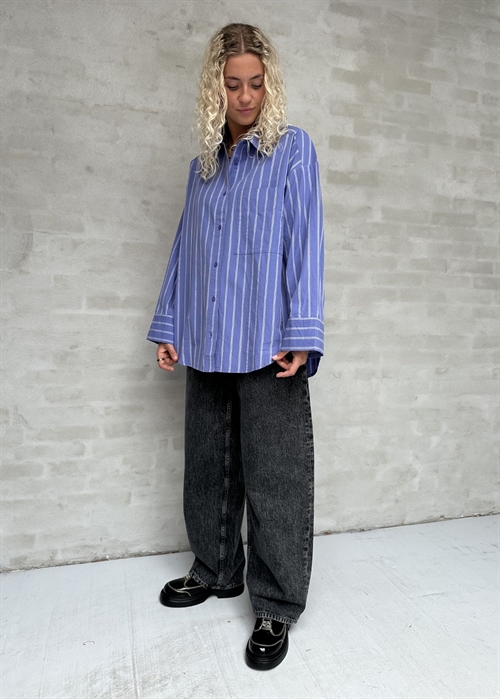 Lavendel stribet oversize skjorte fra Boii Studios i 100% bomuld. Skjorten har knapper ned foran, ekstra længde bagpå og brede ærmer med 2 knapslukning der kan justeres, så man selv kan vælge om man ønsker et smalt eller et bredt ærme.