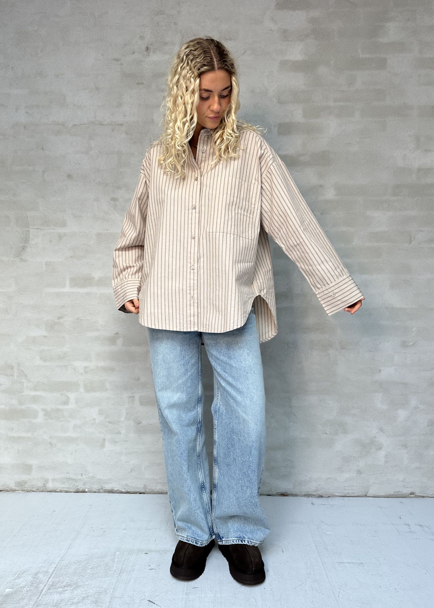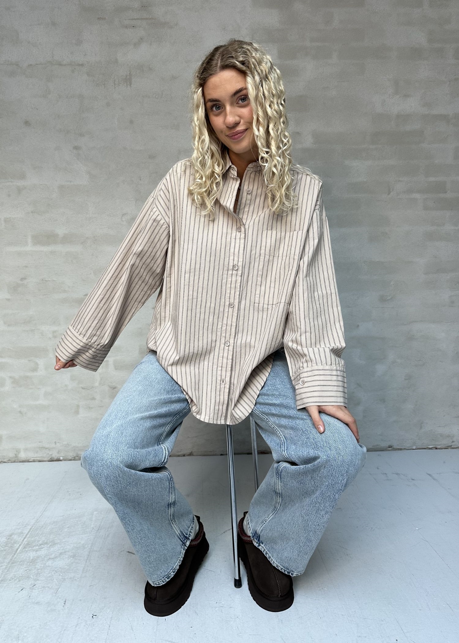 Sand/grå stribet oversize skjorte fra Boii Studios i 100% bomuld. Skjorten har knapper ned foran, ekstra længde bagpå og brede ærmer med 2 knapslukning der kan justeres, så man selv kan vælge om man ønsker et smalt eller et bredt ærme.