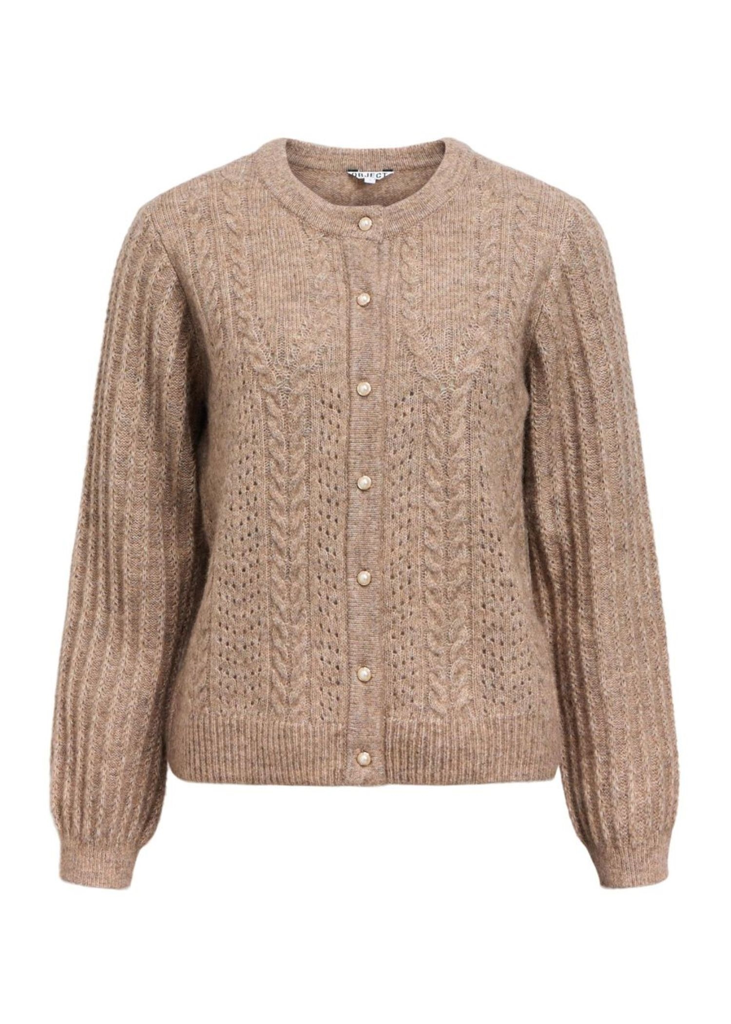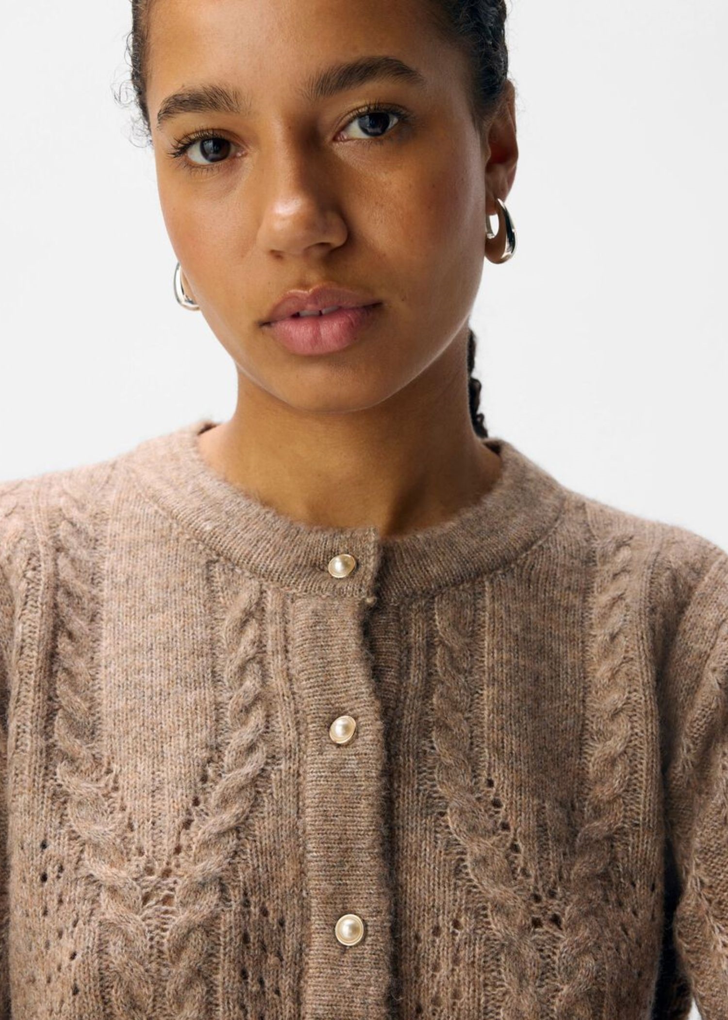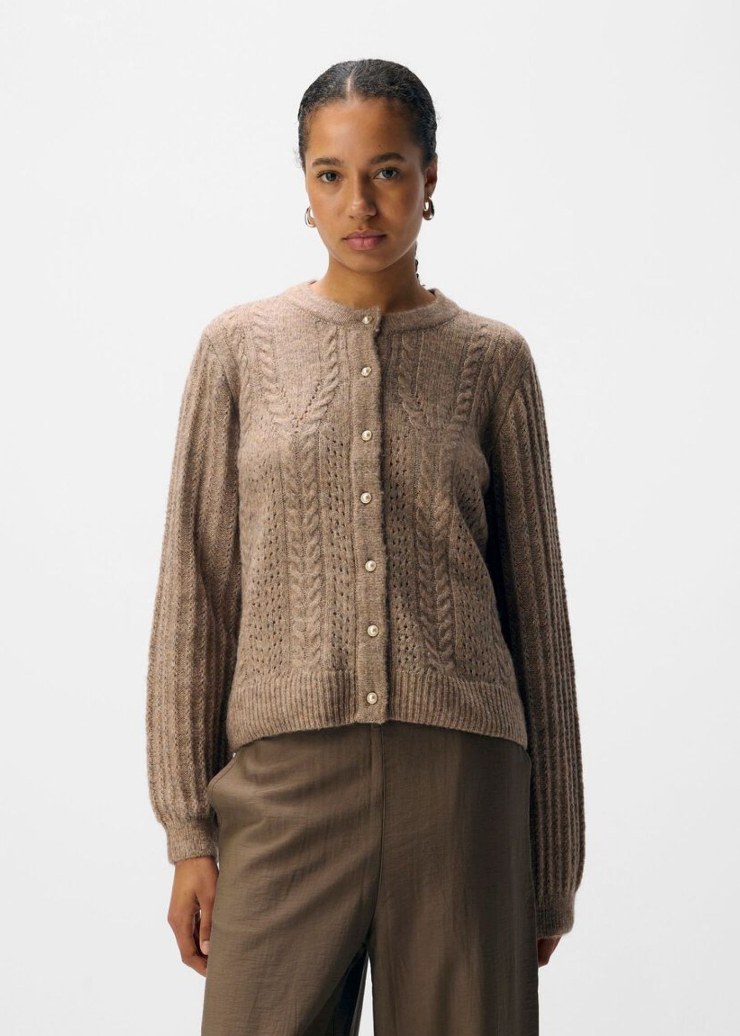 Sand meleret strik cardigan fra Object med kabel/hul mønster, ange ærmer, samt knaplukning ned foran med smukke perlemorsknapper.
