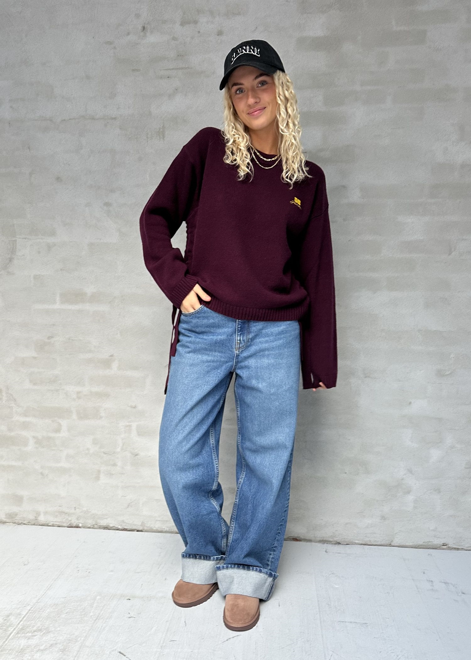 Bordeaux strik fra Ganni med rund hals, ribbede kanter, lyseblåt GANNI-logo på brystet og bindedetaljer i siderne.