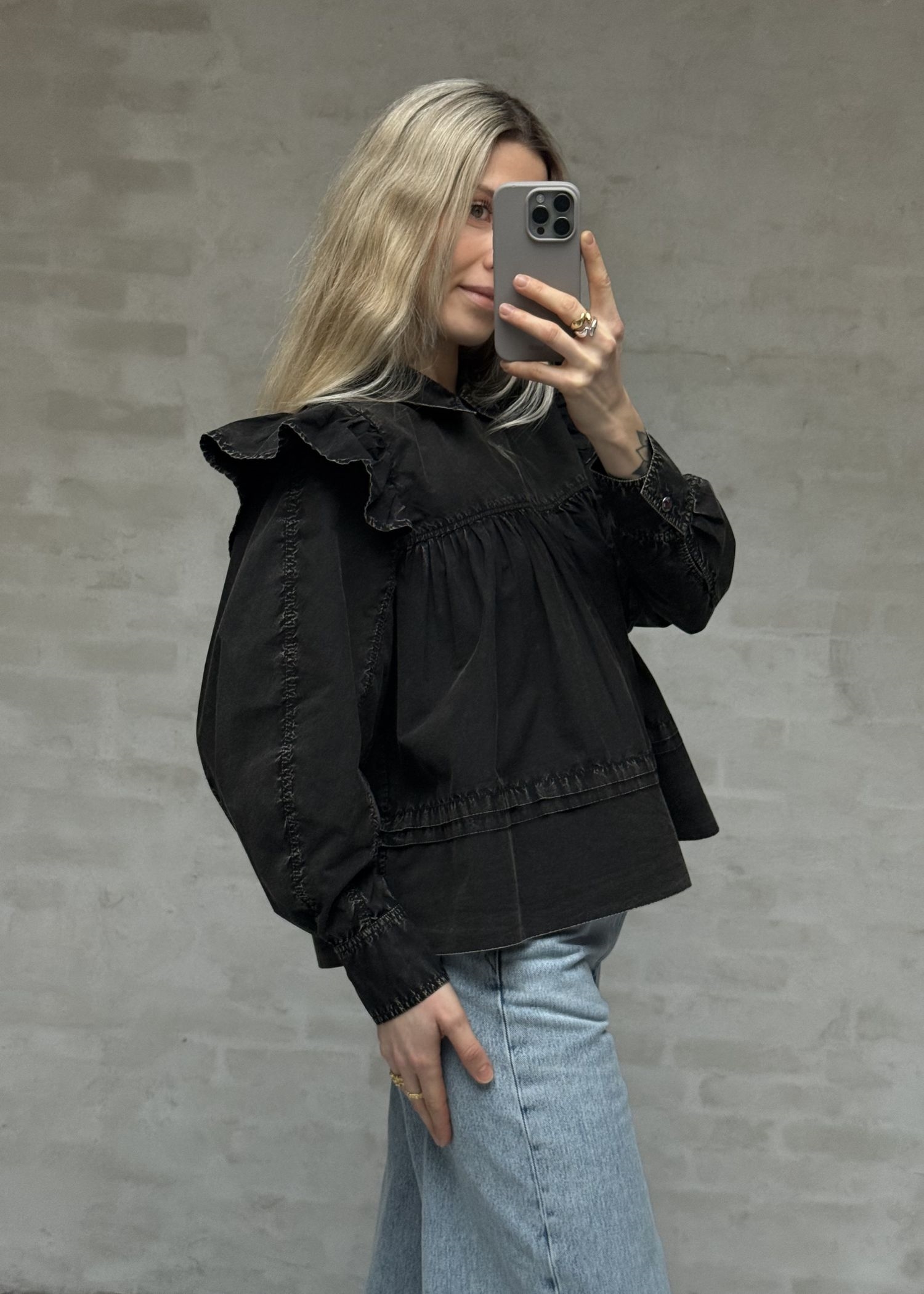 Garment dyed cotton frill bluse Black A1040061 Ganni
