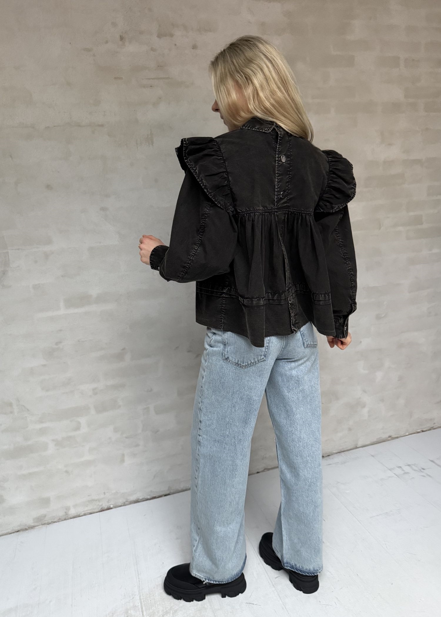 Sort denim skjorte fra Ganni har klassisk krave og lange ærmer med flæser og manchetter. Blusen har knaplukning på ryggen.