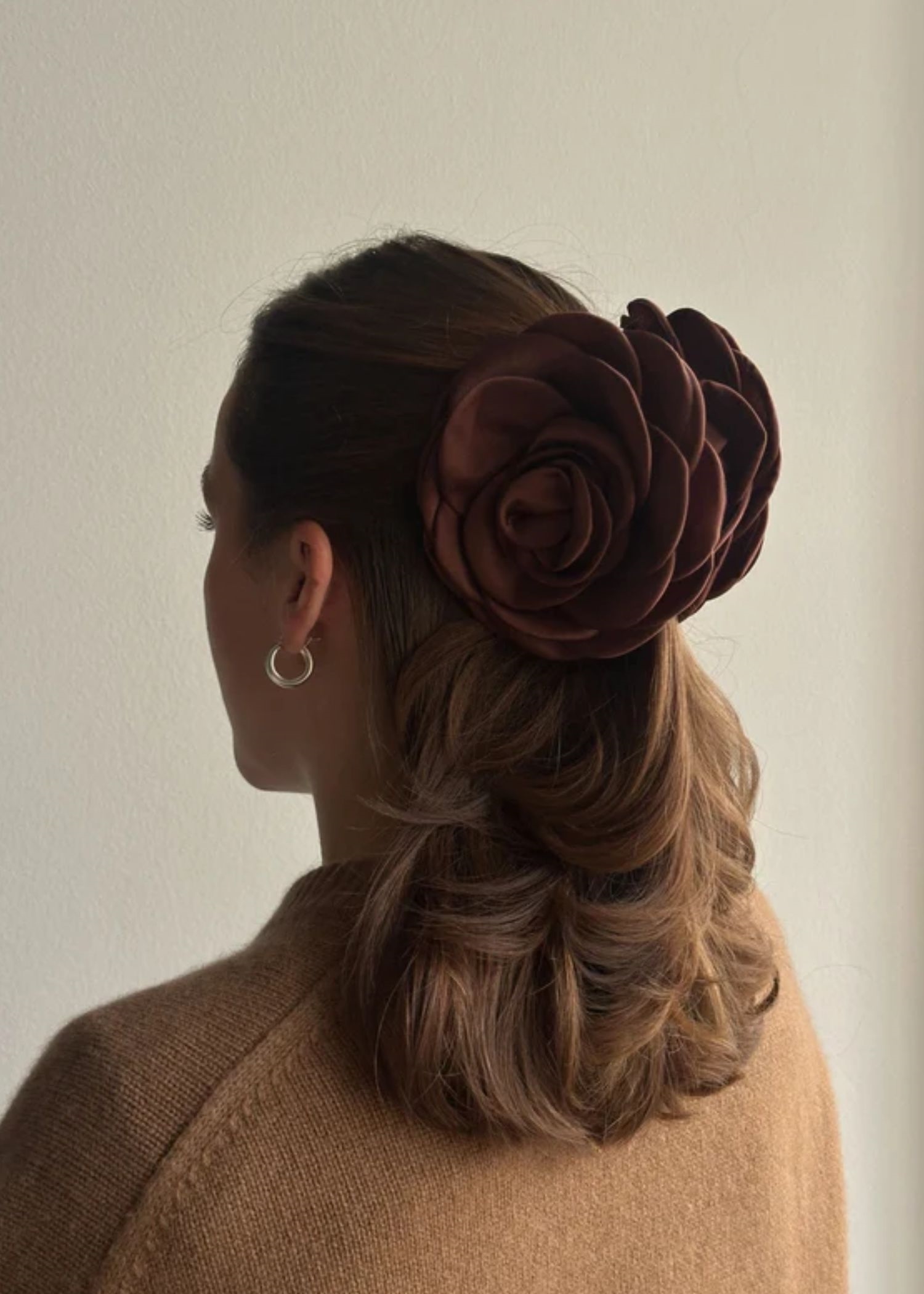 Giant Satin Rose klemme fra Pico i Chocolate - en ny chic hårklemme til at pift dit outfit op.