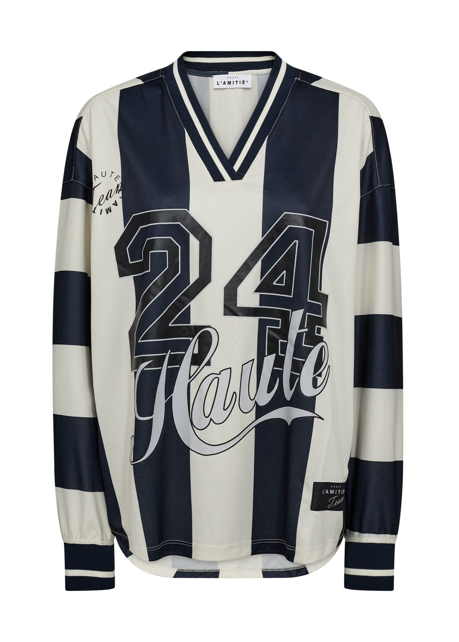 Cool navy/off white stribet football bluse fra haute L'Amitie i en glat let shiny polyesterkvalitet med print både for og bag. Blusen har v-hals + lange ærmer med elastikribkant.